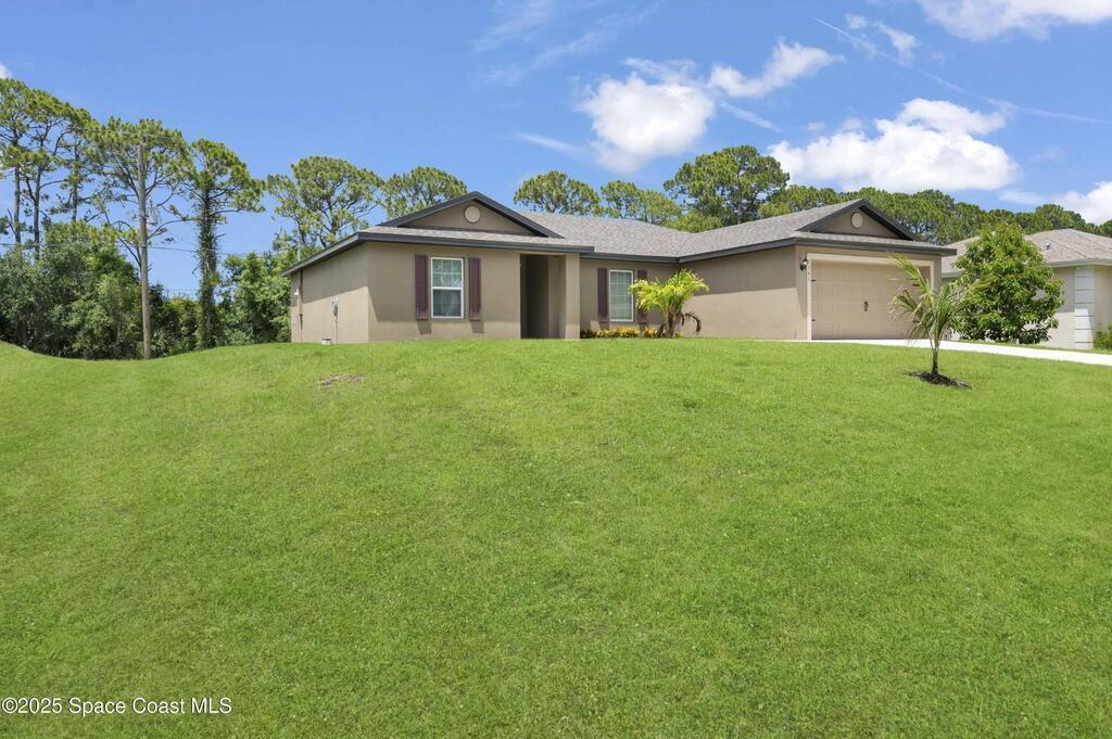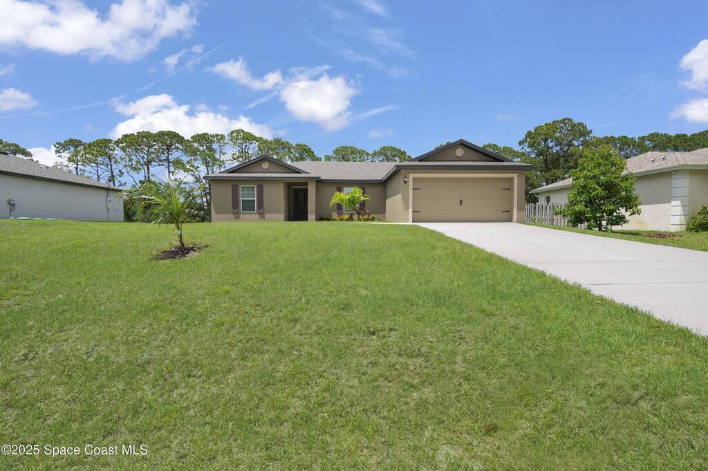 Ask us about our incentives, builder paid closing costs, & no down payment options! This beautiful, 3-bedroom, 2-bath home comes with over $10,000 in upgrades. These include all new energy-efficient Whirlpool(r) appliances, spacious countertops, stunning wood cabinets and an attached two car garage. The Caladesi at Palm Bay showcases a master suite complete with a sizable walk-in closet. This home is enhanced with a stunning covered entryway and front yard landscaping for incredible curb appeal. In addition, Palm Bay offers residents a premier location with convenient access to nearby shopping, golf courses, world-class area beaches and amenity-packed parks. This home is located near other new builds on a quiet street and is just minutes to get to I-95. **appliance models are subject to availability**