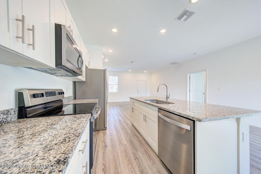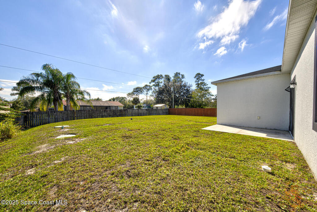 BRIGHT, SUNNY, CLEAN, NEWER! 2023-Built Home with Modern Features and BUILDERS WARRANTY! This stunning 4 bdr. home is packed with amazing features and designed for comfortable living. HURRICANE IMPACT WINDOWS and LUXURY VINYL FLOORING throughout (no carpet!), the home is as DURABLE as it is STYLISH. The kitchen has 42-inch white cabinets, GRANITE countertops, a spacious breakfast bar, and SS appliances including the refrigerator. Inviting master suite offers 2 separate walk-in closets, the oversized master bathroom includes a separate tub and shower with easy accessibility for a HANDICAPED individual. The split floor plan ensures privacy, with 3 additional bdrs on the opposite side of the home. Step outside through the sliding glass doors to a massive, partially fenced backyard. The extended driveway provides ample parking, complementing the clean, ready-to-use two-car garage. House is located in a quiet welcoming neighborhood! Just 30 min to our fun BEACHES! NO HOA, MOVE IN READY