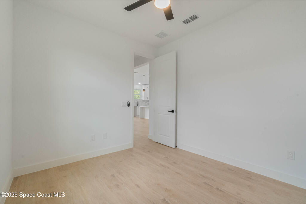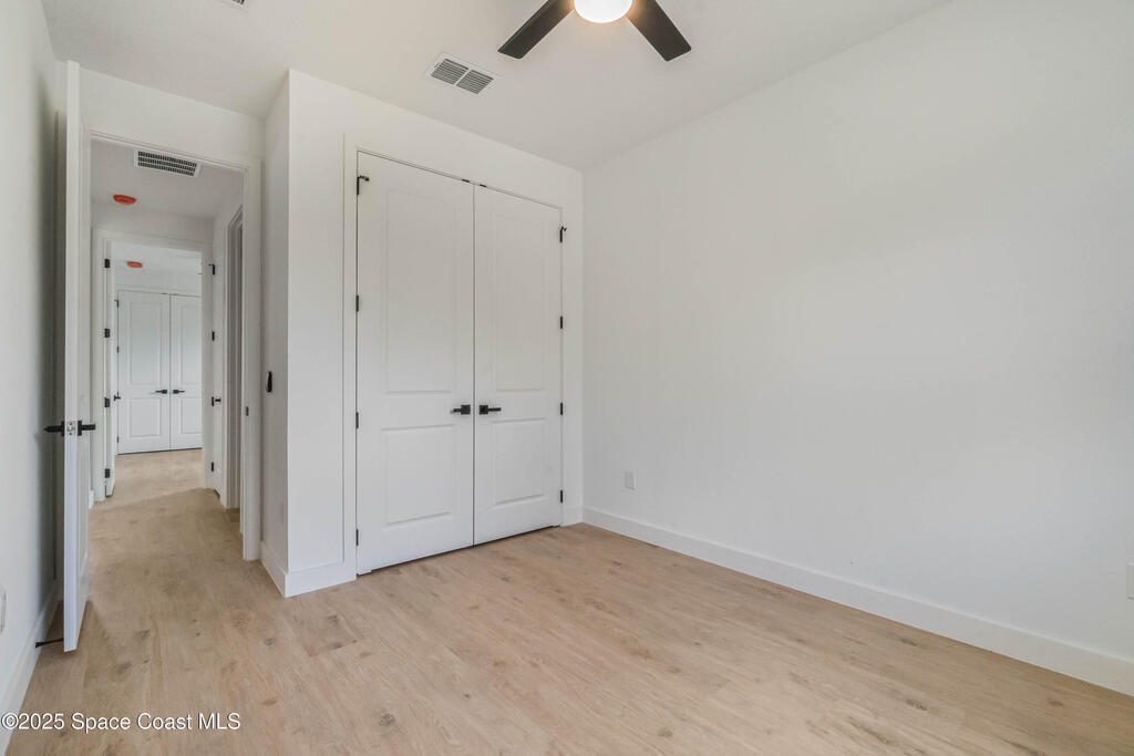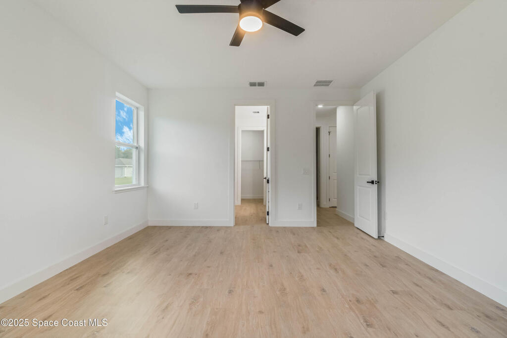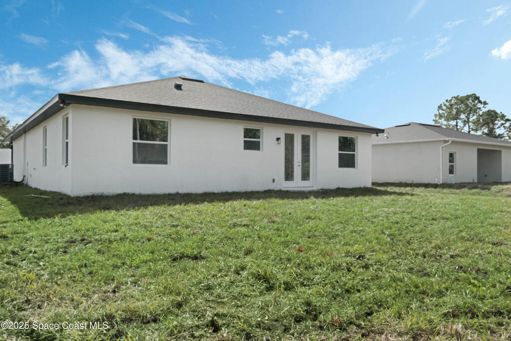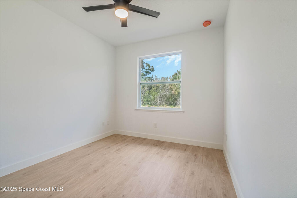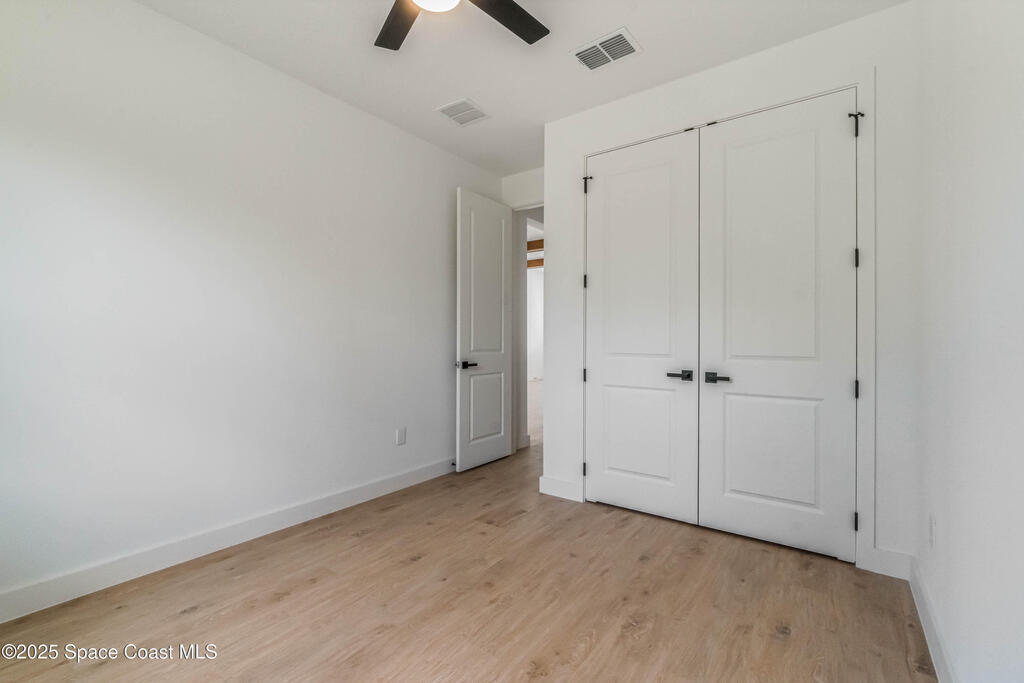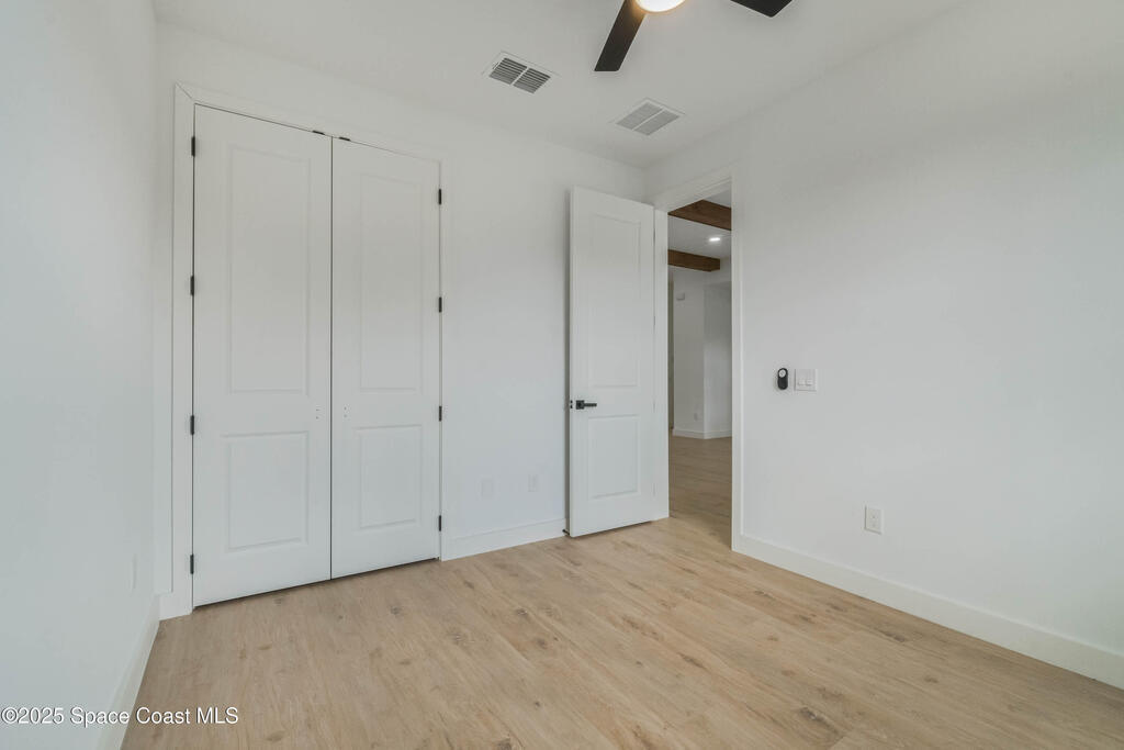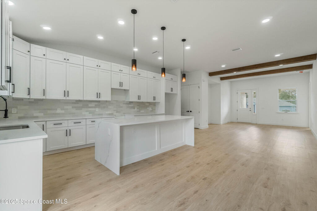 This new 4-bedroom, 2-bathroom home in Palm Bay, Florida, offers 1,800 square feet of modern comfort. The open-concept layout features a spacious kitchen with quartz countertops, floor-to-ceiling cabinets, and a large island. Rustic wood-finish beams add warmth to the inviting living area. The split floor plan ensures privacy, and the two-car garage provides ample storage. Enjoy the benefits of new construction--roof, HVAC, plumbing, and electrical--built for efficiency. Located in a quiet, HOA-free neighborhood, it's minutes from shopping, dining, beaches, and major highways.