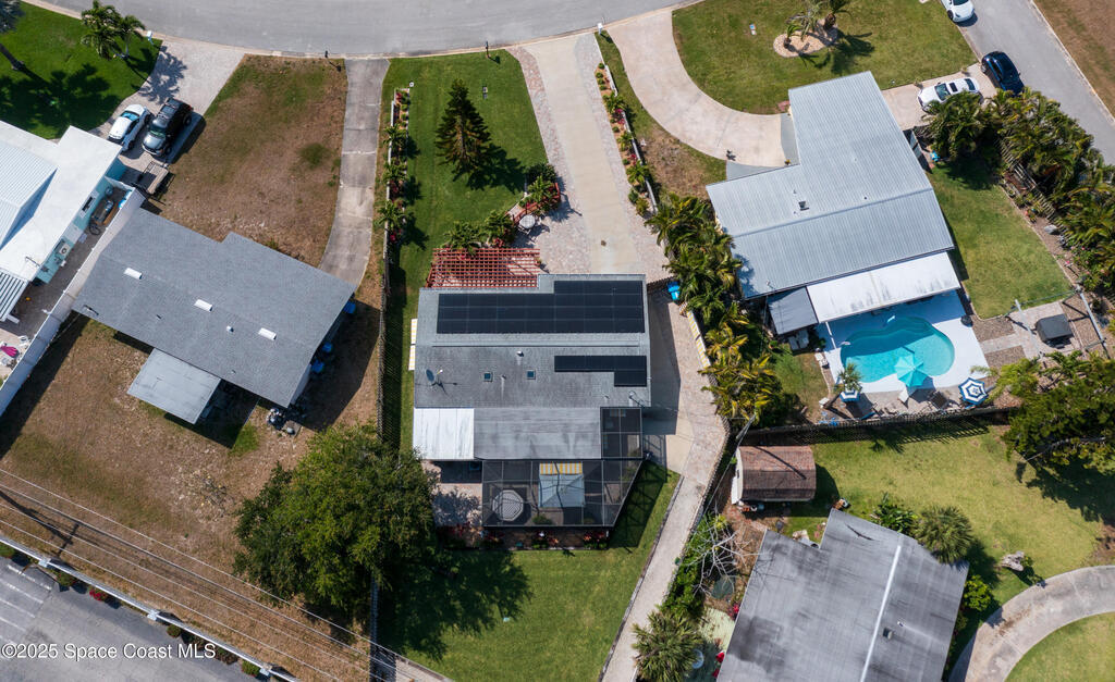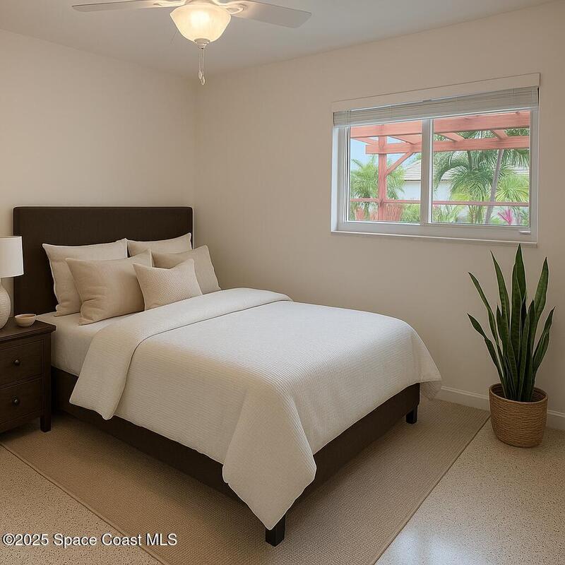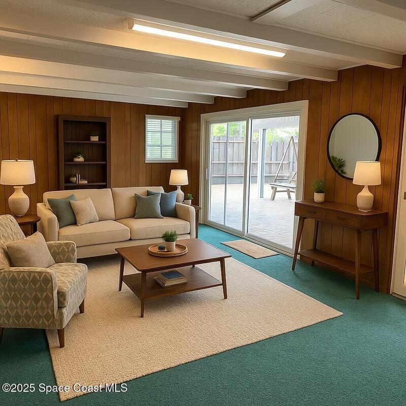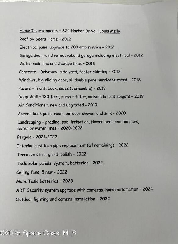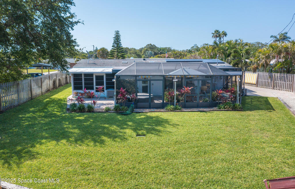 Charming Beachside Home and unique residential beachside one of a kind community. Classic Florida Style. 3-bedroom, 1-bath home with room to grow! Home features modern exterior to include 168 square feet covered screened in patio, modern custom permeable pavers front ,120 foot well, solar panels with transferable warranty, sprinklers, water main line, sewage lines replaced 2018, custom pergola with a professionally landscape extending the outdoor space. Inside, you'll find terrazzo floors and retro pine cabinetry. A few updates include energy-efficient, hurricane-rated windows, a 200-amp electrical panel, solar panel system installed transferable ADT system and interior cast iron replaced 2022. Located minutes to the Atlantic Ocean, Peacock Beach, Cruise Port Canaveral, Kennedy Space Center, MCO, Patrick Space Force Base. Don't miss out on this opportunity to add to your dream home in the exceptional location!