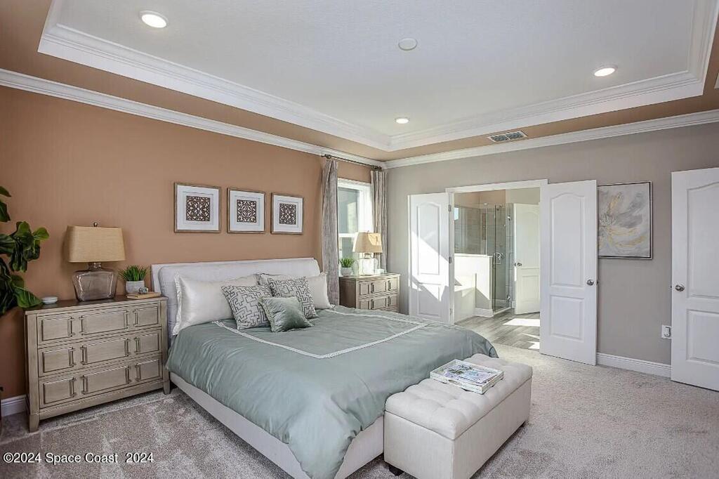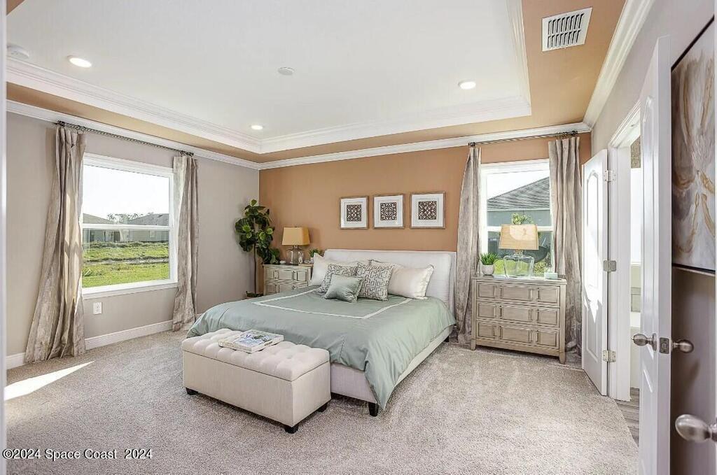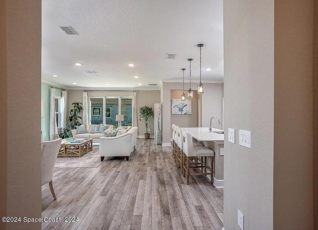 Under Construction. Your Dream Home Awaits! This stunning residence offers a perfect blend of modern elegance and everyday functionality, with high-end upgrades throughout--all nestled in the highly desirable gated community of Island Forest Preserve, a haven for wildlife enthusiasts and nature lovers.Located just 8 miles from Cocoa Beach, this beautifully crafted Miramar plan showcases the subtle elegance of Florida-inspired architecture, highlighted by a covered front entry and enhanced with entry and driveway pavers, creating a welcoming and upscale first impression.Inside, soaring 9' ceilings and an open-concept layout provide a sense of space and flow while maintaining thoughtful separation. The heart of the home is the expansive great room and designer kitchen--ideal for entertaining--featuring quartz countertops throughout, a large center island, soft-close cabinets, and upgraded finishes.
