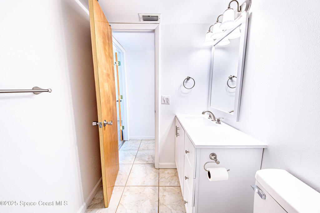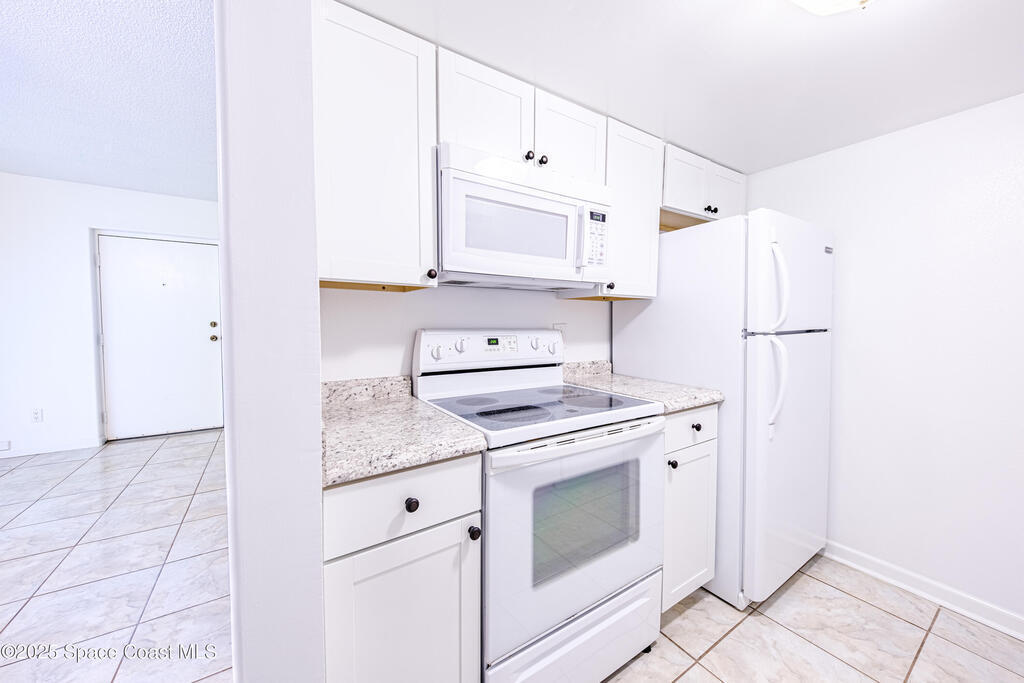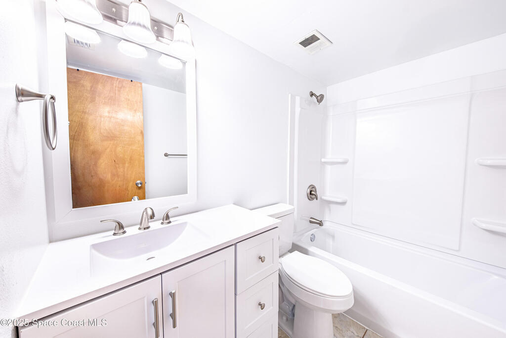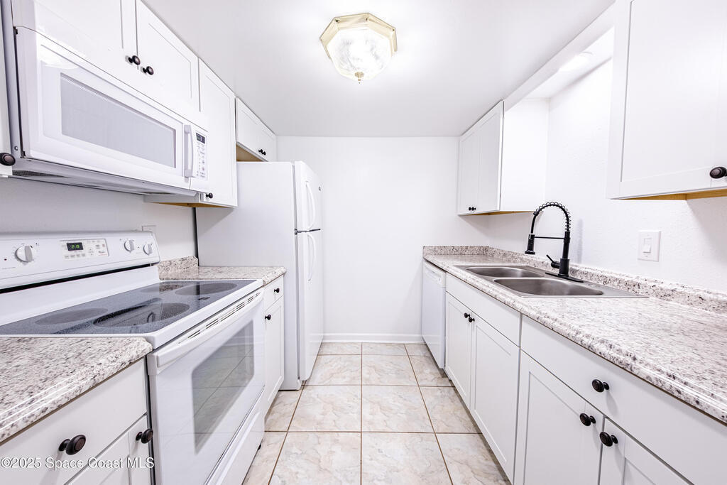 This first floor condo has a newly renovated kitchen, brand new bathroom, and is freshly painted throughout. Tile floor in living area and carpet in the bedroom. Master bedroom has a wall length closet and the large pantry/utility closet allows for plenty of storage. Sliding glass door leads to a patio with all new screening and view of the courtyard. Low HOA fee includes trash, water, cable, internet, pest control, lawn maintenance, exterior maintenance, and roof reserves. All you pay is electric! AC was installed July 2023 and serviced every 6 months. Laundry room is on-site and is centrally located in the complex. Nottingham Manor is conveniently located about a mile from I-95 and is only minutes away from US1, the Indian River, beaches, parks, the Merritt Island National Wildlife Refuge, and Kennedy Space Center. This condo is move in ready and is a perfect starter home or an investment property with no rental restrictions.