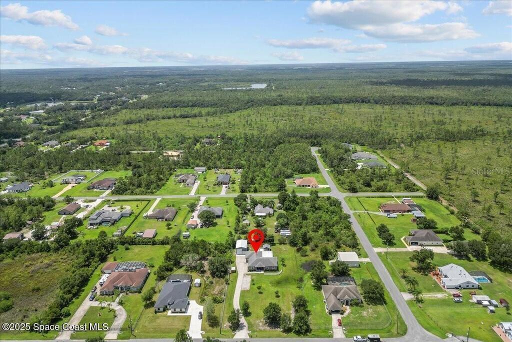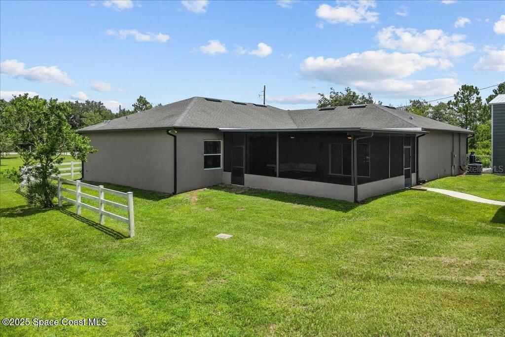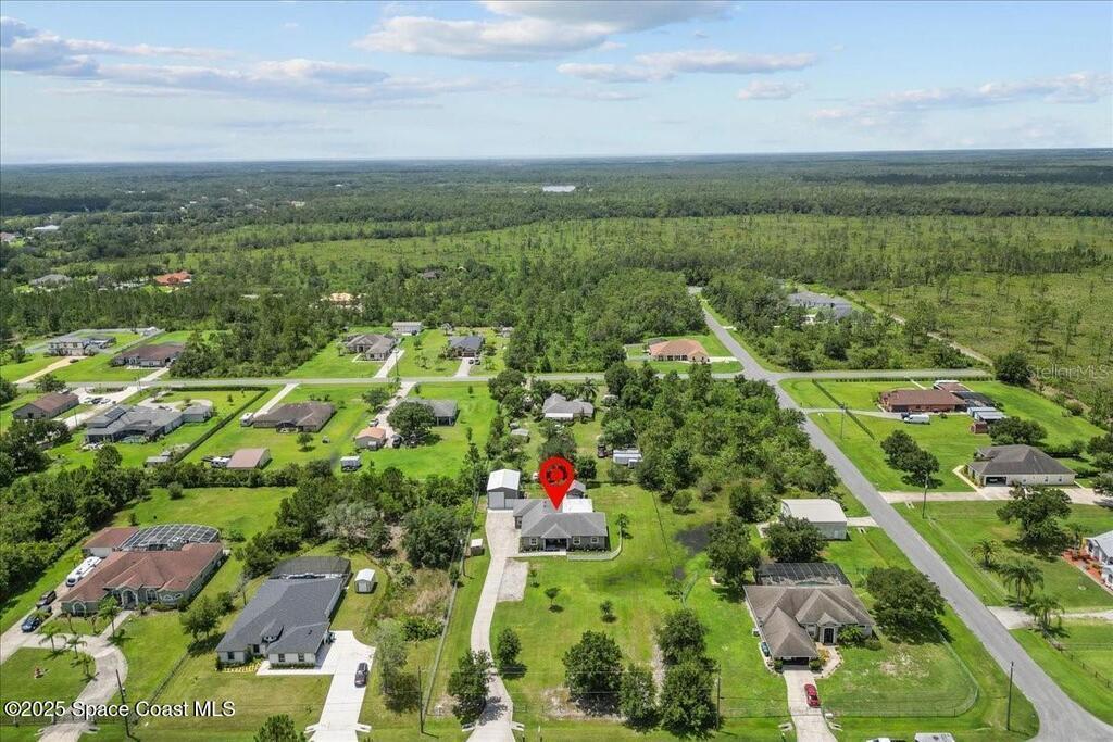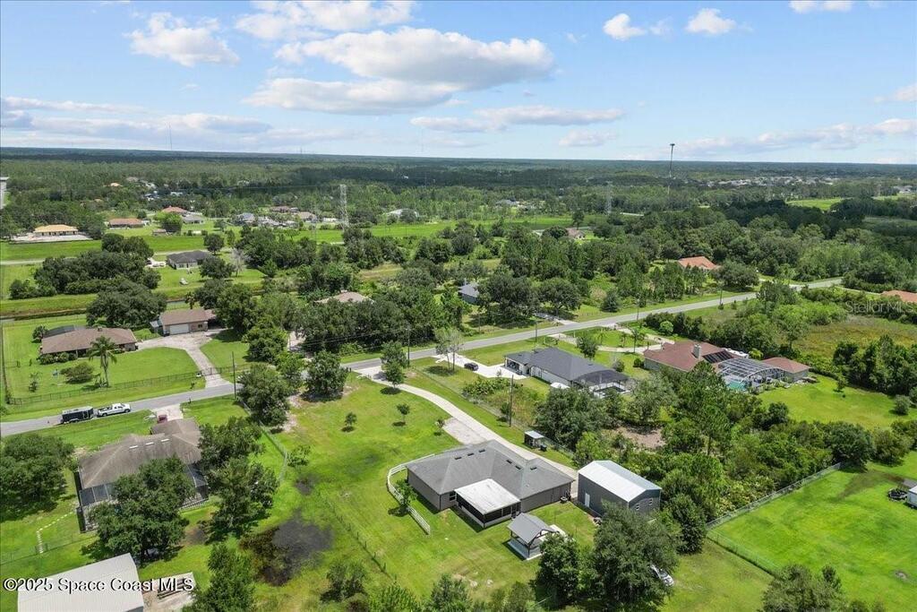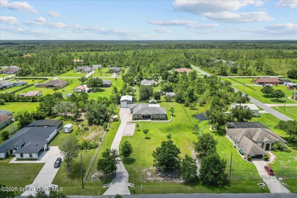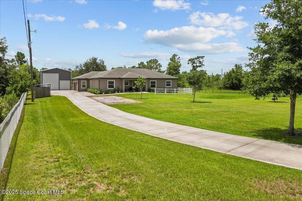 This private 4-bedroom, 3-bath retreat offers 2,177 sq ft of luxury living on a fully fenced acre, blending comfort, function, and indoor-outdoor appeal. The open-concept layout centers on a stunning kitchen with black stainless steel appliances and a large island, flowing seamlessly into the spacious living room and out to a screened lanai via 3-panel pocket doors. The primary suite boasts lanai access, a walk-in closet, and spa-style bath with a garden tub and zero-entry shower. Bedrooms 2 and 3 share a stylish bath, while the oversized 4th bedroom features a wet bar, private bath, and lanai access--ideal as a theater or game room. Outdoor living shines with a firepit cabana, and the 24' x 35' RV garage includes roll-up doors, a powered loft, and an air-conditioned room. Additional highlights: crown moulding, central vacuum, deep closets, large laundry room, 2.5-car garage with golf cart bay. A-rated schools, trails, parks, and beaches all within reach!