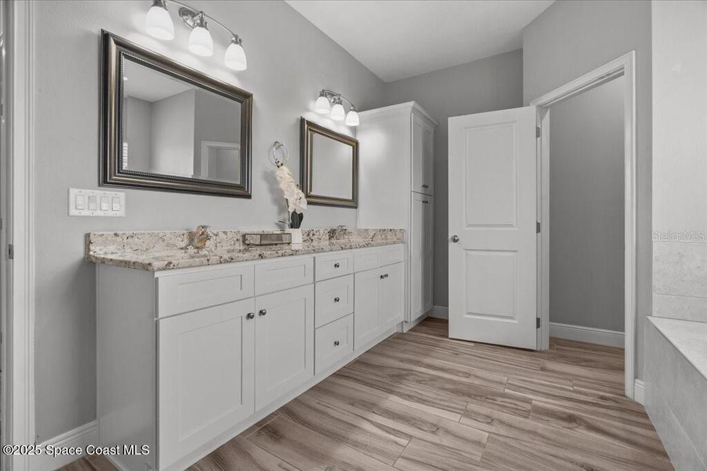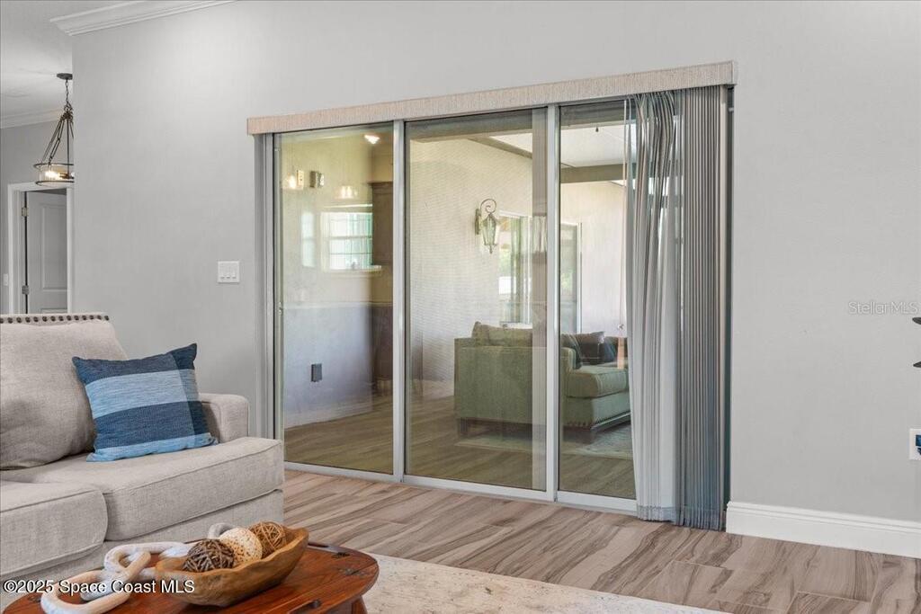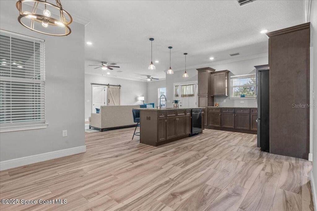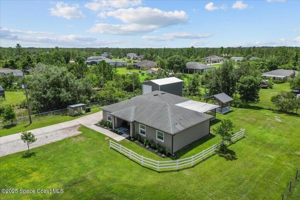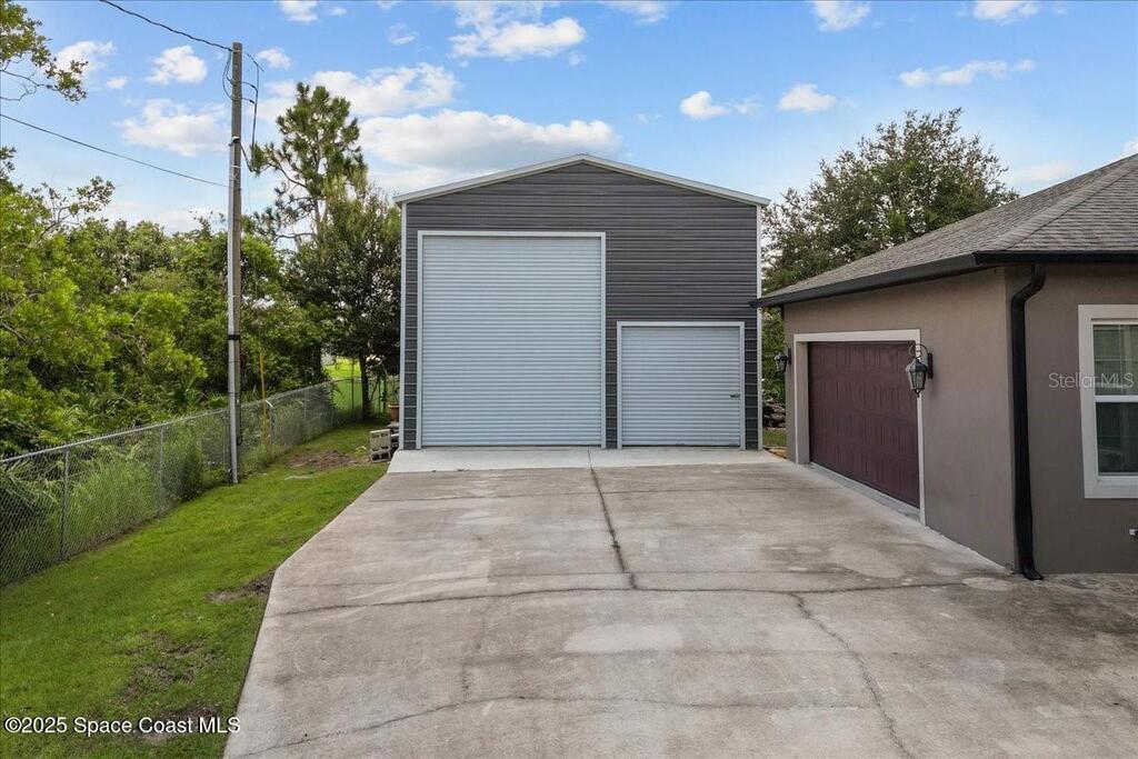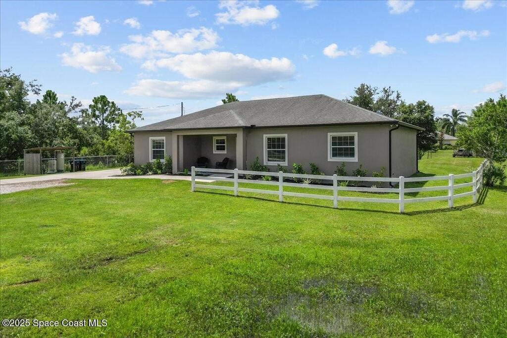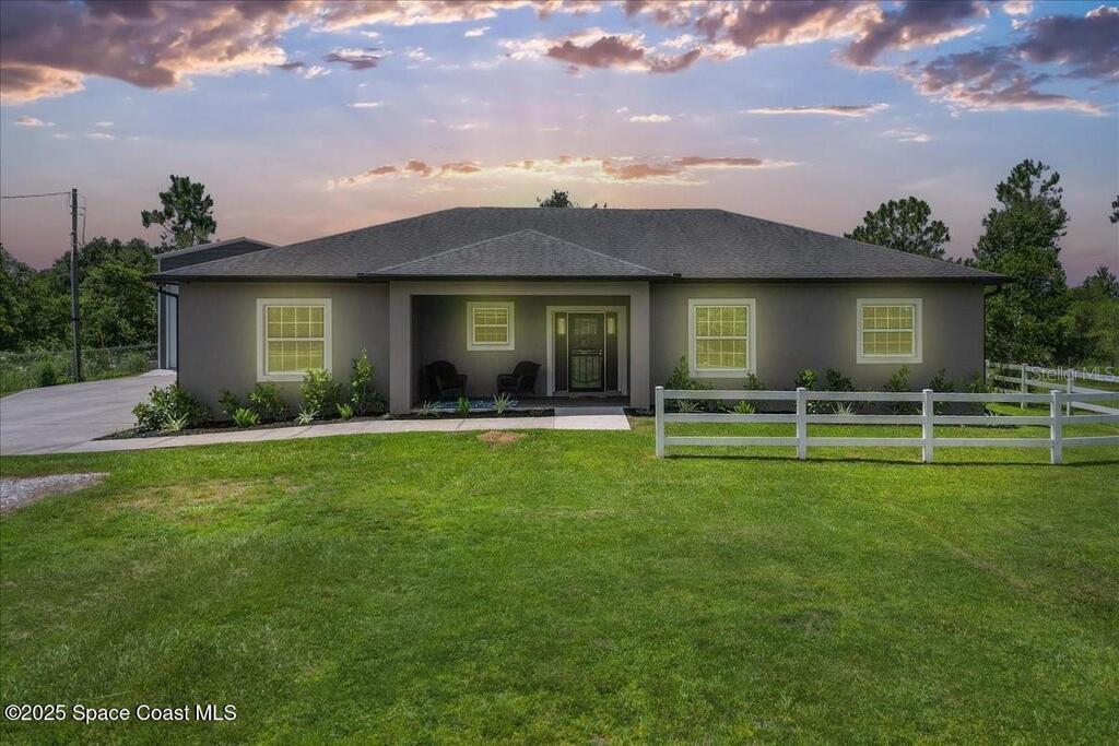 This private 4-bedroom, 3-bath retreat offers 2,177 sq ft of luxury living on a fully fenced acre, blending comfort, function, and indoor-outdoor appeal. The open-concept layout centers on a stunning kitchen with black stainless steel appliances and a large island, flowing seamlessly into the spacious living room and out to a screened lanai via 3-panel pocket doors. The primary suite boasts lanai access, a walk-in closet, and spa-style bath with a garden tub and zero-entry shower. Bedrooms 2 and 3 share a stylish bath, while the oversized 4th bedroom features a wet bar, private bath, and lanai access--ideal as a theater or game room. Outdoor living shines with a firepit cabana, and the 24' x 35' RV garage includes roll-up doors, a powered loft, and an air-conditioned room. Additional highlights: crown moulding, central vacuum, deep closets, large laundry room, 2.5-car garage with golf cart bay. A-rated schools, trails, parks, and beaches all within reach!
