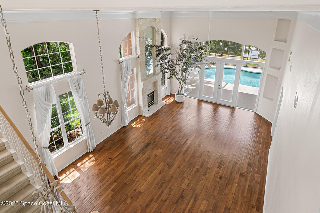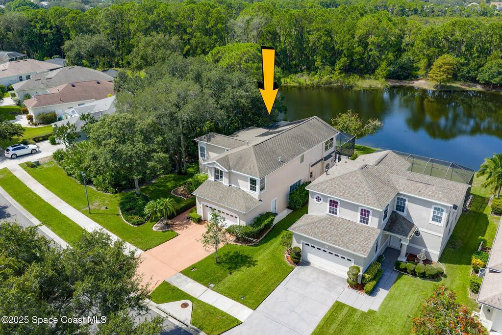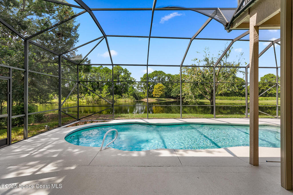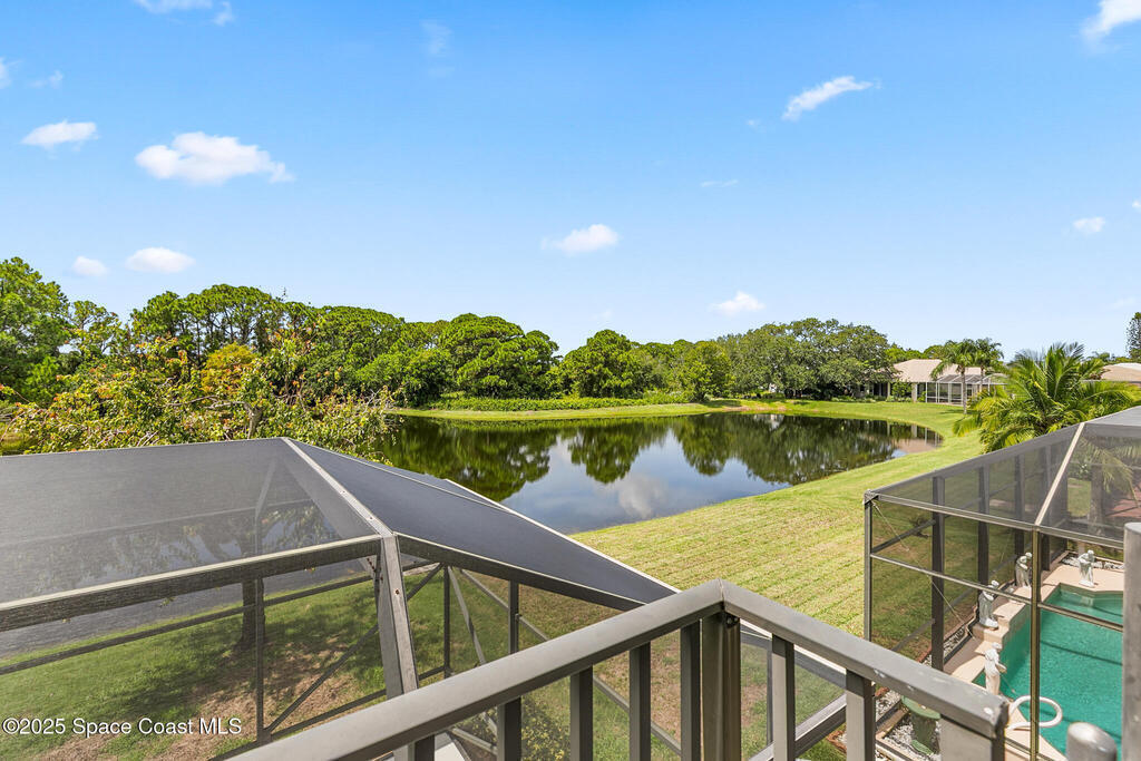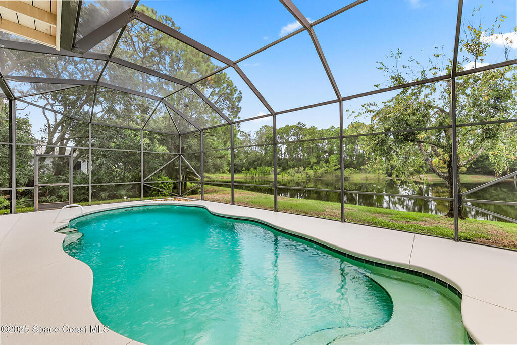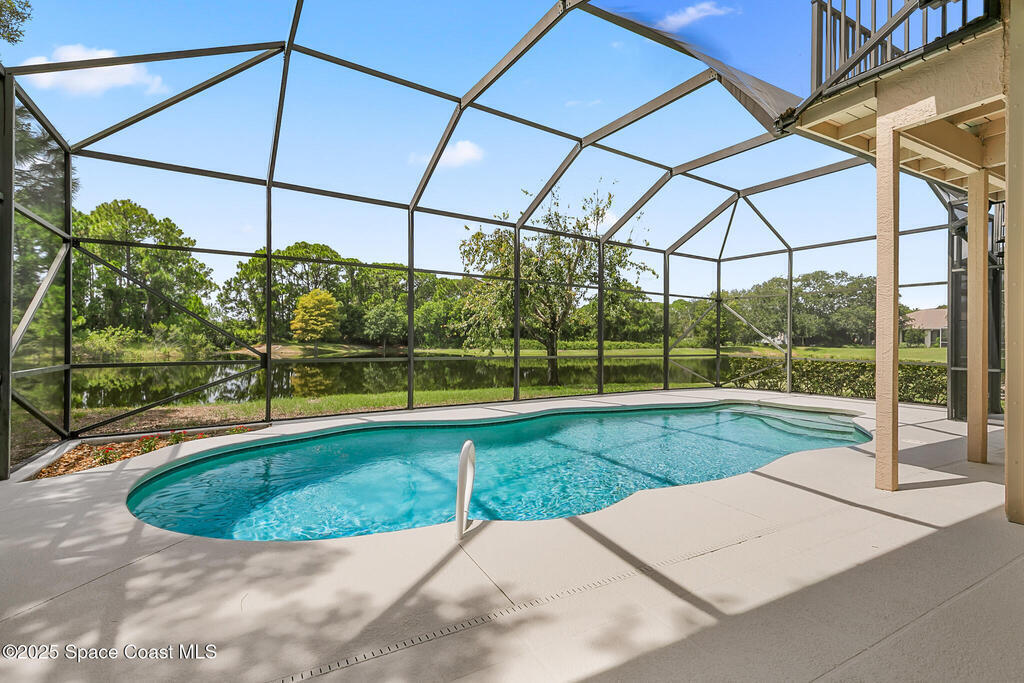 Welcome to this beautiful three-bedroom, two-and-a-half-bathroom lakefront home with no rear neighbors and stunning water views. Step through the impressive 9-foot tall entrance and into the kitchen, with stainless steel appliances, built-in gas oven and cooktop, seamless Corian sink, wood cabinetry with crown molding, and recessed lighting. Living room soars to the second floor with windows and gas fireplace; crown molding and plantation shutters throughout. Upstairs, a spacious loft enjoys a balcony with composite decking overlooking the pool and lake, with its own separate staircase to the screened-in pool area. Pool area has newly resurfaced deck, pool equipment storage, and the back porch comes with automatic roll-down shutters. Stubbed for future gas BBQ. Half bath has large closet that could convert to shower. Separate laundry with window, cabinets, front-loading washer/dryer. Extra-wide garage with window and its own side door.