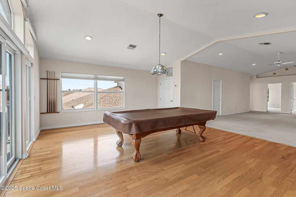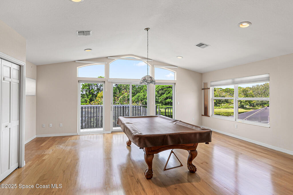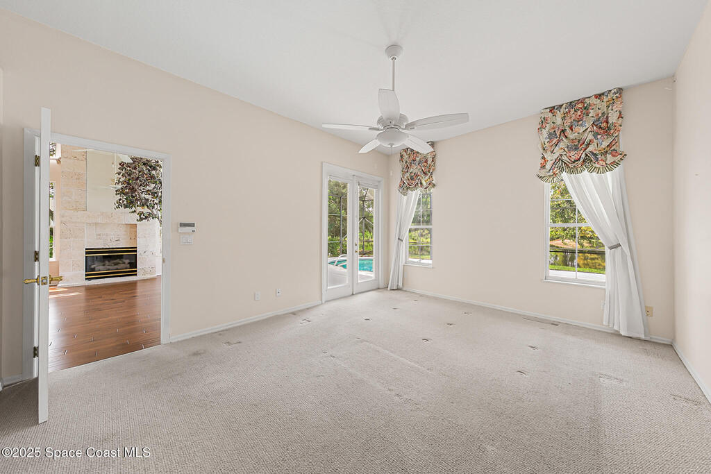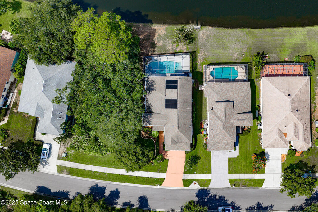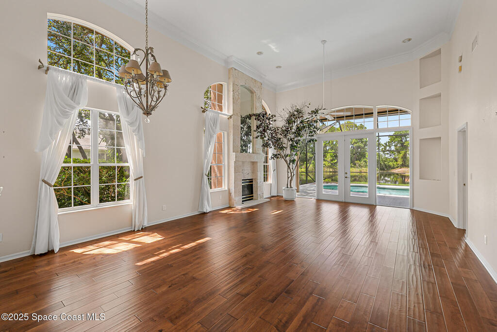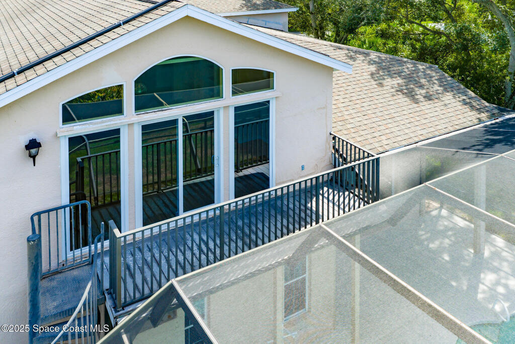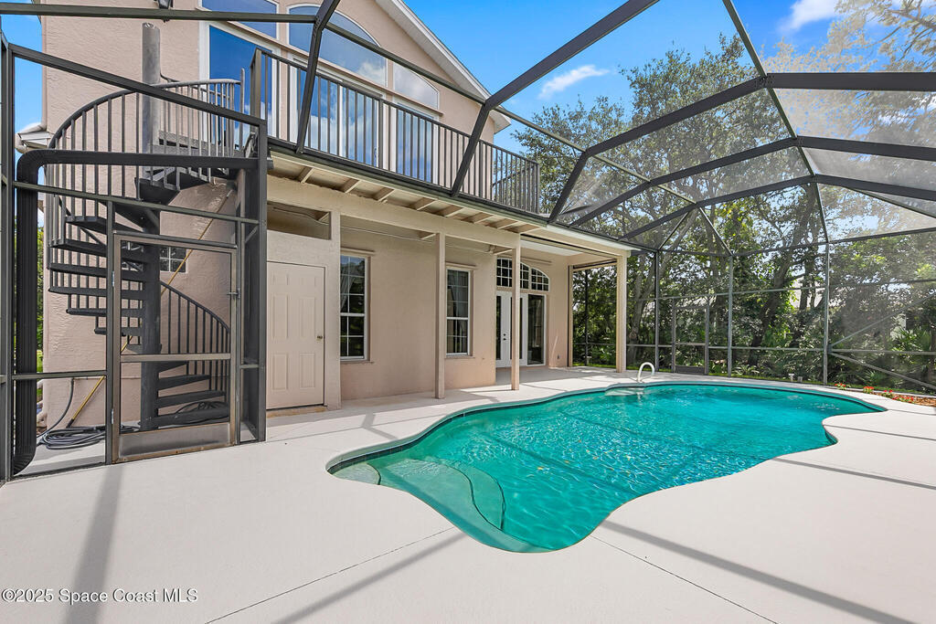 Welcome to this beautiful three-bedroom, two-and-a-half-bathroom lakefront home with no rear neighbors and stunning water views. Step through the impressive 9-foot tall entrance and into the kitchen, with stainless steel appliances, built-in gas oven and cooktop, seamless Corian sink, wood cabinetry with crown molding, and recessed lighting. Living room soars to the second floor with windows and gas fireplace; crown molding and plantation shutters throughout. Upstairs, a spacious loft enjoys a balcony with composite decking overlooking the pool and lake, with its own separate staircase to the screened-in pool area. Pool area has newly resurfaced deck, pool equipment storage, and the back porch comes with automatic roll-down shutters. Stubbed for future gas BBQ. Half bath has large closet that could convert to shower. Separate laundry with window, cabinets, front-loading washer/dryer. Extra-wide garage with window and its own side door.