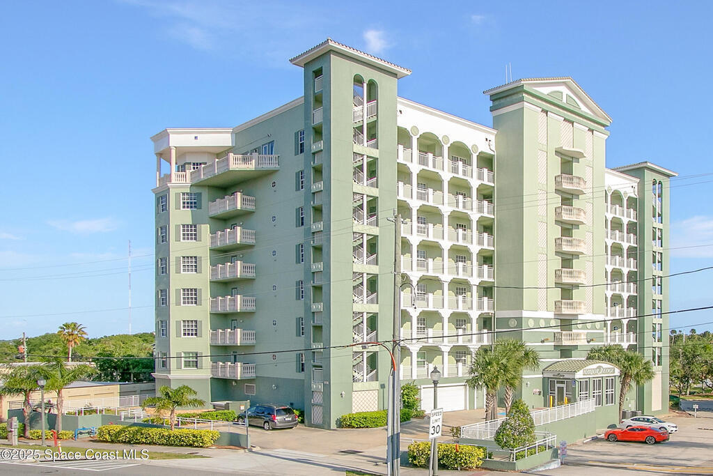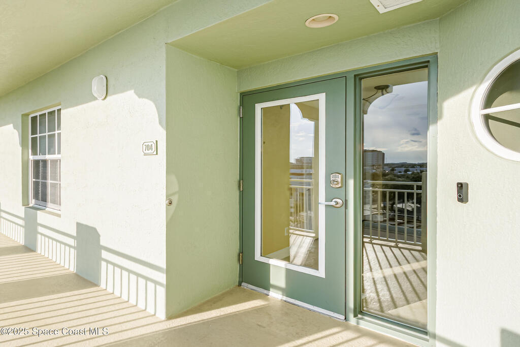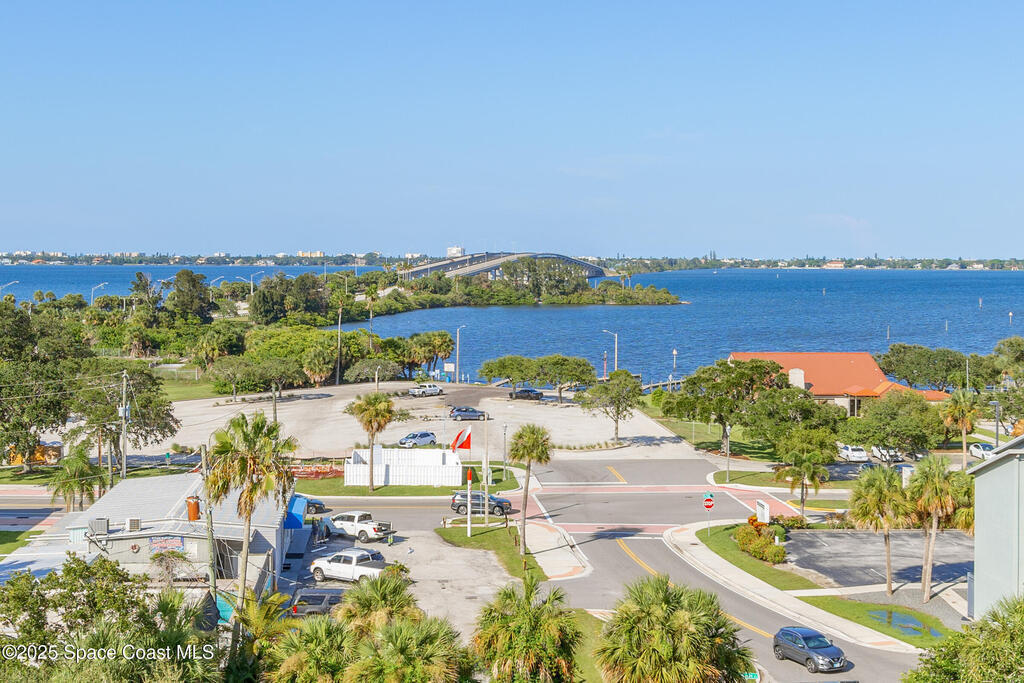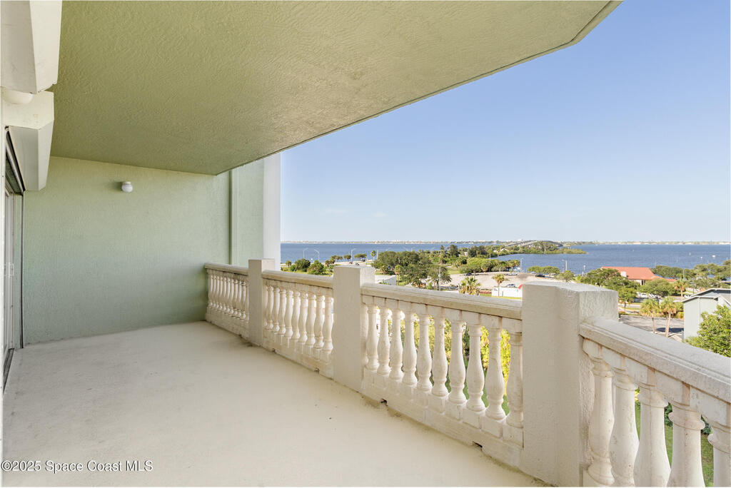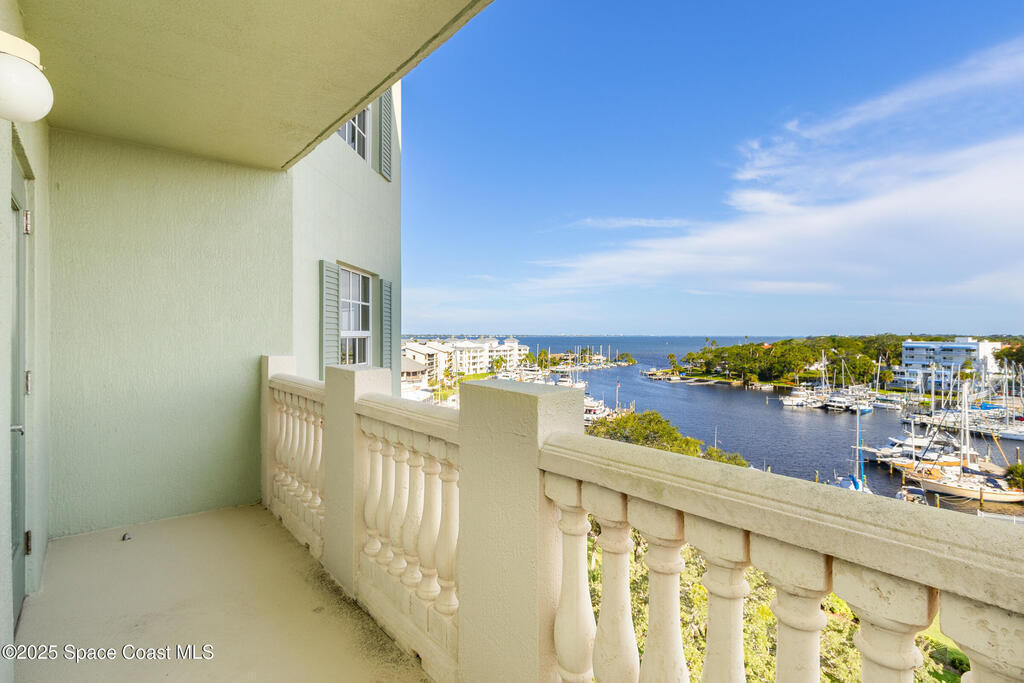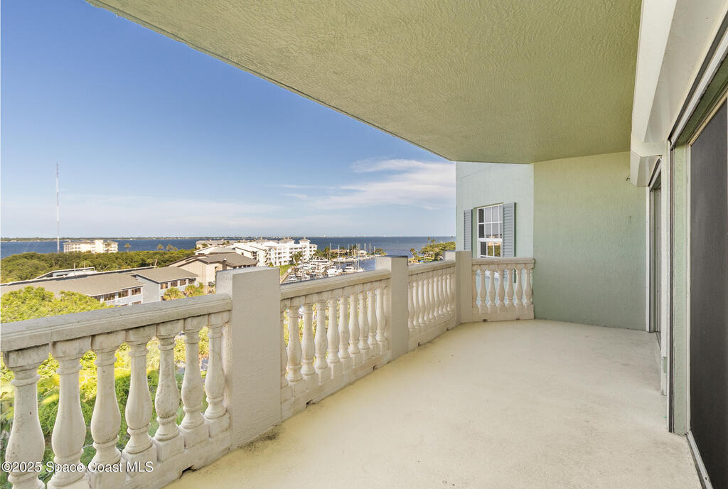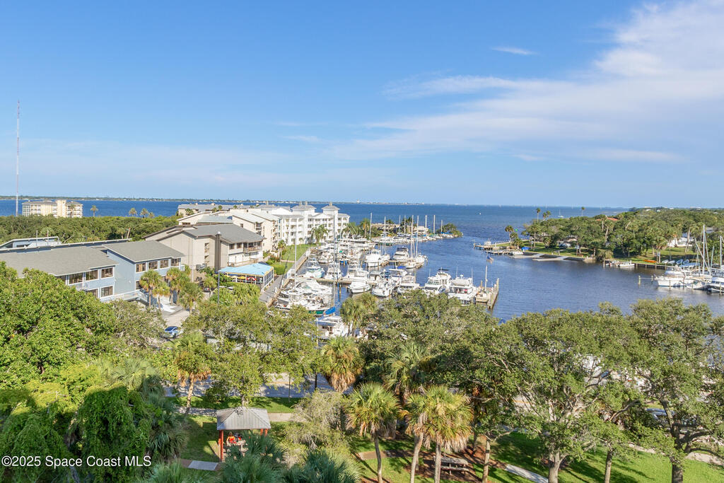 Rare SE Corner Unit with Panoramic 7th Floor Views! Enjoy breathtaking sunrises & sunsets from this end unit offering sweeping 7th-floor views of the Indian River, Melbourne Harbor, Crane Creek, the Causeway, and Downtown Melbourne. Nearly every window frames water, boats, & blue skies. Interior features include tile & wood-look plank flooring throughout, a spacious kitchen with a center island, granite countertops, and an open layout that flows seamlessly into the living and dining areas. Sliders from both the living rm. and primary suite lead to a riverfront balcony, with an additional side porch off the kitchen. The split bedroom plan includes 3 bedrooms, 2.5 baths, and a private laundry room. 1 guest b/r has its own private bath. The primary suite features vanity w/ vessel sinks, a soaking tub, separate shower, and private balcony access. 2 reserved covered parking spaces included, PLUS A FULL BUILDING GENERATOR! Prime location with sidewalks leading to Historic downtown!