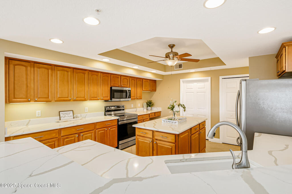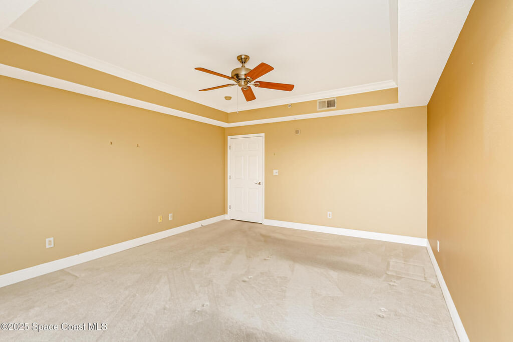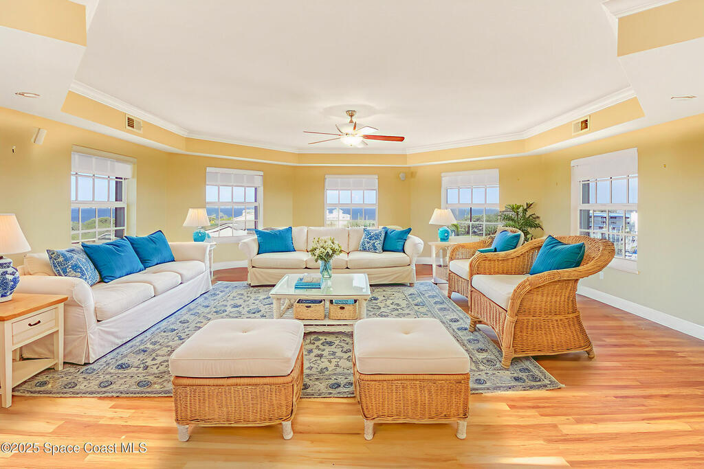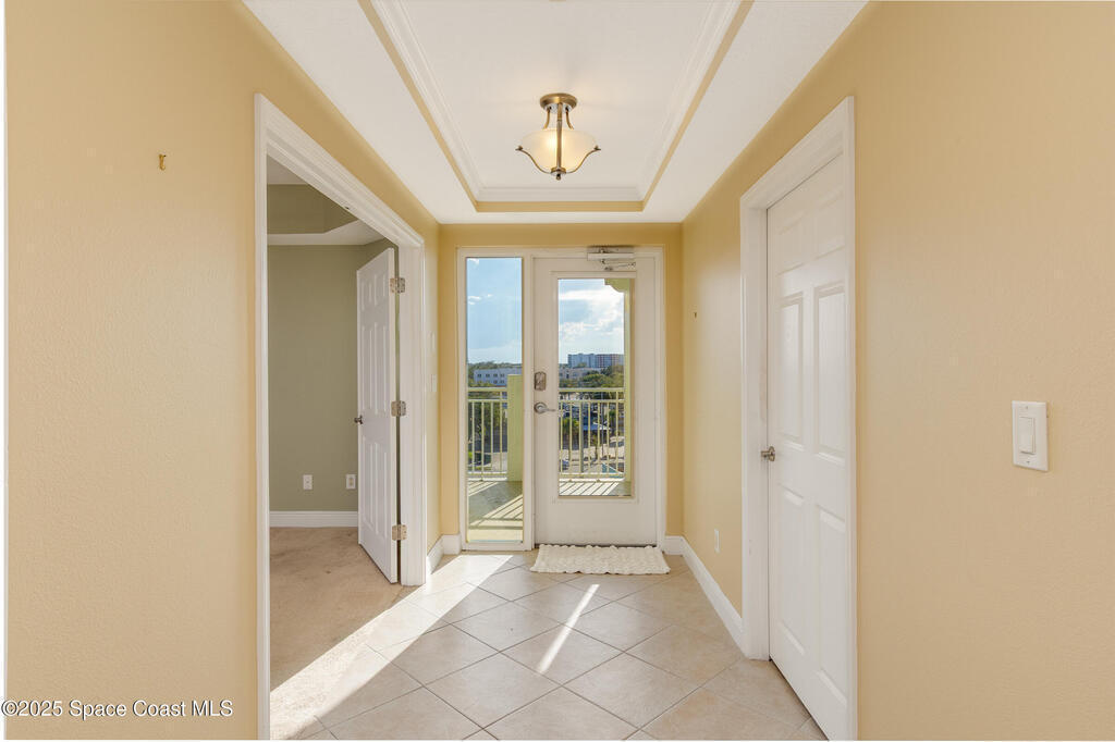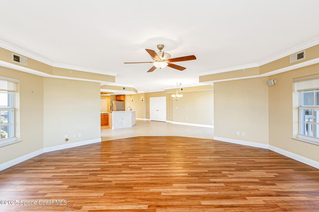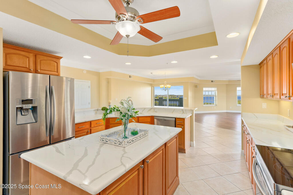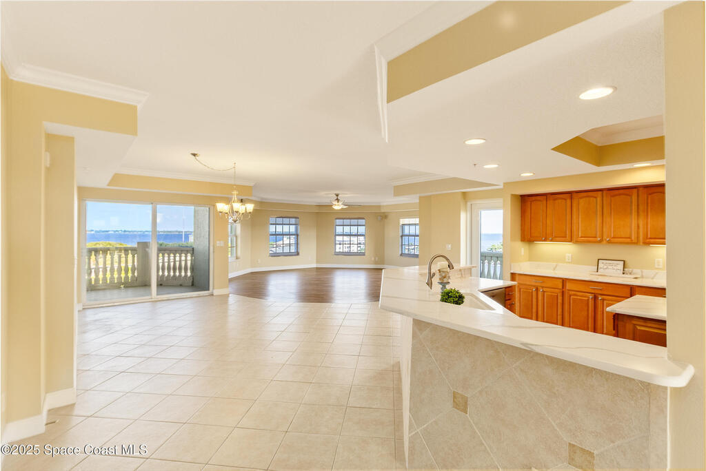 Rare SE Corner Unit with Panoramic 7th Floor Views! Enjoy breathtaking sunrises & sunsets from this end unit offering sweeping 7th-floor views of the Indian River, Melbourne Harbor, Crane Creek, the Causeway, and Downtown Melbourne. Nearly every window frames water, boats, & blue skies. Interior features include tile & wood-look plank flooring throughout, a spacious kitchen with a center island, granite countertops, and an open layout that flows seamlessly into the living and dining areas. Sliders from both the living rm. and primary suite lead to a riverfront balcony, with an additional side porch off the kitchen. The split bedroom plan includes 3 bedrooms, 2.5 baths, and a private laundry room. 1 guest b/r has its own private bath. The primary suite features vanity w/ vessel sinks, a soaking tub, separate shower, and private balcony access. 2 reserved covered parking spaces included, PLUS A FULL BUILDING GENERATOR! Prime location with sidewalks leading to Historic downtown!