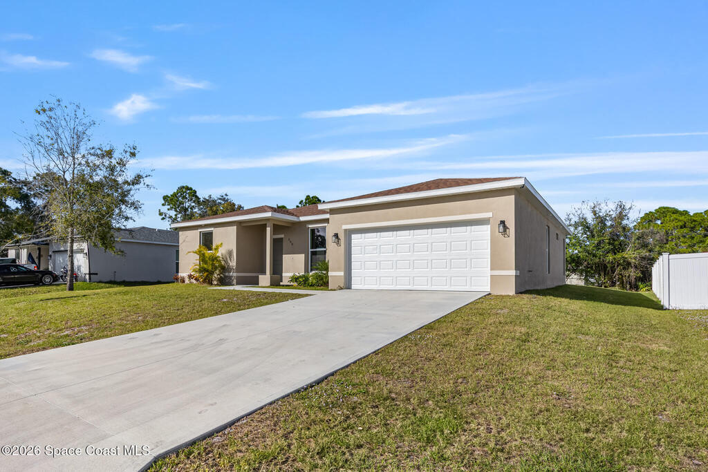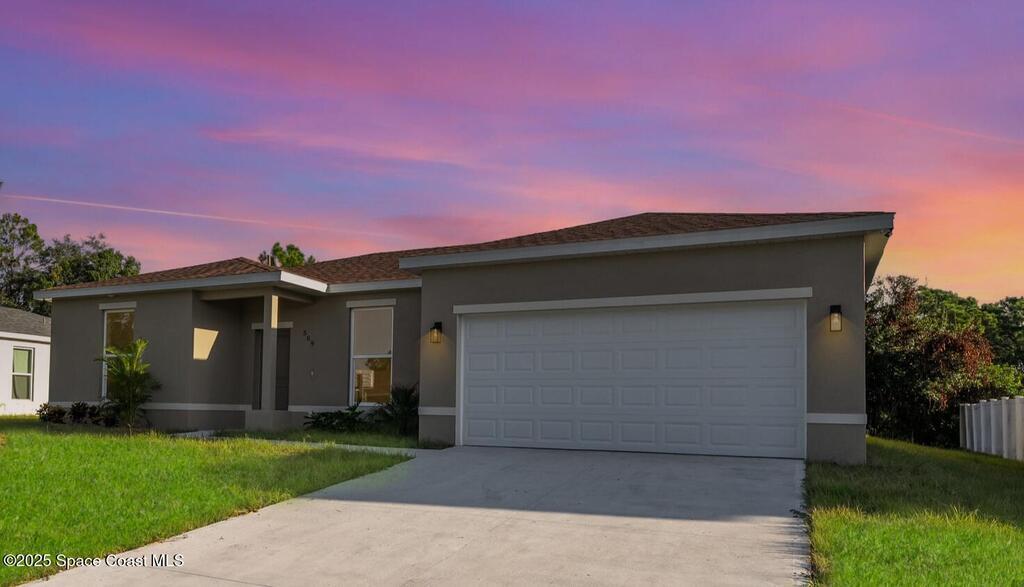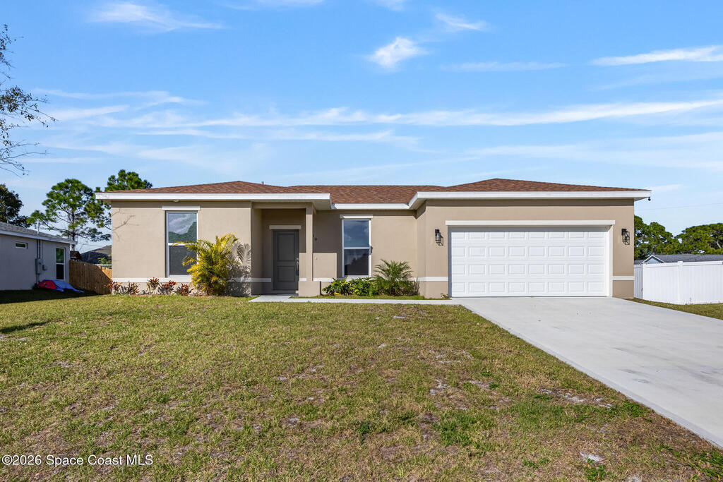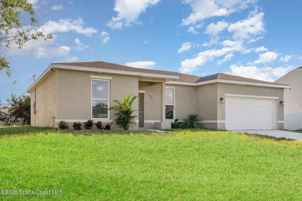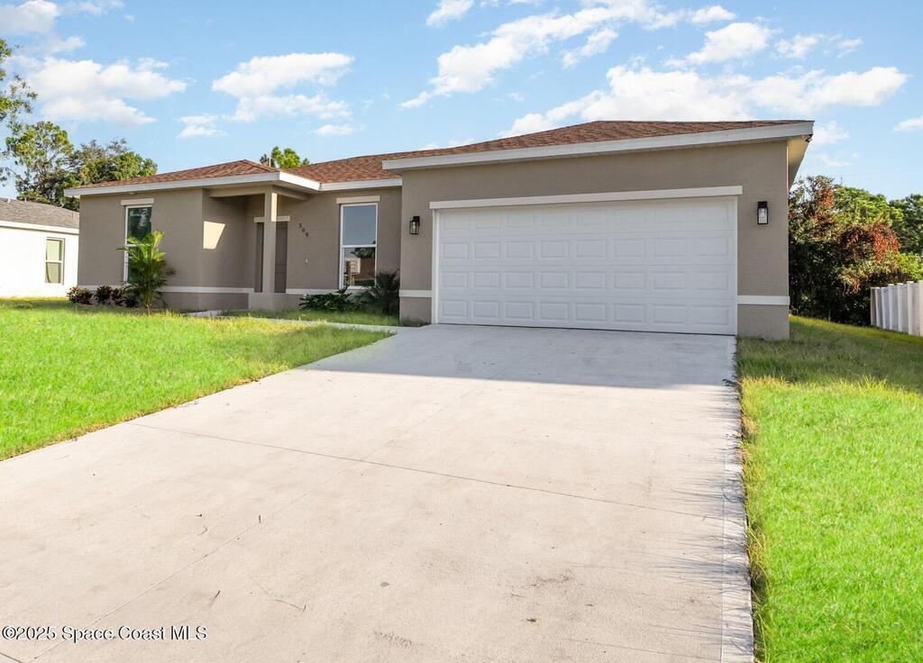 NEW construction! The energy-efficient 38'' x 78'' hurricane-impact windows and 2 car insulated garage door offer peace of mind and exceptional protection in this stunning semi-custom 4-bedroom, 2-bathroom, split plan concrete block home. This beautiful home is finished in warm, subtle tones and nestled on .24 of an acre. Enjoy a spacious open floor plan with expansive 9'4'' ceilings and easy-care plank flooring. The kitchen is designed for entertaining with a large breakfast bar, granite countertops, undermount sink, pendant lighting, 42'' upper cabinets for added storage, and stainless steel appliances. The luxurious primary bathroom showcases a free-standing soaking tub, elegant designer tile, an oversized walk-in shower with glass enclosure and granite countertops with dual sinks. The large primary bedroom features His and Her closets for convenience and organization.Ceiling fans, an indoor laundry room. $5,000. Flex cash towards prepaids, closing costs and interest rate buydown.