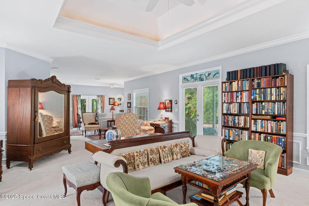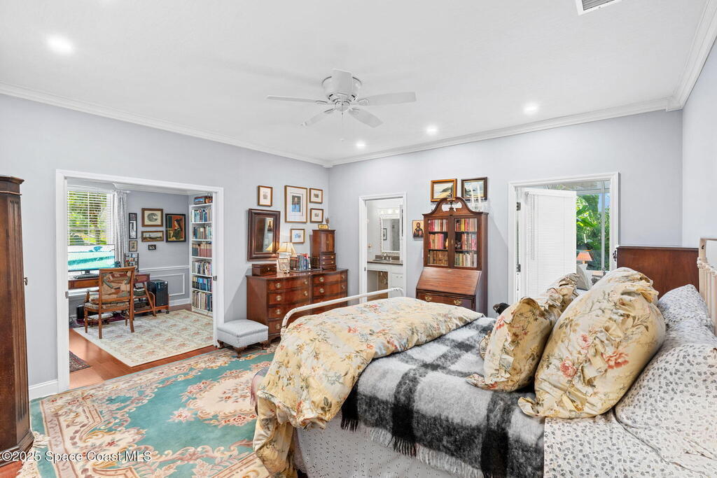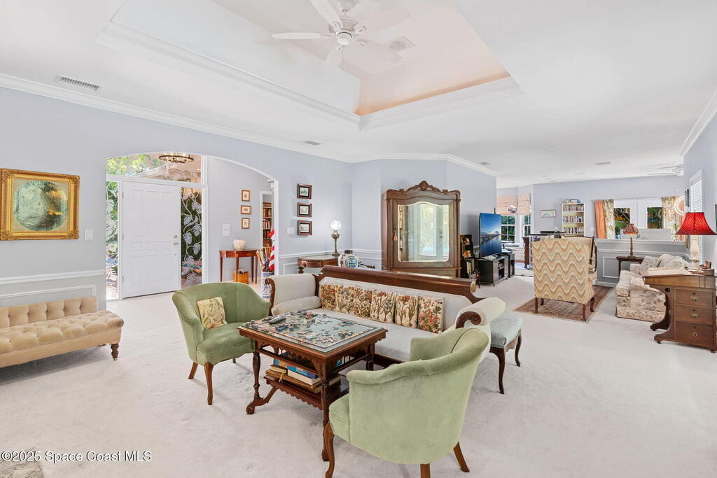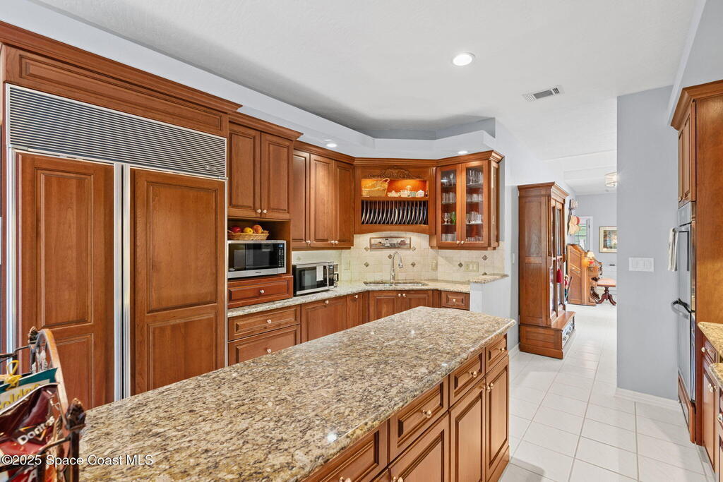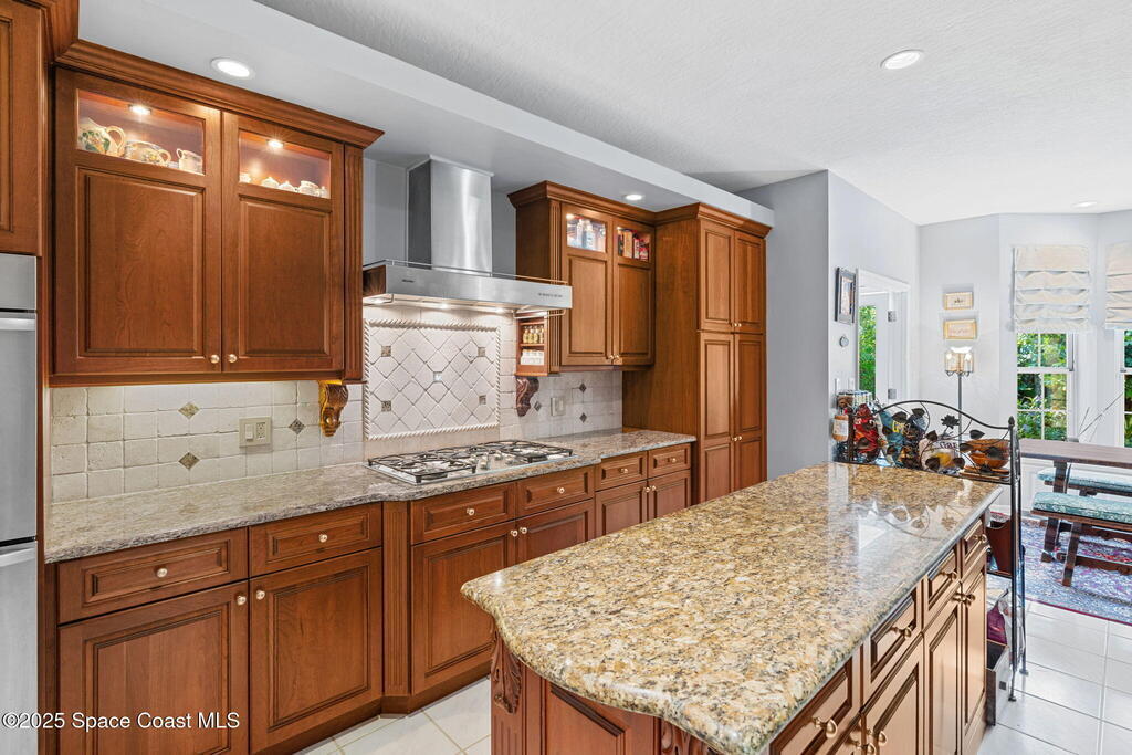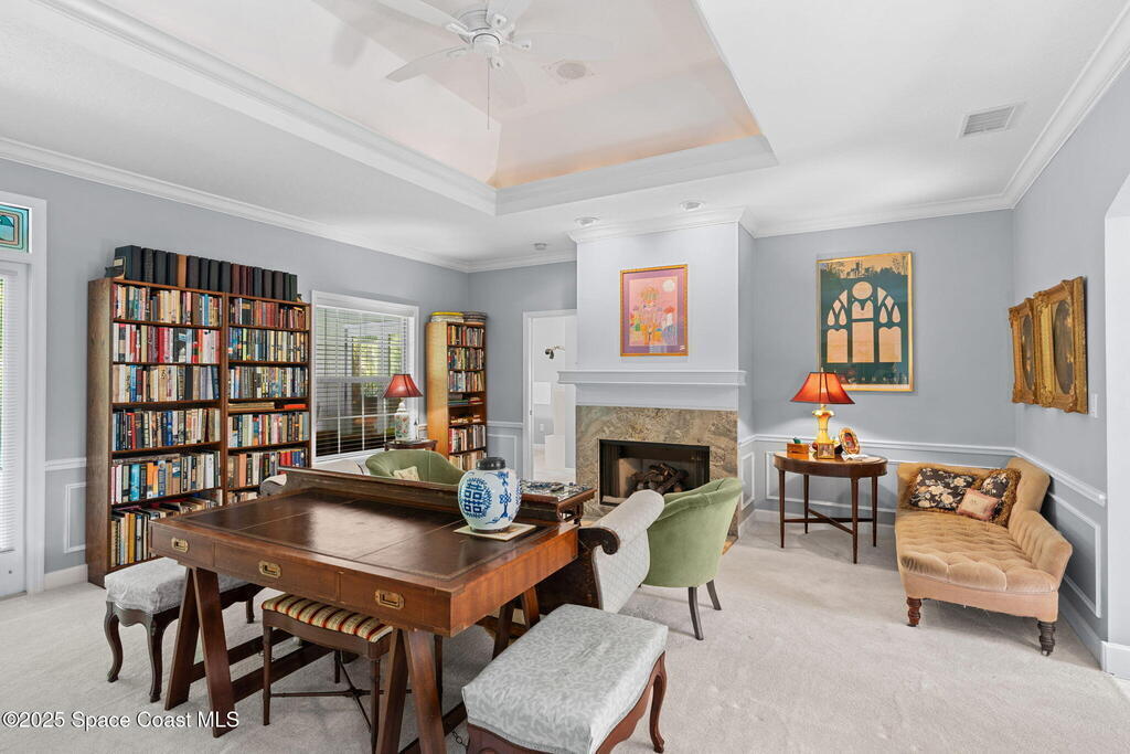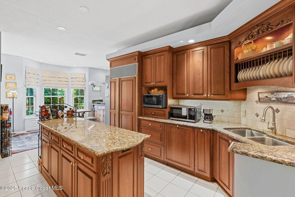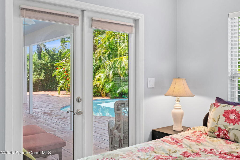 Welcome to your custom-built beachside pool retreat, perfectly set along a picturesque, tree-lined street in guard-gated The Sanctuary. A tray ceiling with ambient lighting & crown molding draws you into the great room, anchored by a gas fireplace with a new granite hearth. The thoughtfully designed single-story layout offers privacy with two spare bedrooms & a hall bath in one wing, a pool suite in another, and a generous primary suite with an attached private office, nursery, or sitting room. The kitchen showcases designer cherry cabinetry, granite counters, a Sub-Zero cabinet-overlay refrigerator, gas Miele cooktop, and double oven. An impact-glass sunroom invites serene mornings, while a whole-home water filtration system, insulated interior walls, newer HVAC with UV light, tankless water heater, December 2020 roof, and whole-home generator add comfort & efficiency. Outdoors, the Spanish-tiled lanai opens to the heated pool, embraced by lush tropical foliage for a secluded retreat