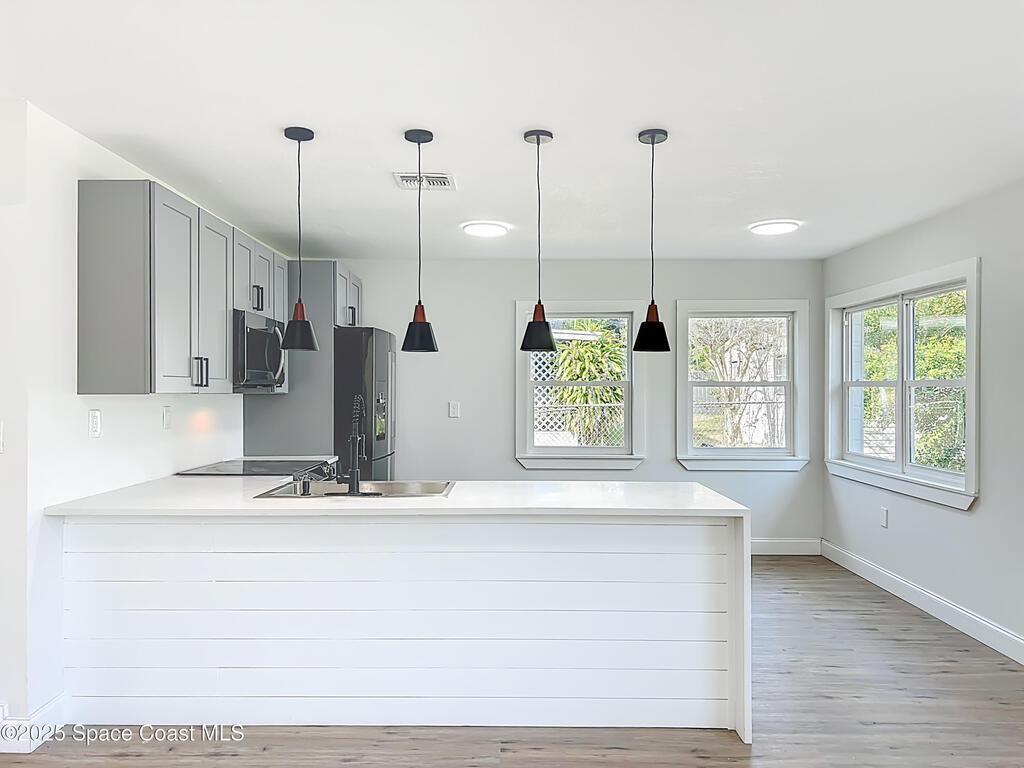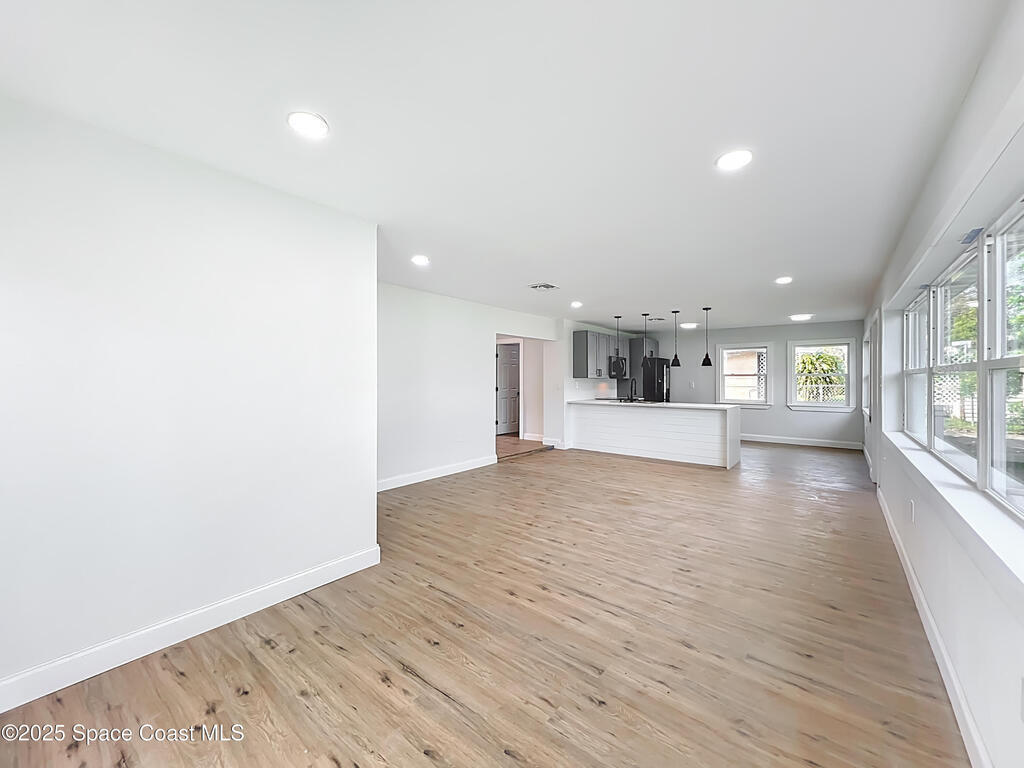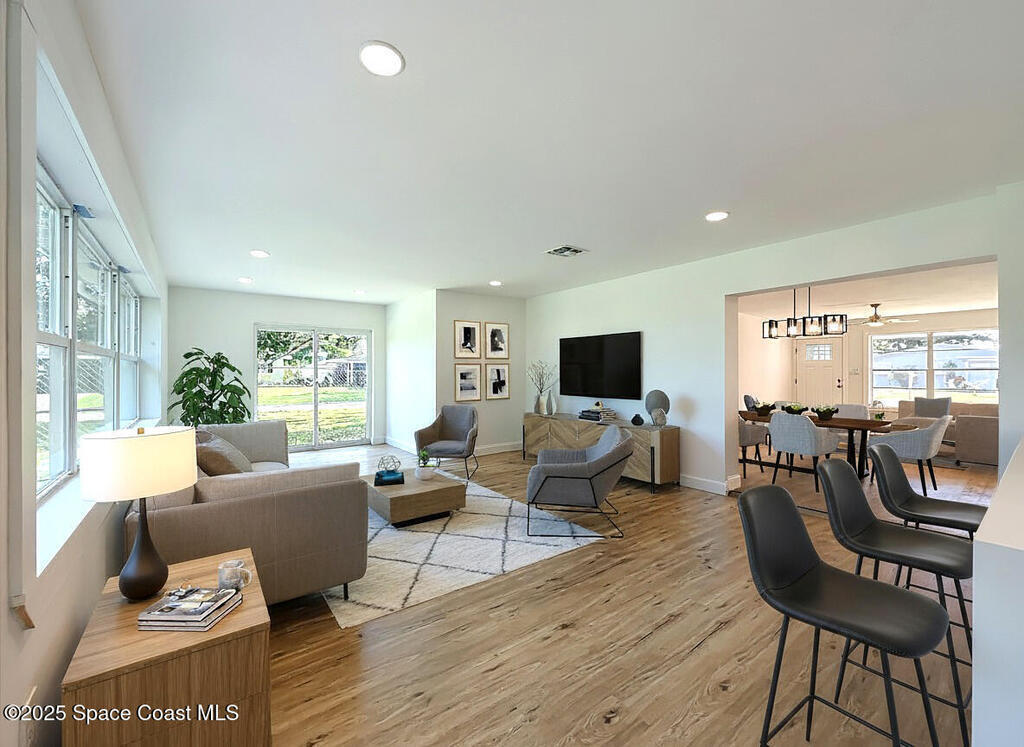 Fully remodeled 3-bedroom, 2-bath home with 1,567 sq. ft. in a quiet Melbourne neighborhood just 10 minutes from the beach! Enjoy the modern upgrades throughout, including a brand-new kitchen with cabinets, countertops, appliances, and fixtures, plus fully renovated bathrooms and stylish vinyl flooring. The open-concept layout connects the living, dining, and kitchen areas, creating an inviting space for everyday living or entertaining. Outside, you'll find a covered carport, extra driveway parking, fenced yard with green space, and a storage shed. With no HOA, you'll enjoy extra flexibility and lower monthly costs. Conveniently located near Downtown Melbourne, Eau Gallie, shopping, dining, and the Intracoastal--this move-in-ready home is waiting for its new owners!