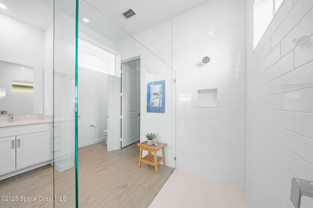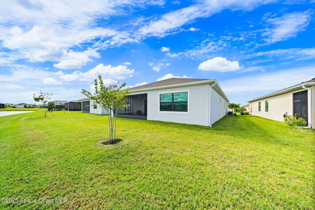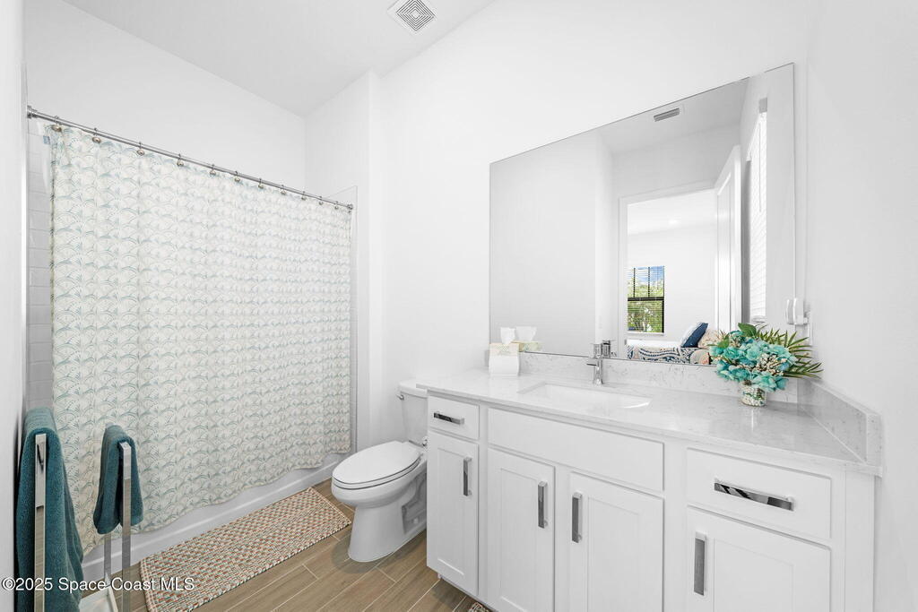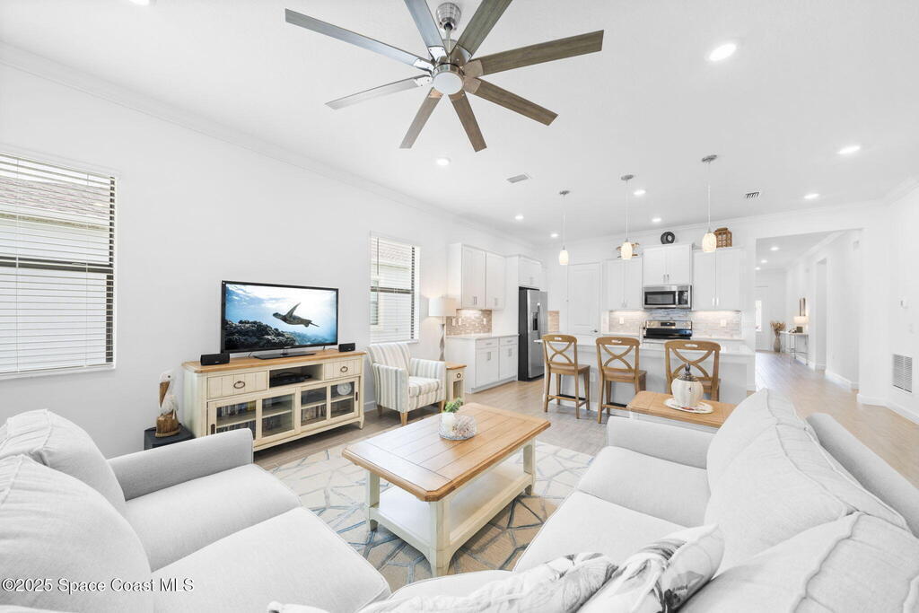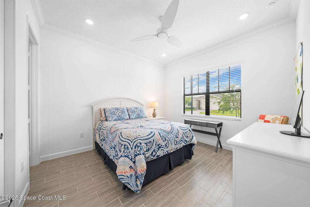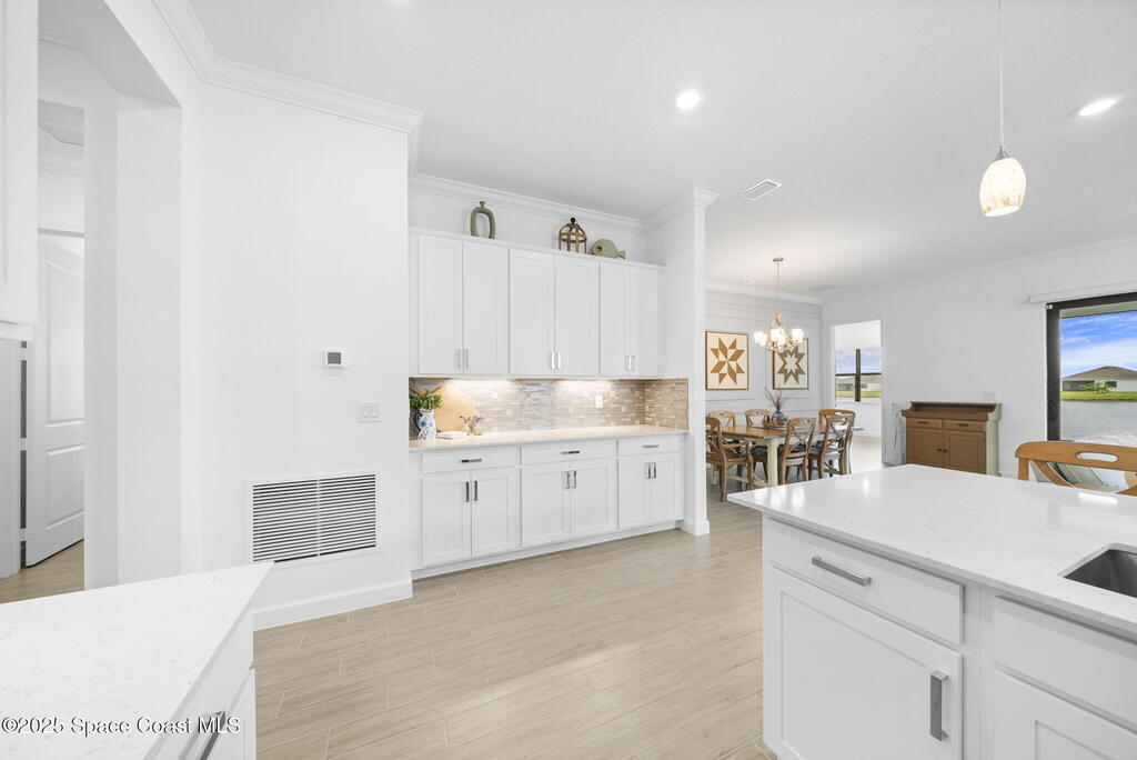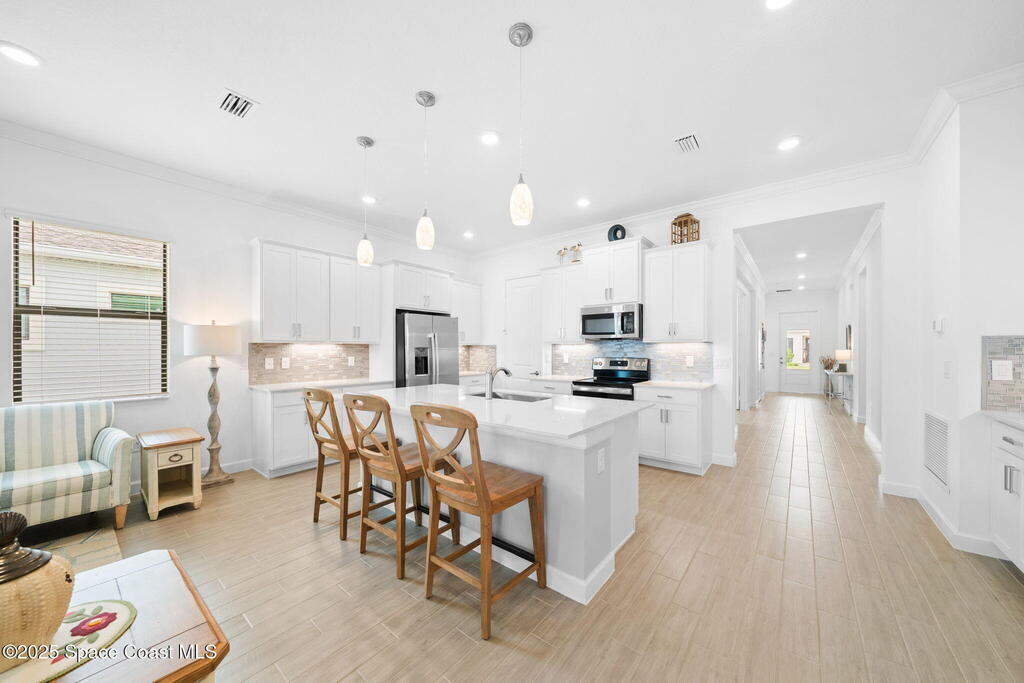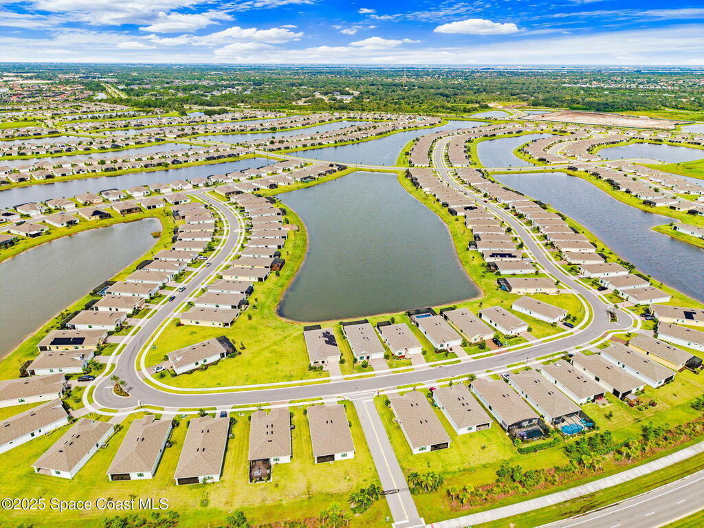 Welcome to Bridgewater at Viera, one of Brevard's most sought-after 55+ communities. Great value here! This 3 bedroom + FLEX room with closet, 3.5 bath home was built in 2023 and offers the popular Key Largo floor plan with 2,375 SF of thoughtfully designed living space. Inside, you'll find an open layout with upgraded PLANK TILE floors throughout (no carpet!), CROWN MOLDING, and all IMPACT WINDOWS and sliders. The kitchen is a showstopper with crisp white cabinetry, QUARTZ countertops, tile backsplash, and plenty of space for entertaining. The primary suite feels like a private retreat, featuring a spa-style bath with double vanities, an oversized walk-in shower, and a huge closet. Two of the guest bedrooms have their own PRIVATE en-suites, perfect for visiting family or friends. Step outside to a screened-in patio overlooking PANARAMIC LAKE VIEWS with southeast exposure, perfect for sipping coffee during sun-filled mornings and unwind at the end of the day with shaded evenings. MORE
