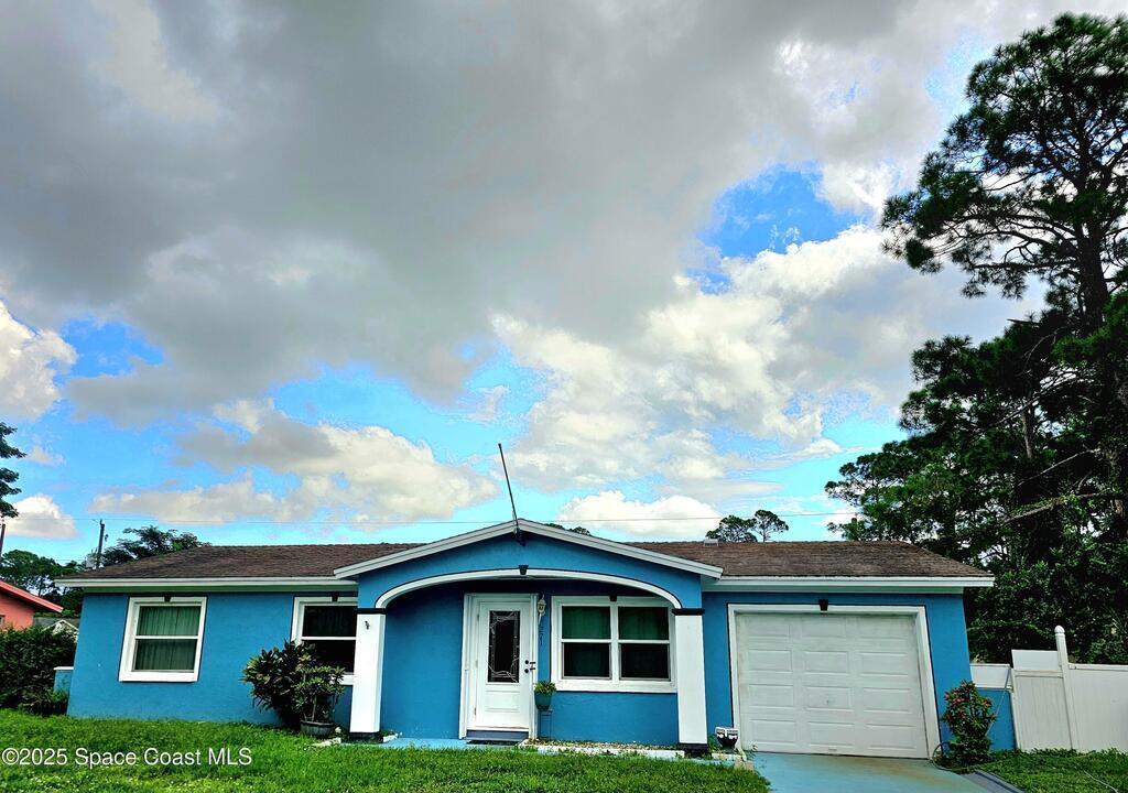 Welcome to this adorable & cozy home. Featuring a recently renovated kitchen to include new cabinets and beautiful granite countertops, and updated living room with custom wood features. The roof was replaced in 2017, ac in 2023, and there is an efficient tankless water heater. The open floor plan is spacious and charming. There are 3 freshly painted bedrooms, one and a half bathrooms, and there is tile flooring throughout. There is an attached one car garage and large fenced yard. No HOA, solid concrete construction, and city water. Conveniently located in SE Palm Bay near shopping centers, restaurants and quick access to I 95.