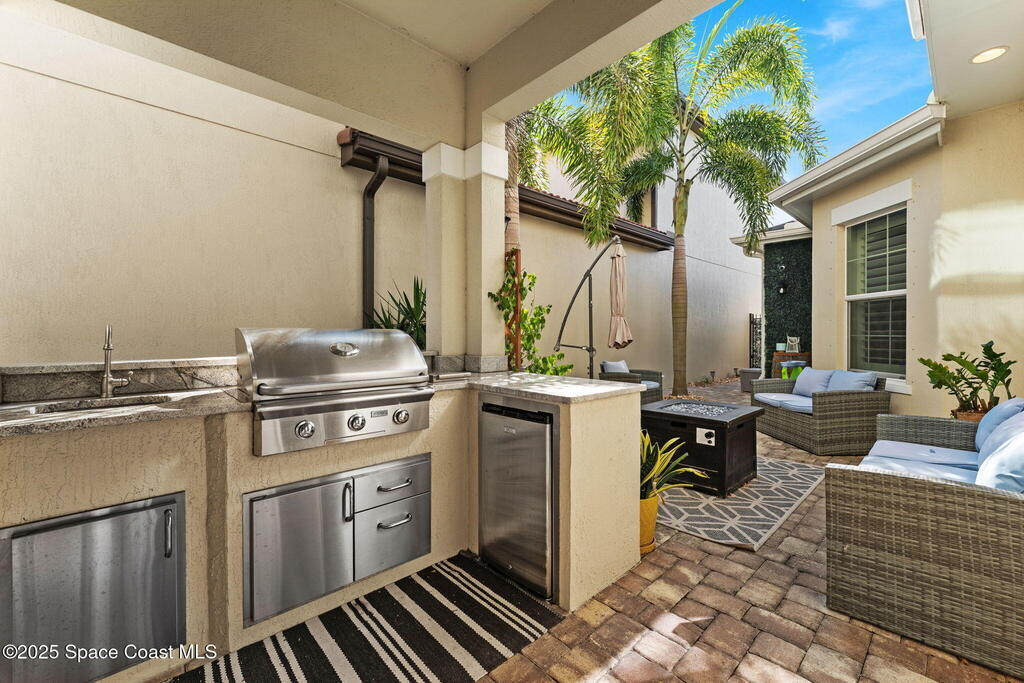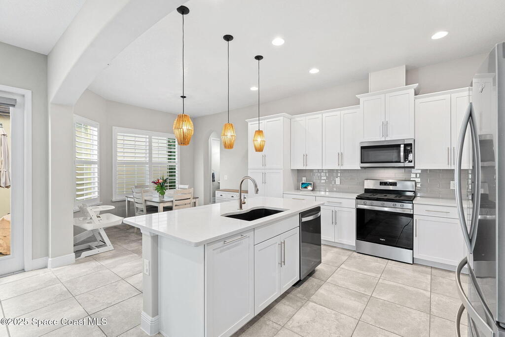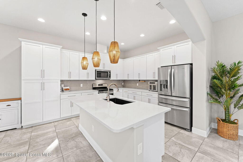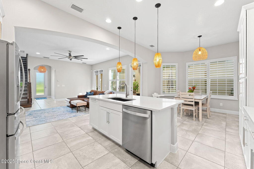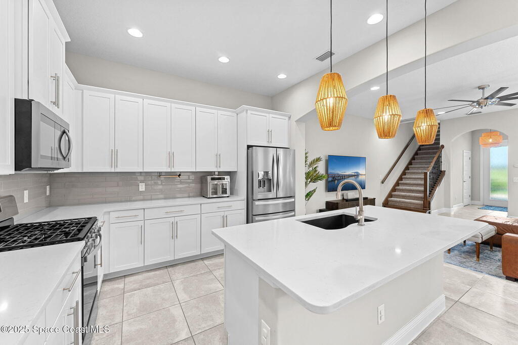 Golf course & lake views make the backdrop for this nearly new home, showcasing the neighborhood's best floorplan in its most coveted location. Freshly painted interiors shine with upgrades including plantation shutters, new carpet, designer lighting, and wall-to-wall tile flooring. The kitchen is a showstopper with quartz counters, a glass tile backsplash, and 42'' white cabinetry, while a summer kitchen makes outdoor dining effortless. Upstairs, all three bedrooms--including the expansive owner's suite--are thoughtfully placed with the laundry for convenience. A private paver patio offers peace & privacy, and the oversized 3-car garage elevates function with built-in storage, upgraded fixtures, and epoxy flooring. Beyond the home, the community lifestyle is unmatched w/ a pool, playground, park area, jogging & bike trails, & endless ways to enjoy the outdoors. With water views, modern finishes, and exceptional amenities, this property blends beauty, convenience & resort-style living.