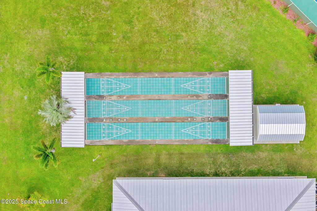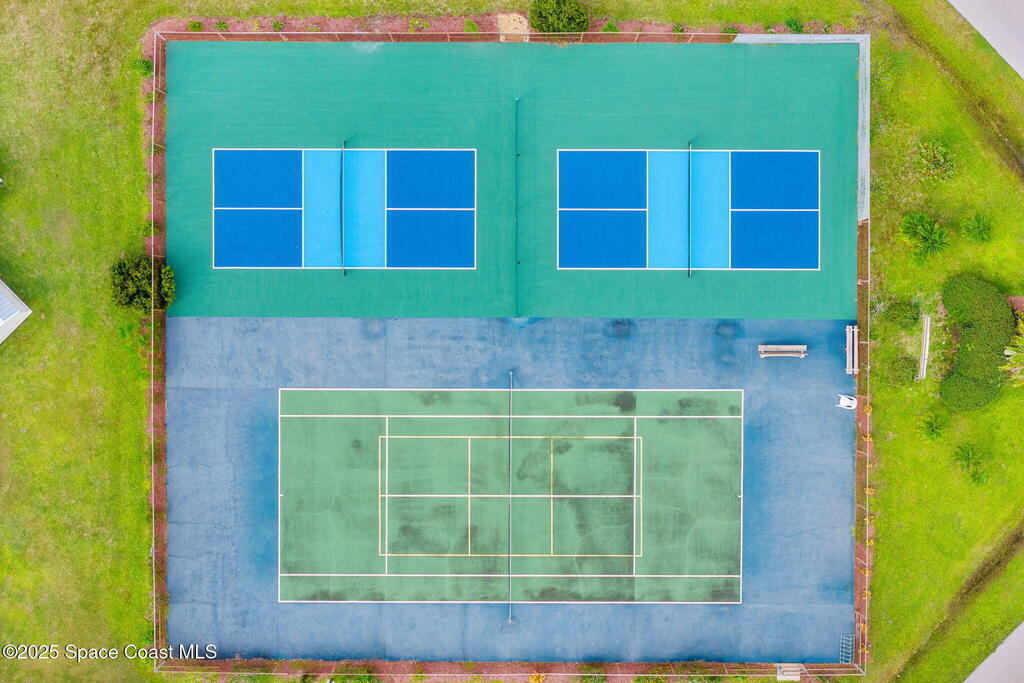 In the 55+ community of Palm Bay Colony, this home blends thoughtful updates with inviting charm. A 2018 metal roof, newer Pella windows, and 2024 AC provide peace of mind, while the kitchen--remodeled in 2016 with all-wood cabinetry, granite counters, and stainless appliances--anchors the living space. Both baths have been refreshed, including a walk-in shower in the primary, complemented by a spacious bedroom with walk-in closet. Everyday ease is enhanced by a newer washer/dryer and multiple storage options, including a large storage room, enclosed workshop, and two lanais--one tiled and enclosed, the other covered and overlooking the fenced backyard with cheerful yellow siding, gutters, and flower beds adding curb appeal. Storm protection features clamshell awnings and Lexan panels. Residents enjoy a vibrant lifestyle with a clubhouse, pool, tennis, and shuffleboard.