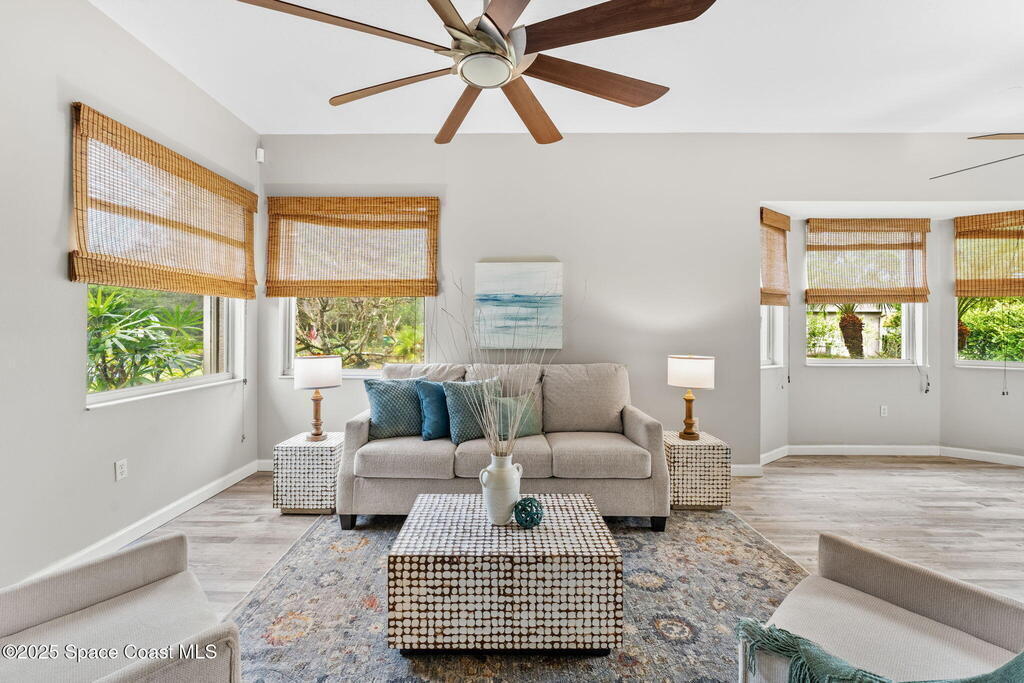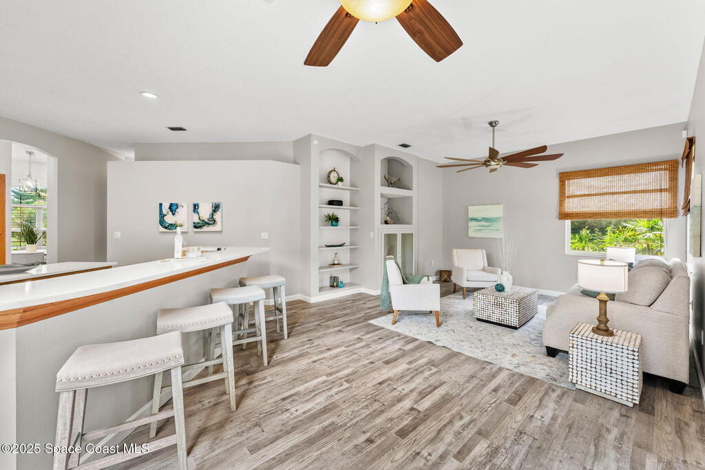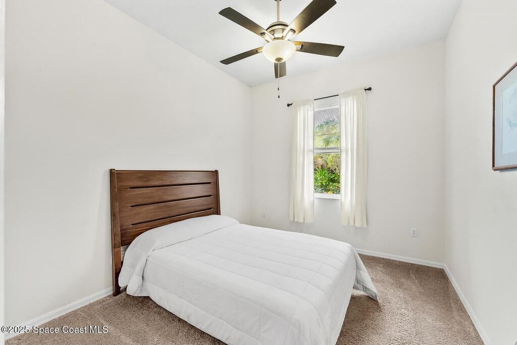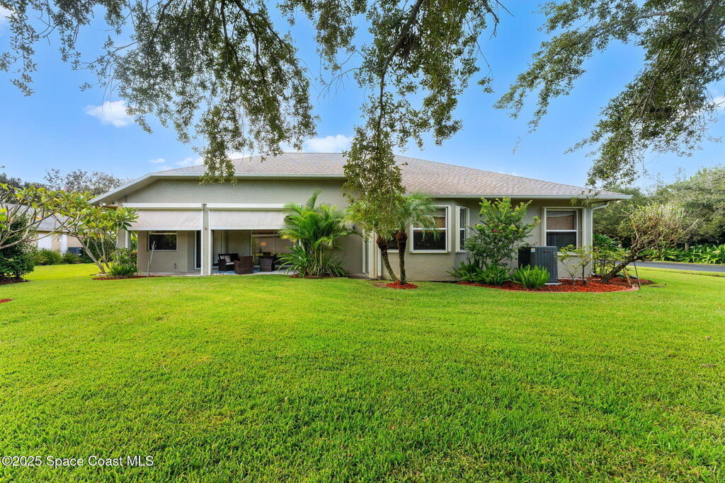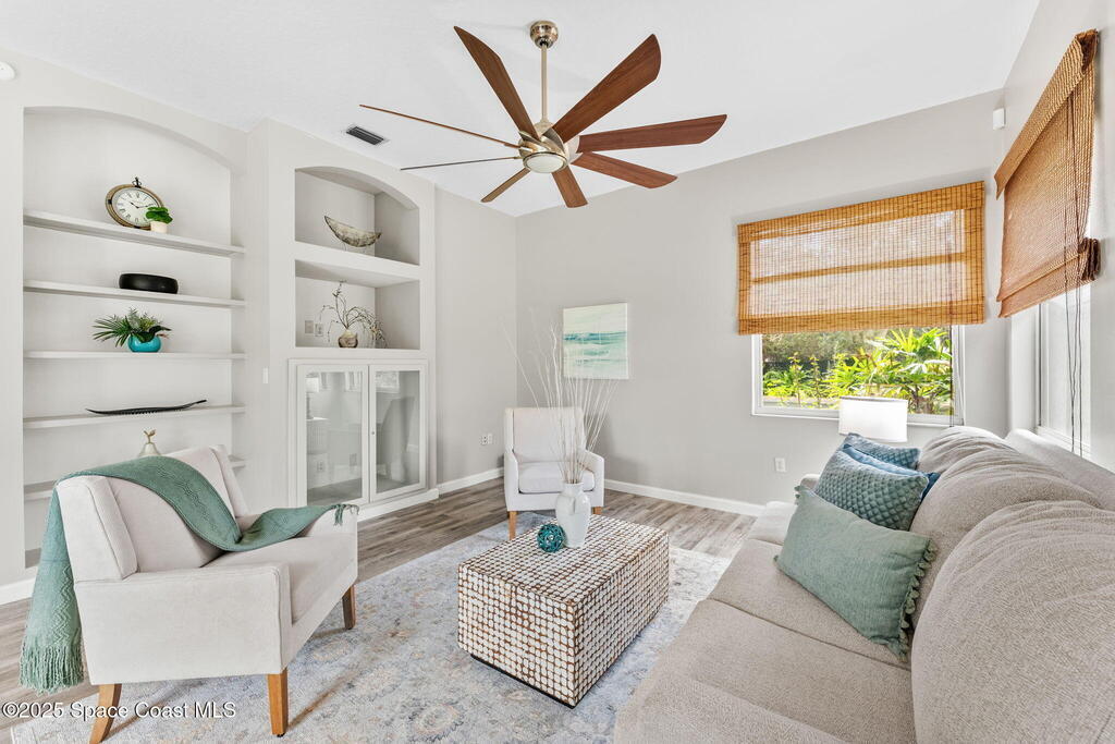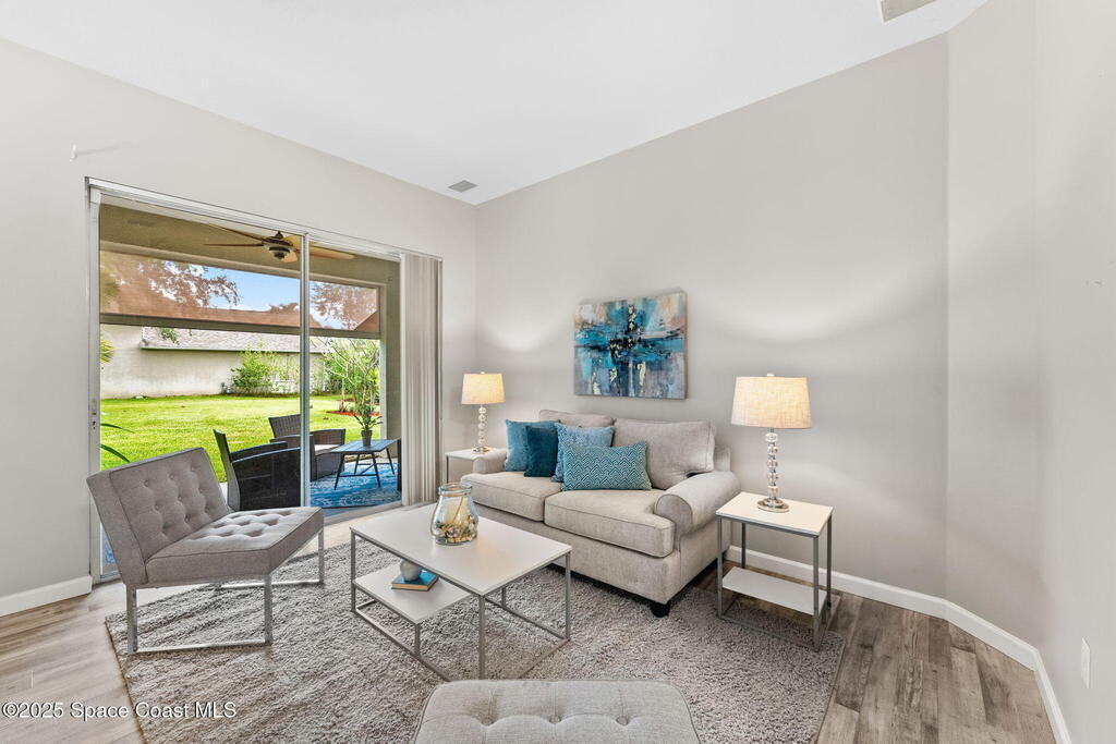 Located in Baytree's gated golf community, this 4-bedroom, 2-bath home blends comfort, security, and style. Accordion shutters cover every window, with electric screen shutters enclosing the patio for instant storm protection. A 2019 roof, 2022 HVAC, and 2020 water heater add confidence, while crown molding and updated flooring define the interiors. The kitchen is designed to impress with quartz counters, a large island, stainless steel appliances, solid wood cabinetry, pantry, breakfast bar, and wine cooler. Bedrooms are finished in carpet, baths in tile, and main spaces in durable laminate/LVP. Beyond the home, Baytree offers resort-style amenities including a pool, clubhouse, tennis courts, and picnic pavilions, all just moments from The Avenue Viera, where premier shopping, dining, and entertainment define the lifestyle.