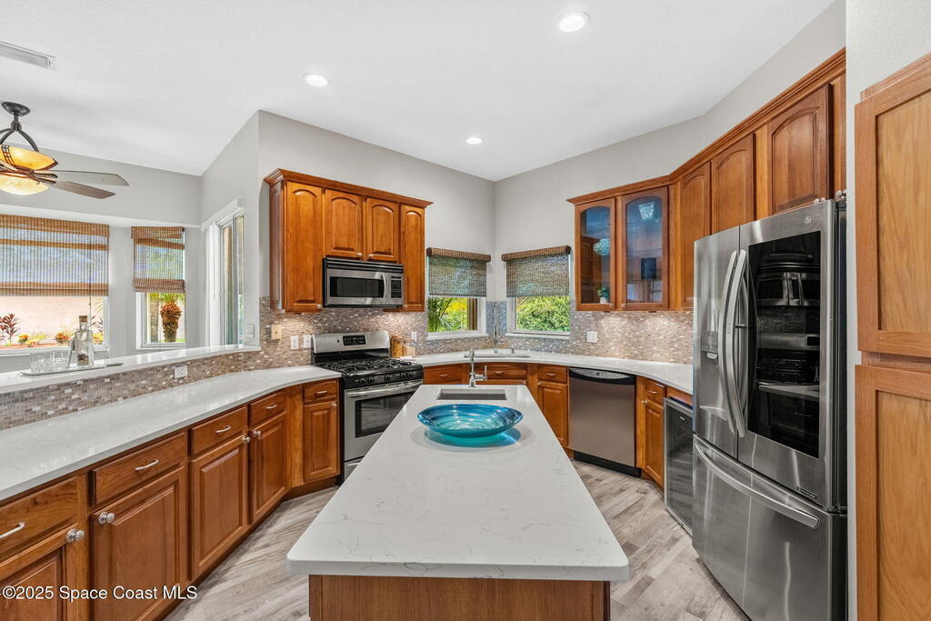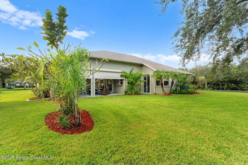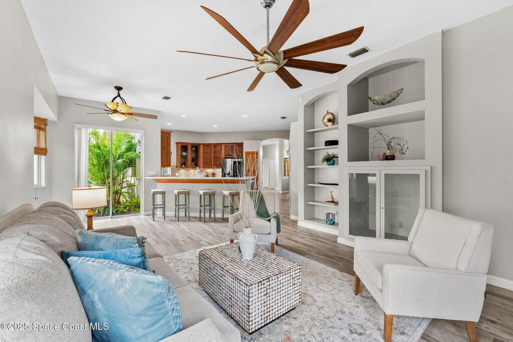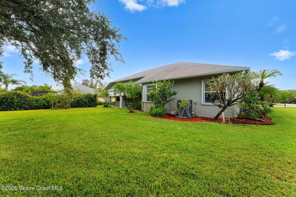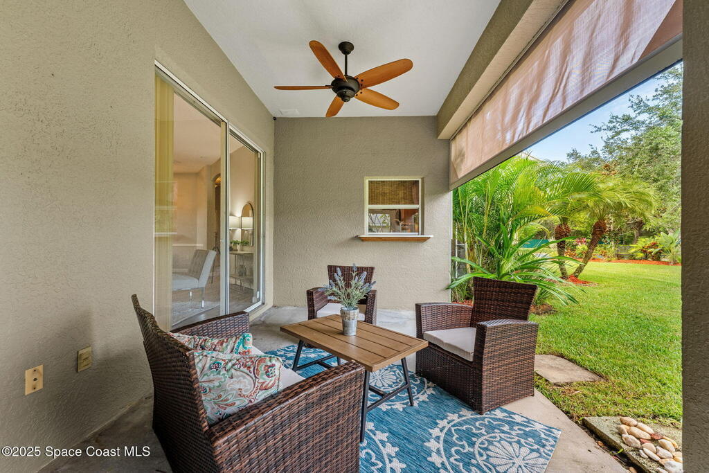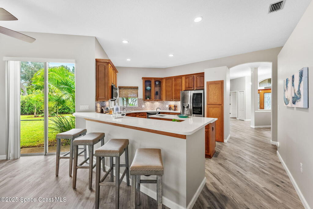 Located in Baytree's gated golf community, this 4-bedroom, 2-bath home blends comfort, security, and style. Accordion shutters cover every window, with electric screen shutters enclosing the patio for instant storm protection. A 2019 roof, 2022 HVAC, and 2020 water heater add confidence, while crown molding and updated flooring define the interiors. The kitchen is designed to impress with quartz counters, a large island, stainless steel appliances, solid wood cabinetry, pantry, breakfast bar, and wine cooler. Bedrooms are finished in carpet, baths in tile, and main spaces in durable laminate/LVP. Beyond the home, Baytree offers resort-style amenities including a pool, clubhouse, tennis courts, and picnic pavilions, all just moments from The Avenue Viera, where premier shopping, dining, and entertainment define the lifestyle.