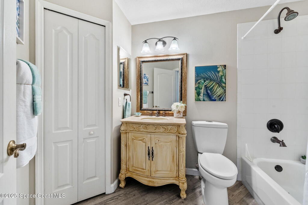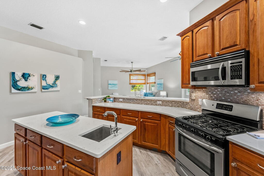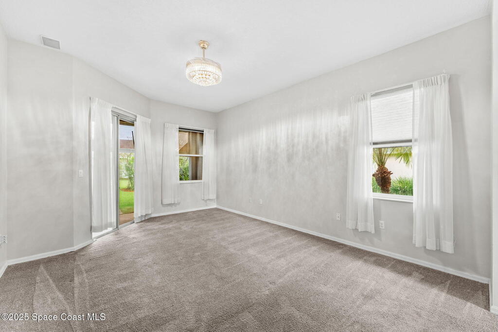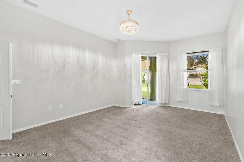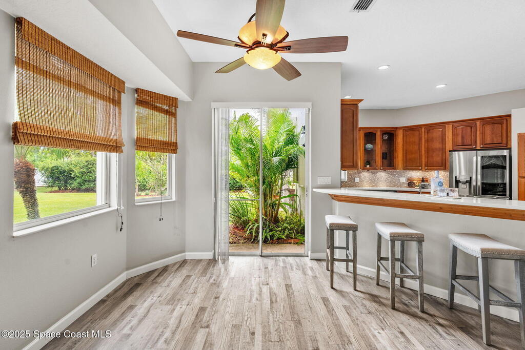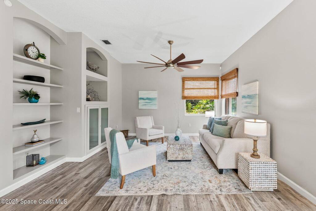 Located in Baytree's gated golf community, this 4-bedroom, 2-bath home blends comfort, security, and style. Accordion shutters cover every window, with electric screen shutters enclosing the patio for instant storm protection. A 2019 roof, 2022 HVAC, and 2020 water heater add confidence, while crown molding and updated flooring define the interiors. The kitchen is designed to impress with quartz counters, a large island, stainless steel appliances, solid wood cabinetry, pantry, breakfast bar, and wine cooler. Bedrooms are finished in carpet, baths in tile, and main spaces in durable laminate/LVP. Beyond the home, Baytree offers resort-style amenities including a pool, clubhouse, tennis courts, and picnic pavilions, all just moments from The Avenue Viera, where premier shopping, dining, and entertainment define the lifestyle.