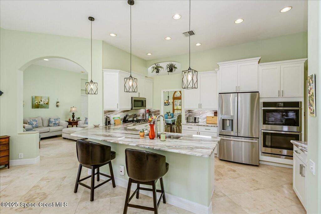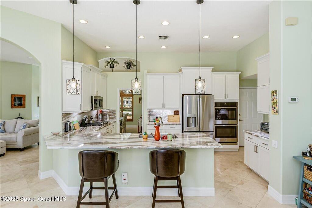 DECEMBER SELLER CONCESSION of $5,000 is being offered at Closing to be used at Buyer's discretion. MOTIVATED SELLER! 4 bdrm/3 bath recently upgraded home on the 8th Tee at Baytree National Golf Course gated community! Awesome view overlooking the heated pool/spa across the pond! This home has ''zero clearance entry'' thru double front doors & in primary shower. Spacious home w/higher ceilings, open floor plan, split bedrms. This home has both a Family Room, Living Room & a Dining Room. All tile floors thruout! There is a long list of upgrades including recent extra wide paver driveway/patio & front entry! All newer windows w/accordion shutters. Plantation shutters & wood blinds. The recently updated kitchen includes solid wood Shaker style cabinets & granite countertops & granite backsplash w/undermount lighting! Newer pendant lighting. All newer gas 5 burner cooktop, French door refrigerator w/indoor ice & water,