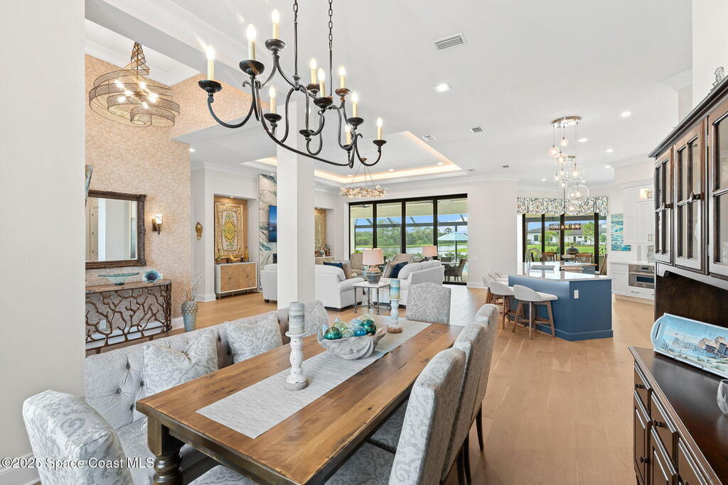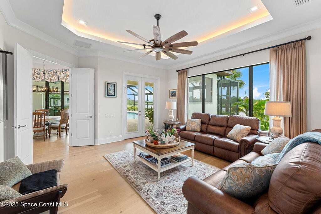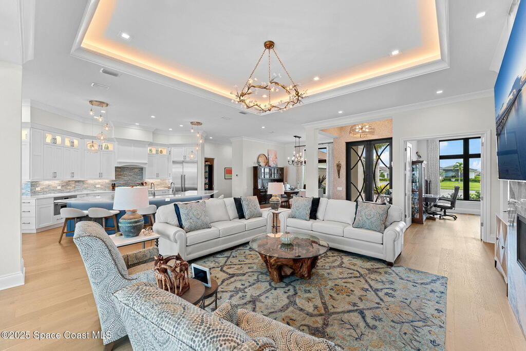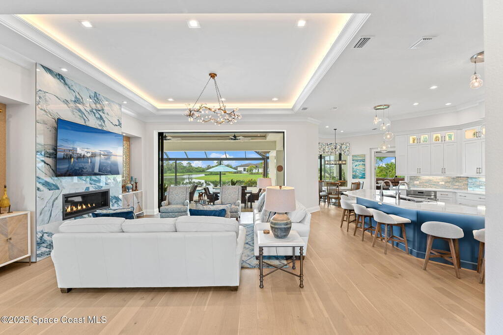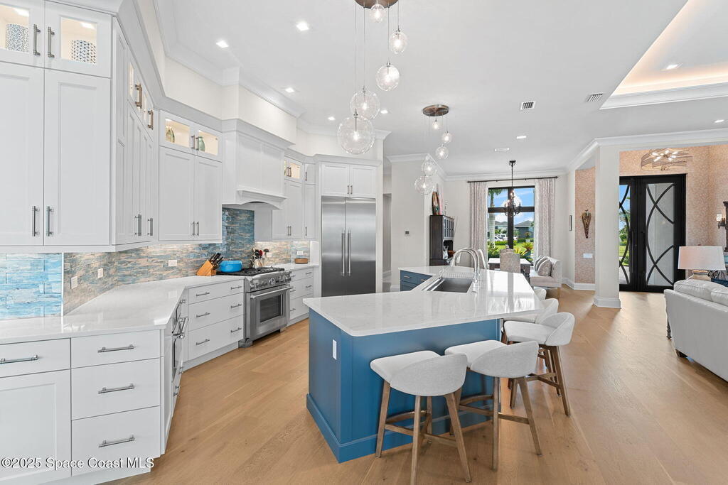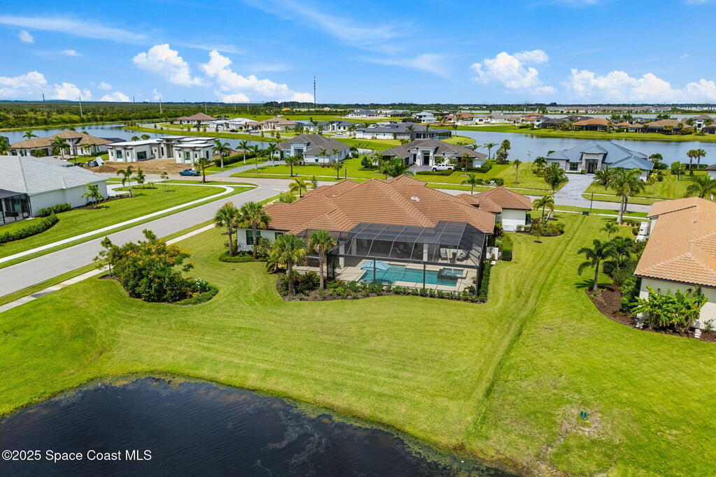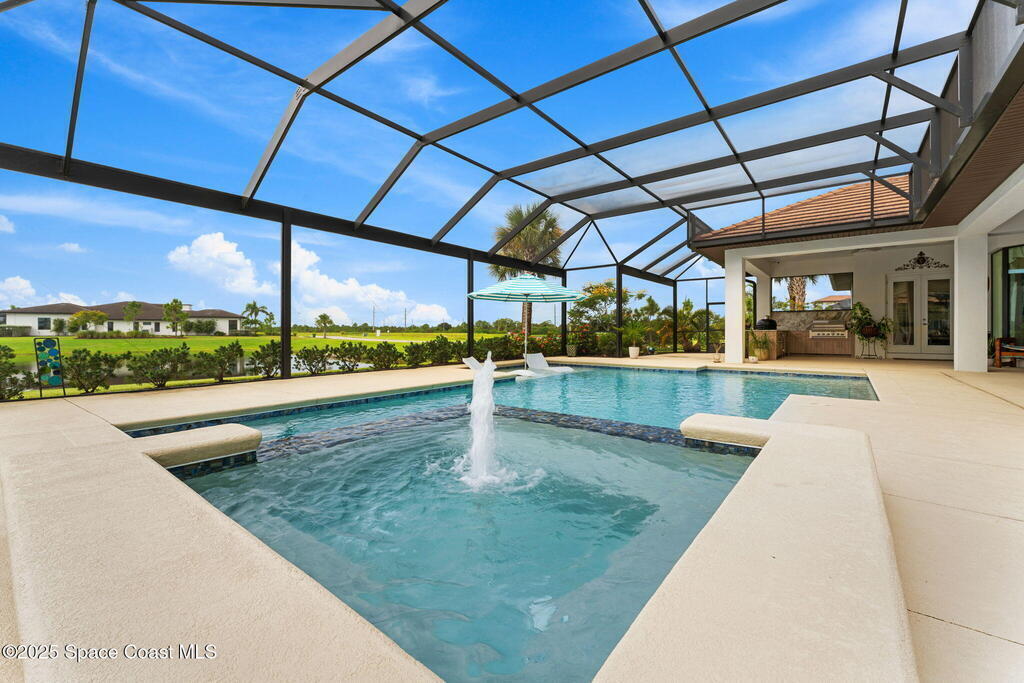 Grand scale & resort living combine in this 4,222 sq ft custom home on a .70-acre corner lot with breathtaking lake & preserve views. A dramatic 14' foyer with iron double doors opens to oak hardwood floors, soaring ceilings, & walls of glass. The kitchen is a culinary showpiece--quartz counters, custom white cabinetry, Thermador appliances, 6-burner gas range, oversized pantry with coffee bar, & a 52'' stainless sink with dual faucets. Each bedroom offers a private en suite, while the primary suite stuns with dual custom closets & tray ceiling. Living areas center on a porcelain gas fireplace & flexible spaces designed for entertaining or retreat. Step outside to a private paradise: heated saltwater pool, spa, wood-planked lanai, summer kitchen, natural-gas firepit, & picture-panel screening that frames the view. Two oversized 2-car garages, whole-house generator, advanced water systems, & lush landscaping complete this luxury statement.