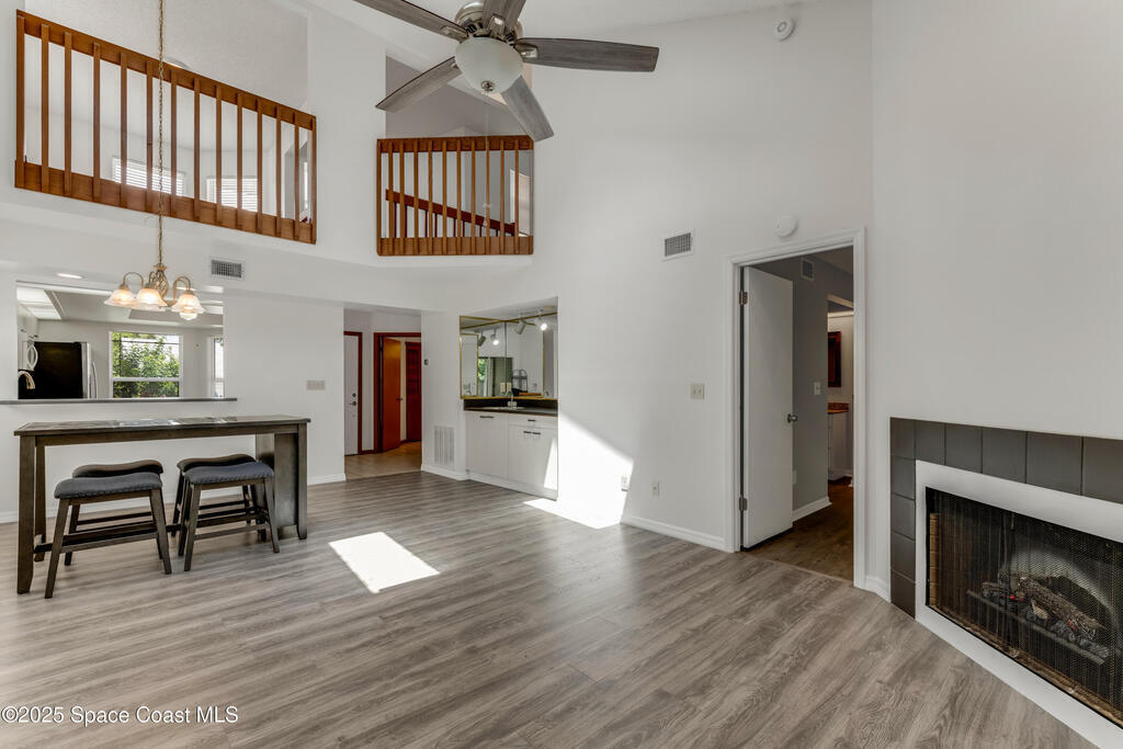 PRICED TO SELL! Discover the charm of this beautiful end-unit townhouse, nestled in a serene waterside setting. Step into the welcoming foyer, which leads to a convenient updated half-bath/laundry room. The spacious kitchen flows seamlessly into the large, vaulted dining and family room, where new flooring, baseboards and painting create a fresh, inviting ambiance. Entertain from the built in bar with sink then sit by the cozy electric fireplace or unwind on the private lanai, newly screened and carpeted. This home offers two spacious bedrooms and a versatile loft that can serve as a third bedroom. The first-floor master suite features a walk-in closet, updated his-and-her vanities, new flooring, and direct access to the lanai. With numerous upgrades throughout, this home combines modern convenience with tranquil living. Newly painted interior, garage door/opener.