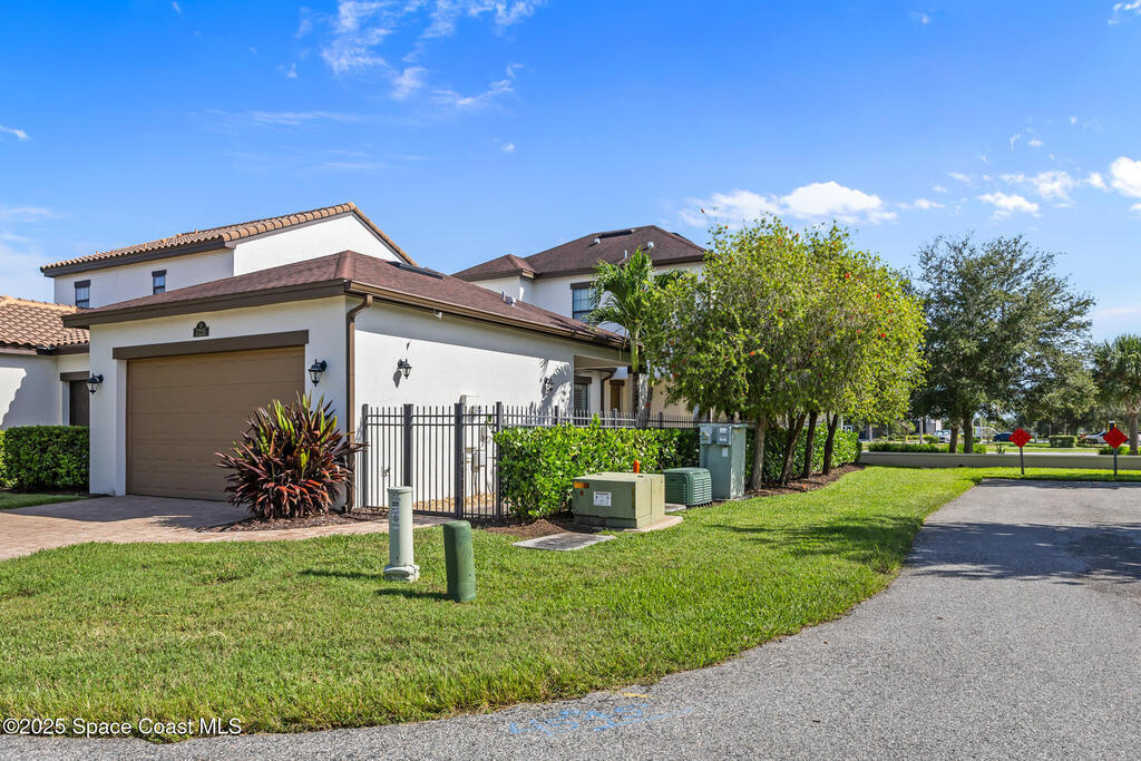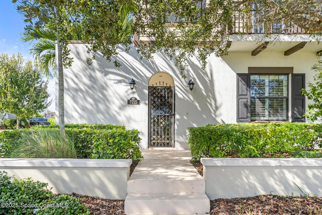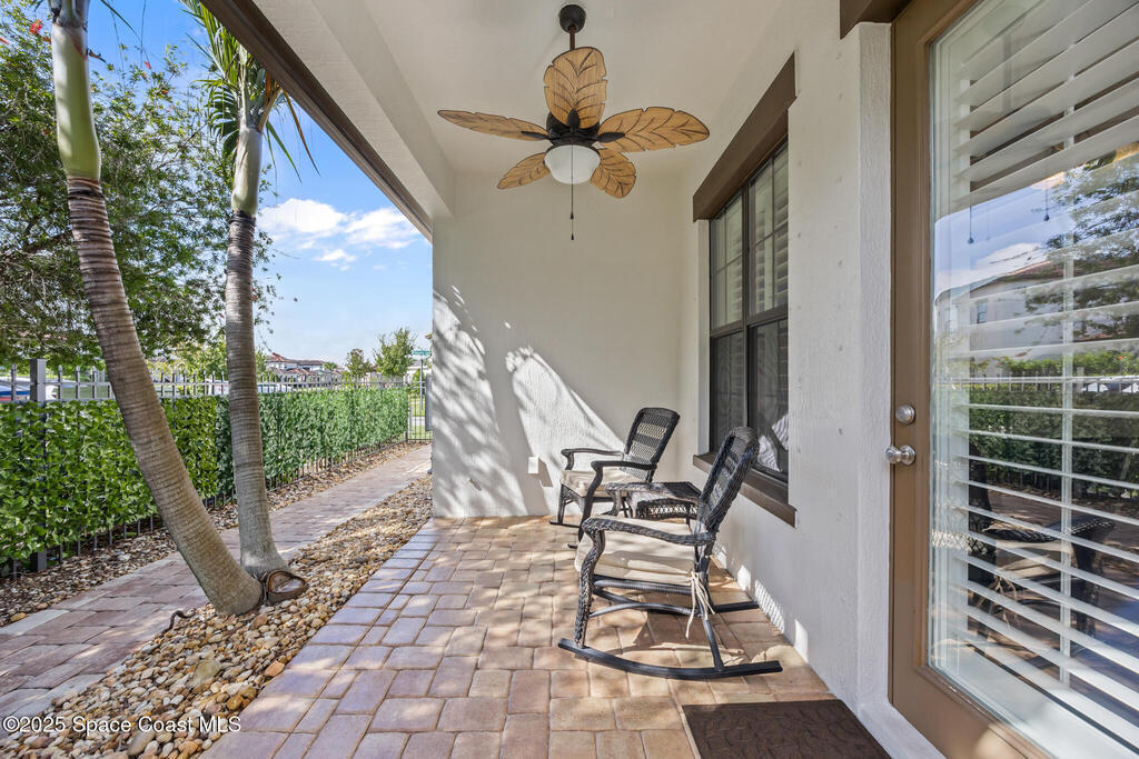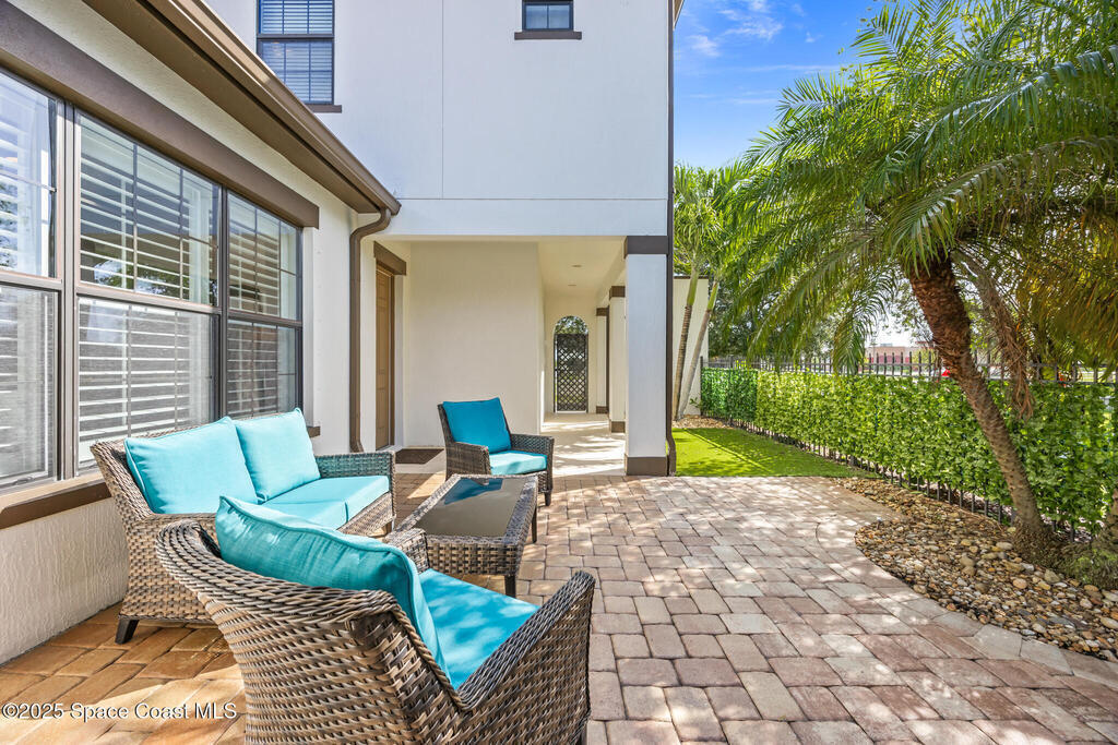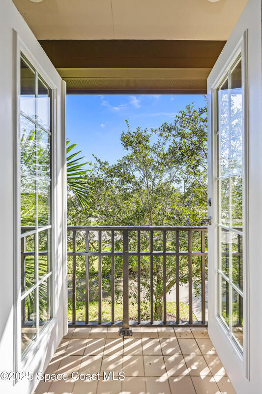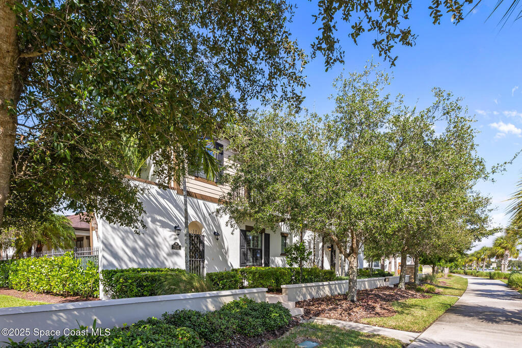 Located in Arrivas Village, directly across from The Avenues in Viera, this Aflora floor plan blends style with convenience. Inside, the open living, dining, and kitchen area features 24'' tile floors, granite counters, gas range, and plantation shutters for a crisp finish. The downstairs primary suite offers a double-door entry, walk-in closet, dual sinks with granite, garden tub, and step-in shower. Upstairs, two carpeted bedrooms share a Jack-and-Jill bath with dual sinks, plus a Juliette balcony and oversized closet. Hurricane-rated windows upstairs, panels for downstairs, and a hurricane rated garage door add peace of mind. Extras include a tankless gas water heater, and paved covered patio with privacy, and two sets of laundry connections. Enjoy modern living steps from shopping, dining, and entertainment.