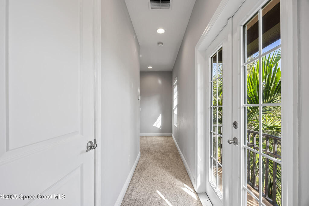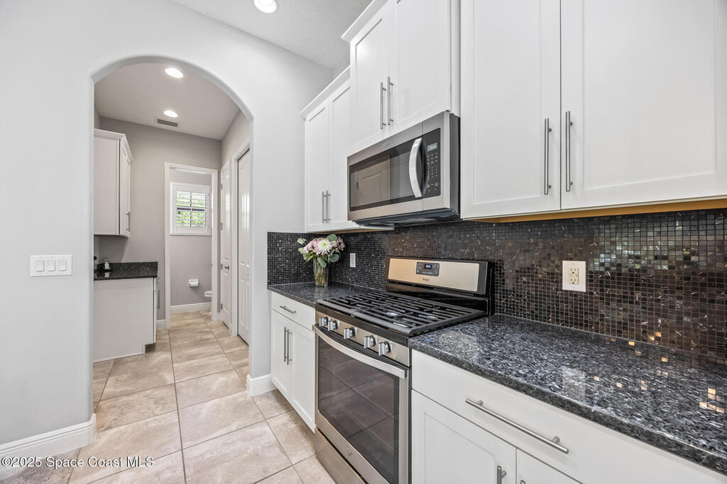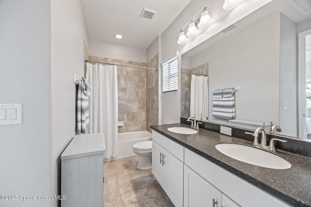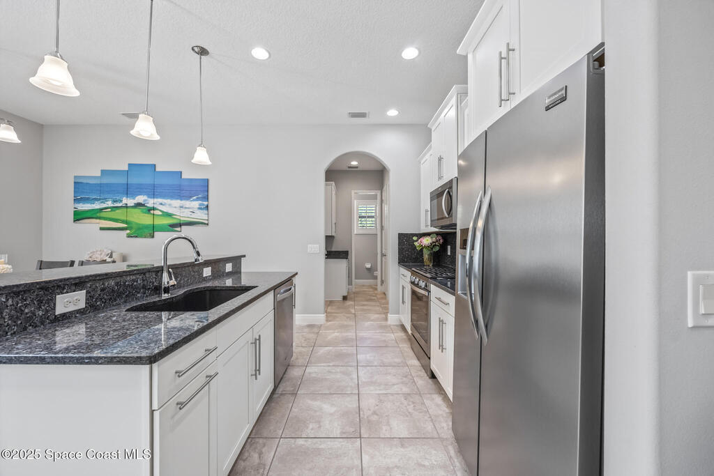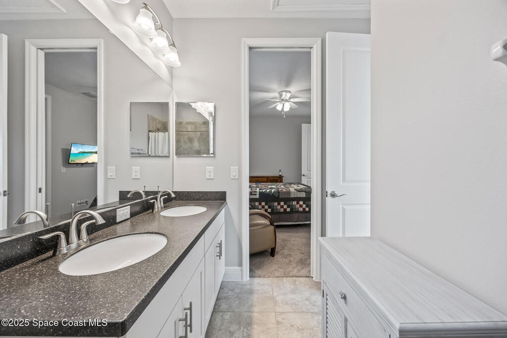 Located in Arrivas Village, directly across from The Avenues in Viera, this Aflora floor plan blends style with convenience. Inside, the open living, dining, and kitchen area features 24'' tile floors, granite counters, gas range, and plantation shutters for a crisp finish. The downstairs primary suite offers a double-door entry, walk-in closet, dual sinks with granite, garden tub, and step-in shower. Upstairs, two carpeted bedrooms share a Jack-and-Jill bath with dual sinks, plus a Juliette balcony and oversized closet. Hurricane-rated windows upstairs, panels for downstairs, and a hurricane rated garage door add peace of mind. Extras include a tankless gas water heater, and paved covered patio with privacy, and two sets of laundry connections. Enjoy modern living steps from shopping, dining, and entertainment.