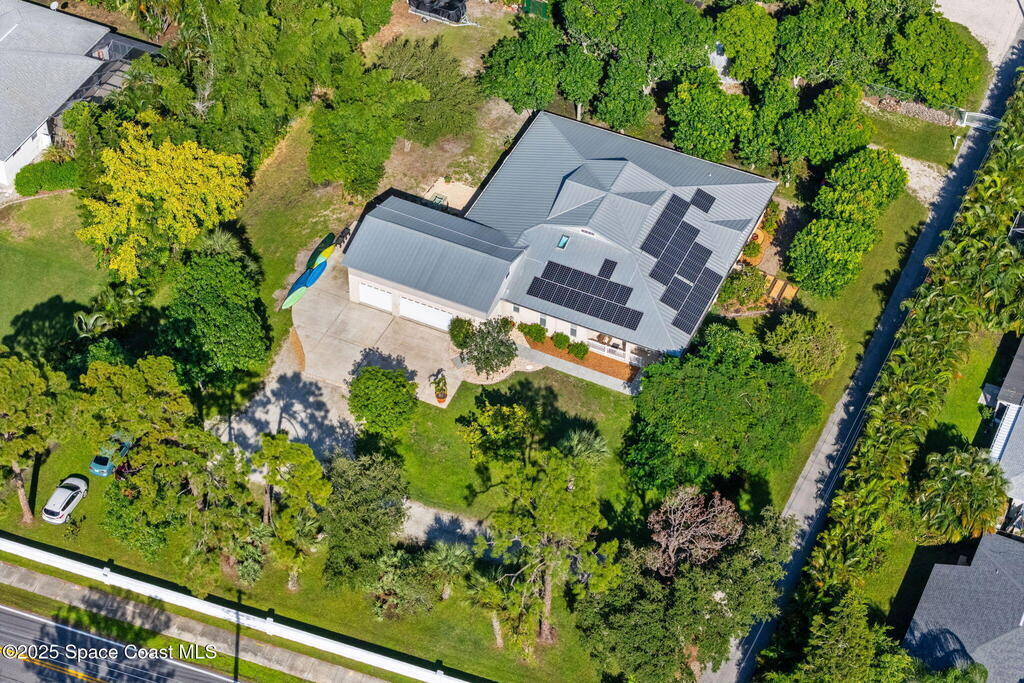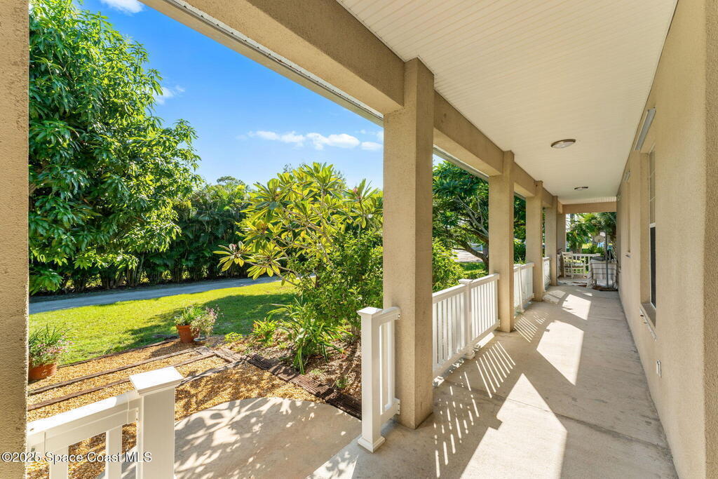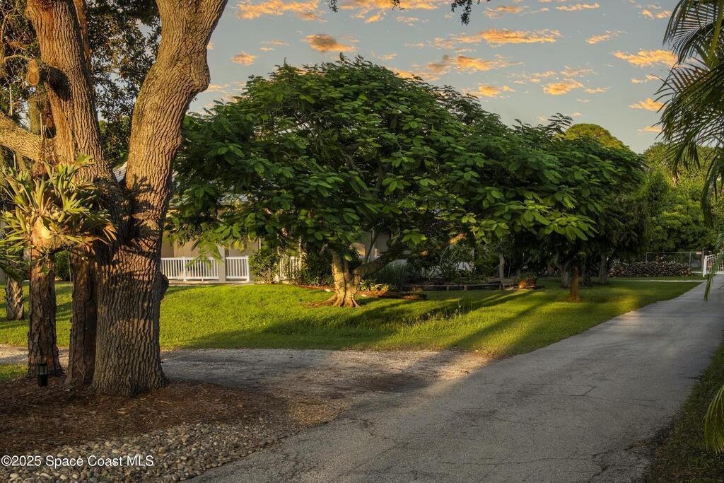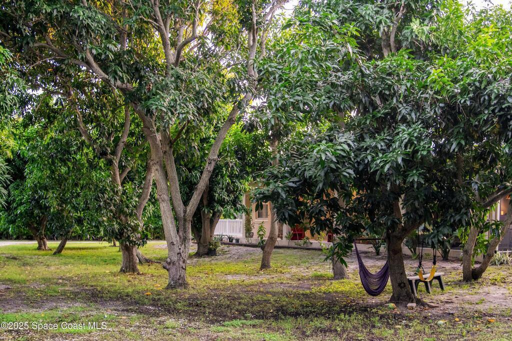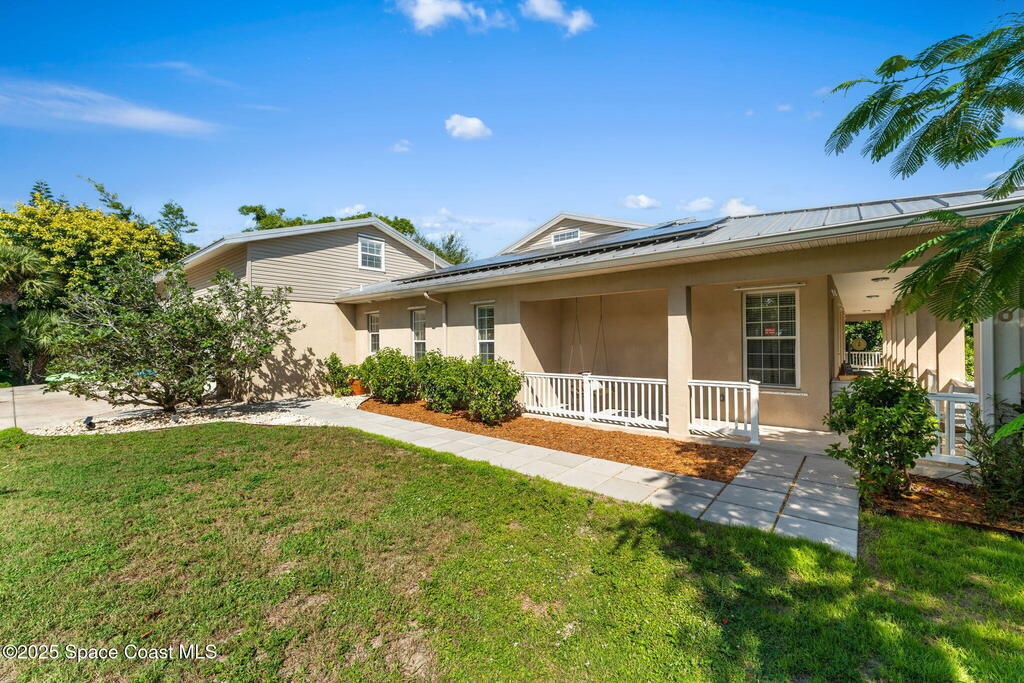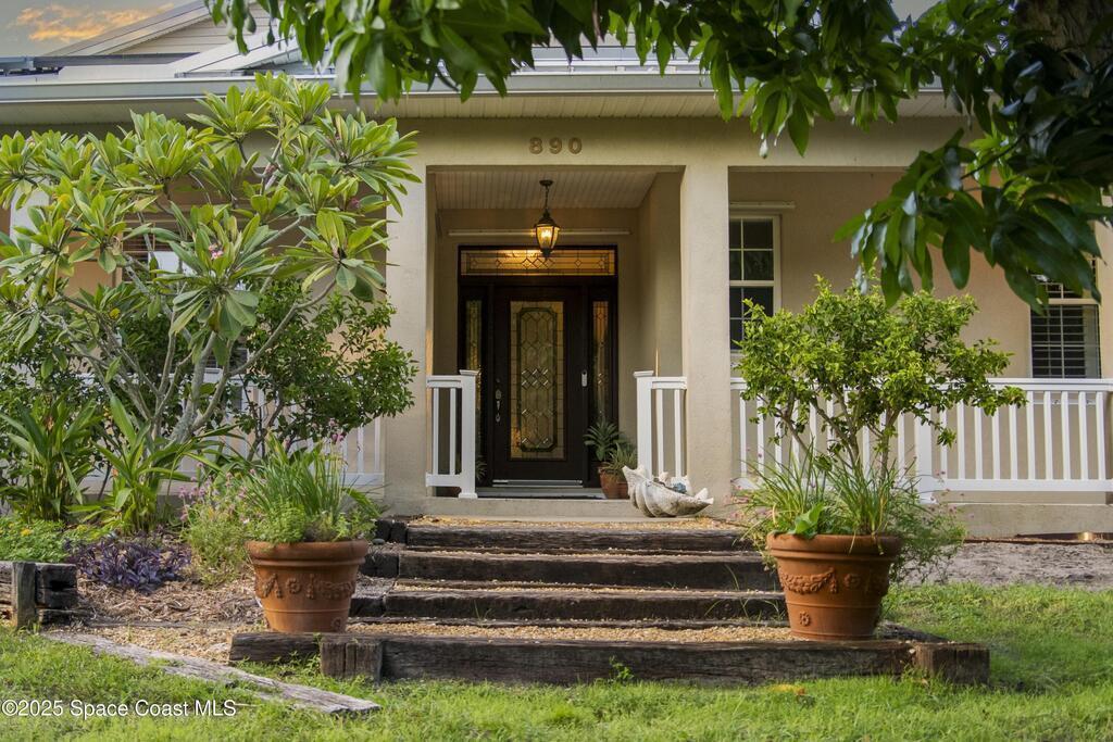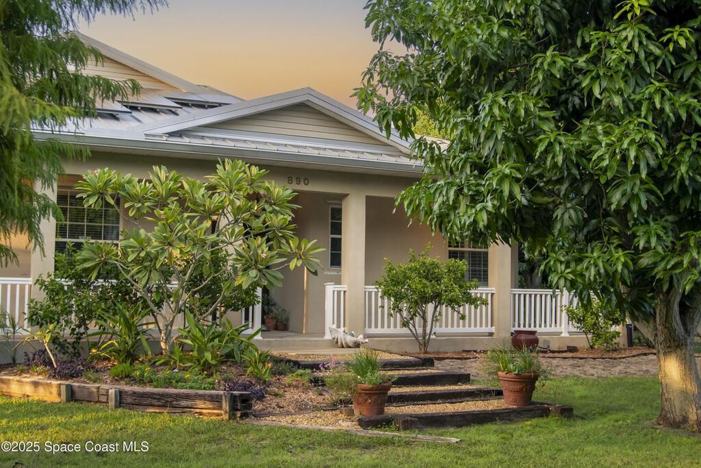 Your Florida homestead dream lives here. Architect designed and centered on a private one acre lot. This Merritt Island residence blends utility and style. 3,707 sq. ft. with 4 bedrooms, 3 baths, office, bonus game room and a 3 car garage. Durable painted concrete floors and a cook friendly corian kitchen with custom solid oak cabinetry. Outdoor living with a screened lanai and a wraparound porch under a metal roof. Practical upgrades include hurricane shutters, a whole house vacuum, a whole house attic fan, solar panels, and 50 amp service for your RV, EV, or tools. The orchard steals the show with mango, dragon fruit, avocados, and limes. Minutes to beaches, shops, and schools yet tucked away. All information deemed reliable but not guaranteed; buyer to verify.