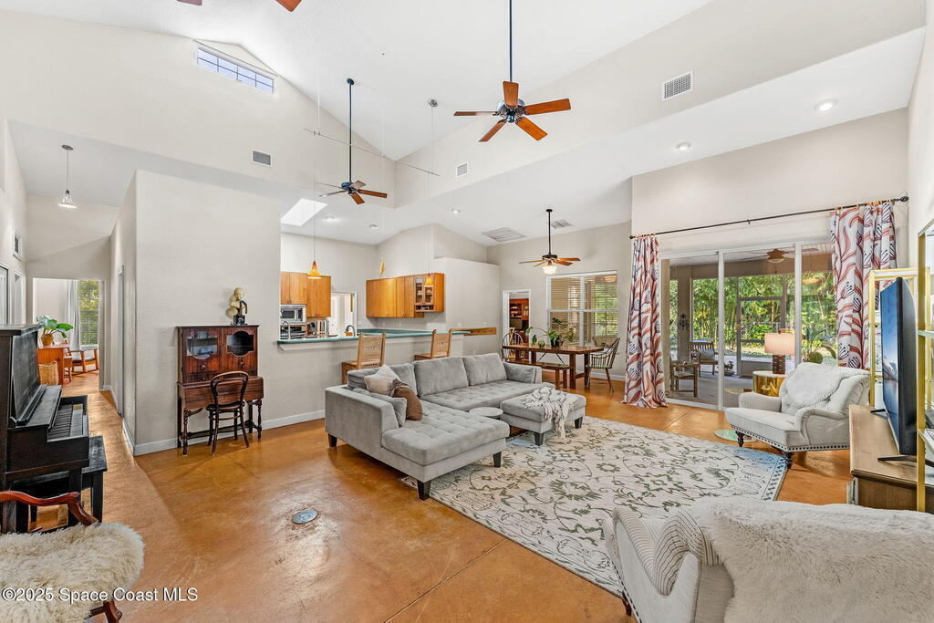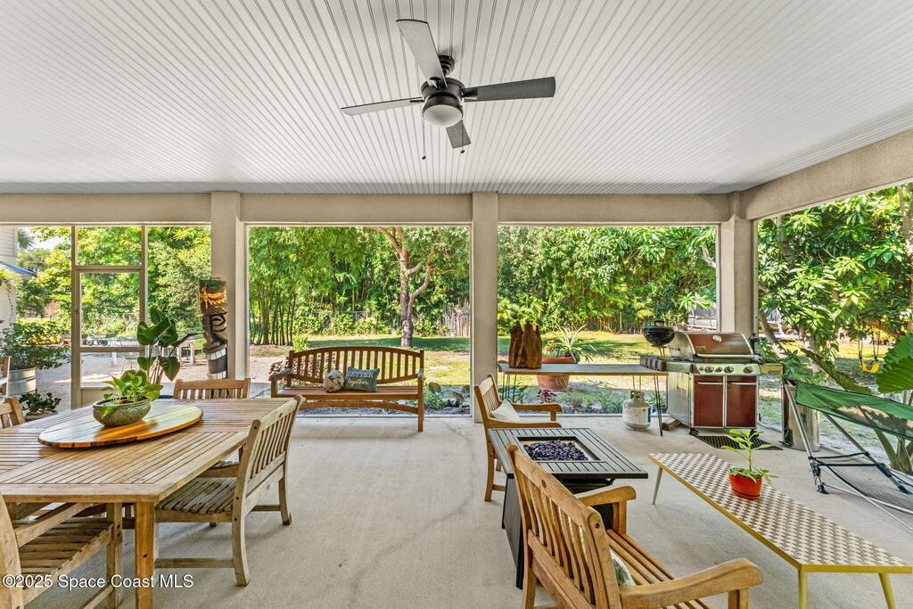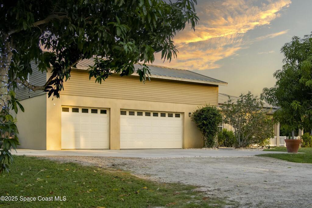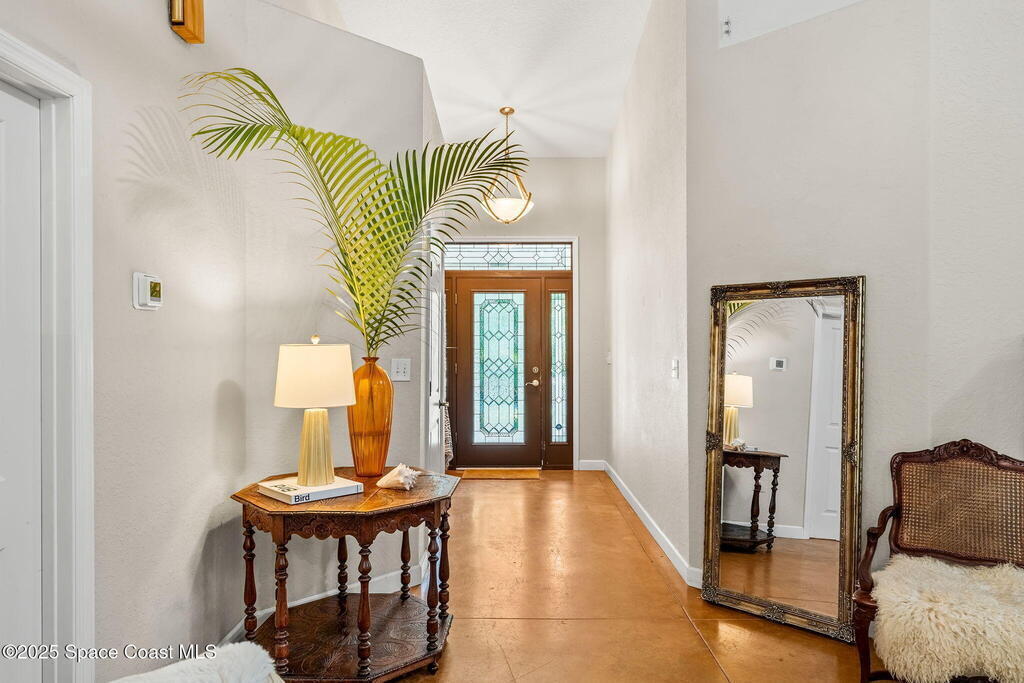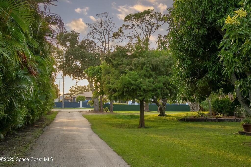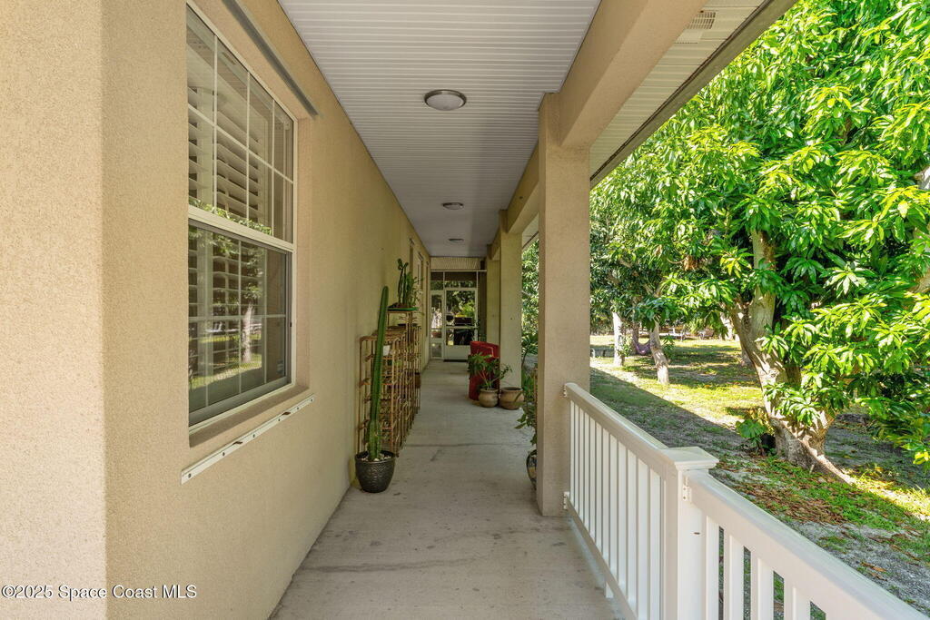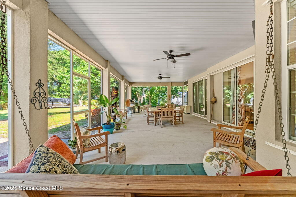 Your Florida homestead dream lives here. Architect designed and centered on a private one acre lot. This Merritt Island residence blends utility and style. 3,707 sq. ft. with 4 bedrooms, 3 baths, office, bonus game room and a 3 car garage. Durable painted concrete floors and a cook friendly corian kitchen with custom solid oak cabinetry. Outdoor living with a screened lanai and a wraparound porch under a metal roof. Practical upgrades include hurricane shutters, a whole house vacuum, a whole house attic fan, solar panels, and 50 amp service for your RV, EV, or tools. The orchard steals the show with mango, dragon fruit, avocados, and limes. Minutes to beaches, shops, and schools yet tucked away. All information deemed reliable but not guaranteed; buyer to verify.