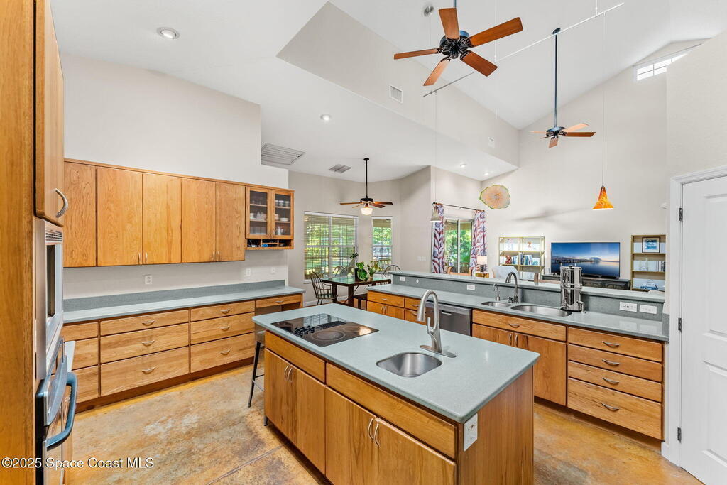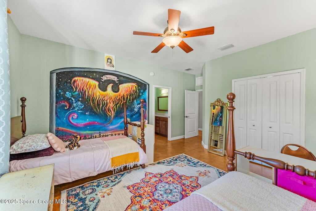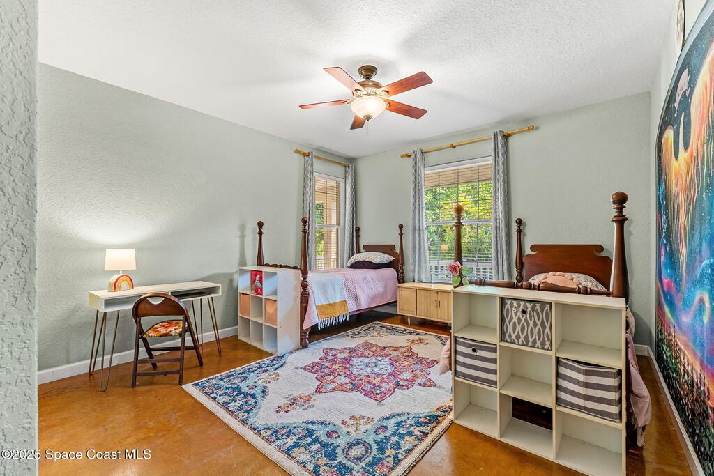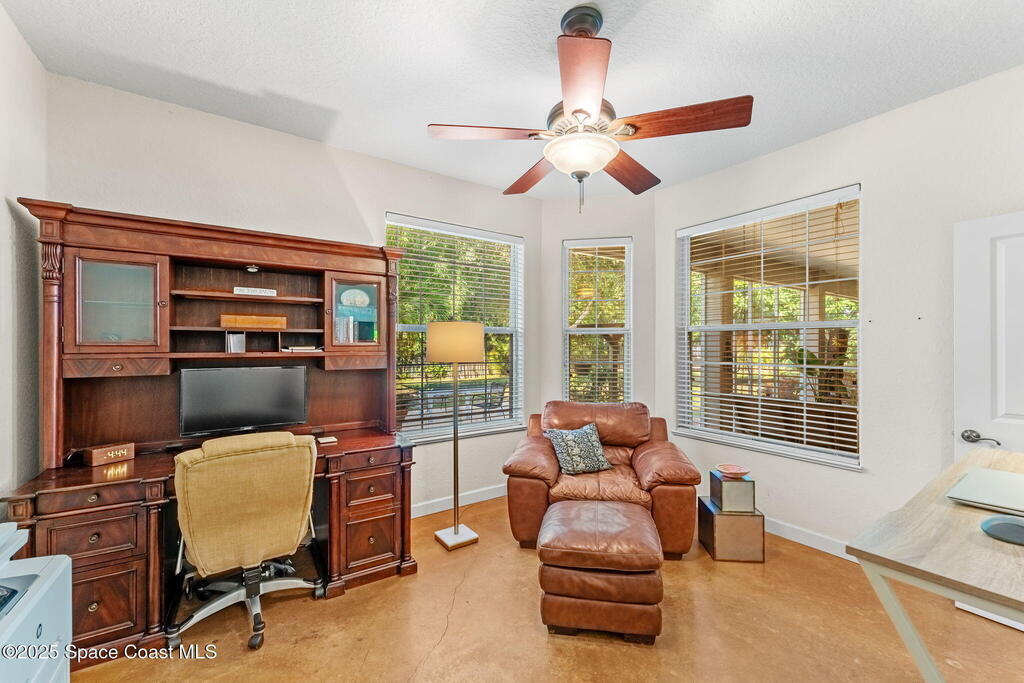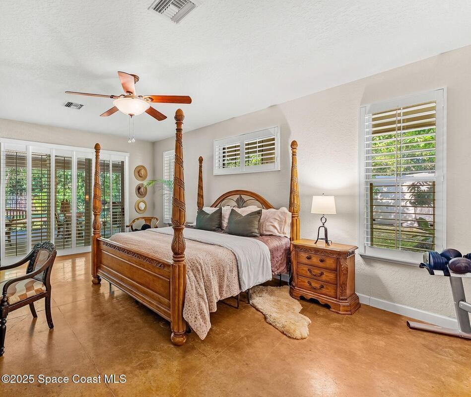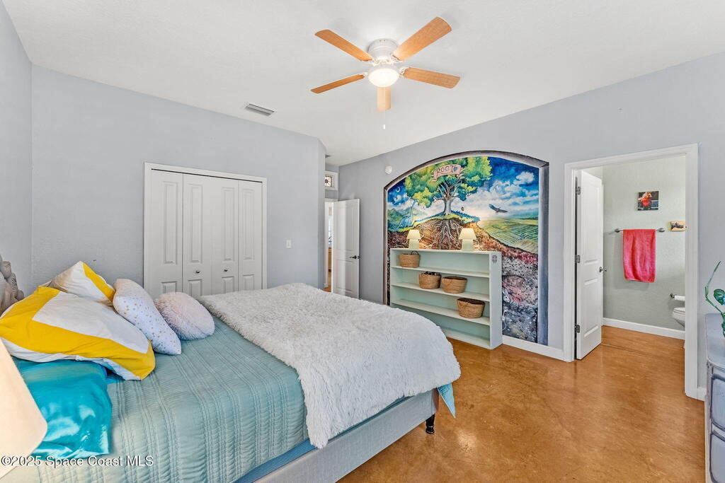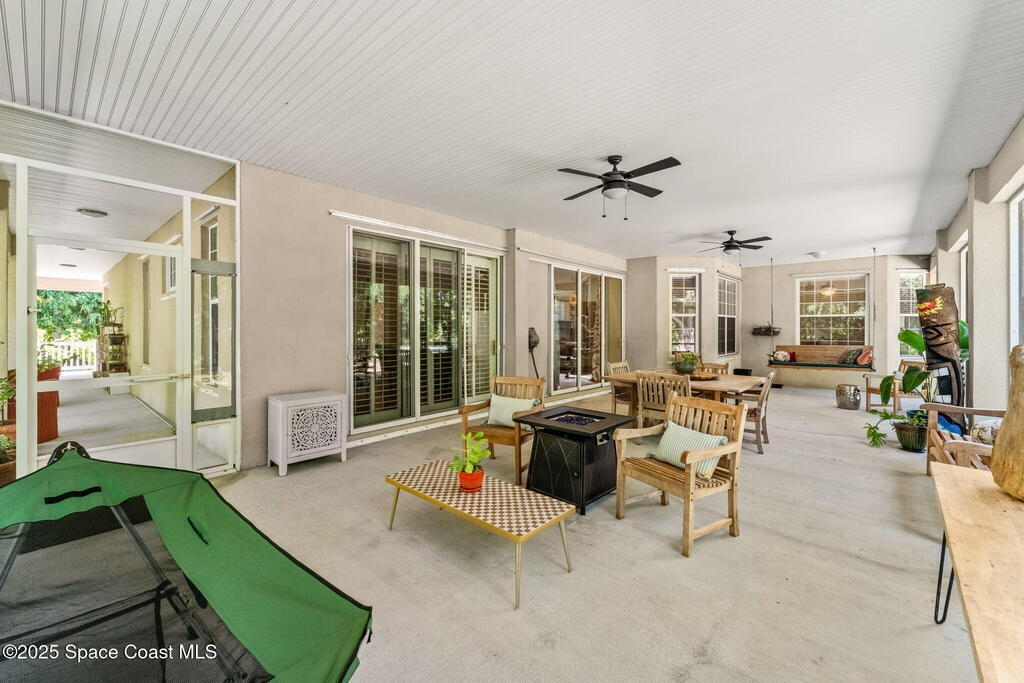 Your Florida homestead dream lives here. Architect designed and centered on a private one acre lot. This Merritt Island residence blends utility and style. 3,707 sq. ft. with 4 bedrooms, 3 baths, office, bonus game room and a 3 car garage. Durable painted concrete floors and a cook friendly corian kitchen with custom solid oak cabinetry. Outdoor living with a screened lanai and a wraparound porch under a metal roof. Practical upgrades include hurricane shutters, a whole house vacuum, a whole house attic fan, solar panels, and 50 amp service for your RV, EV, or tools. The orchard steals the show with mango, dragon fruit, avocados, and limes. Minutes to beaches, shops, and schools yet tucked away. All information deemed reliable but not guaranteed; buyer to verify.