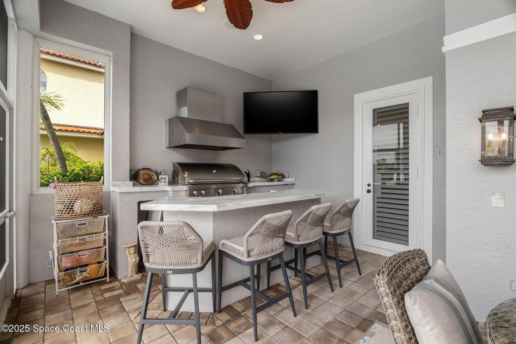 - Exterior FeaturesBalcony, Outdoor Kitchen and Storm Shutters