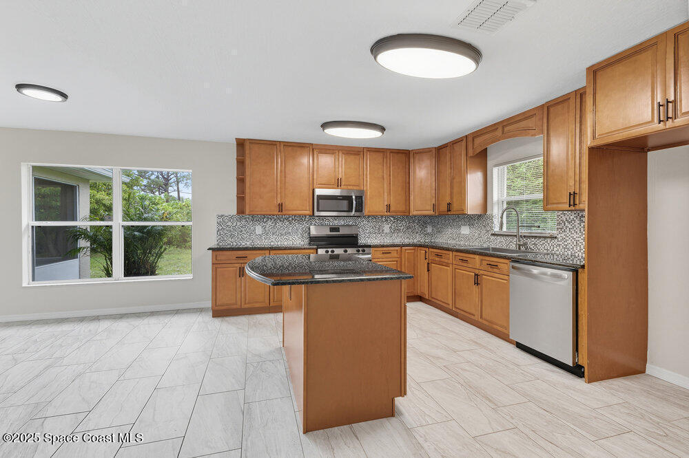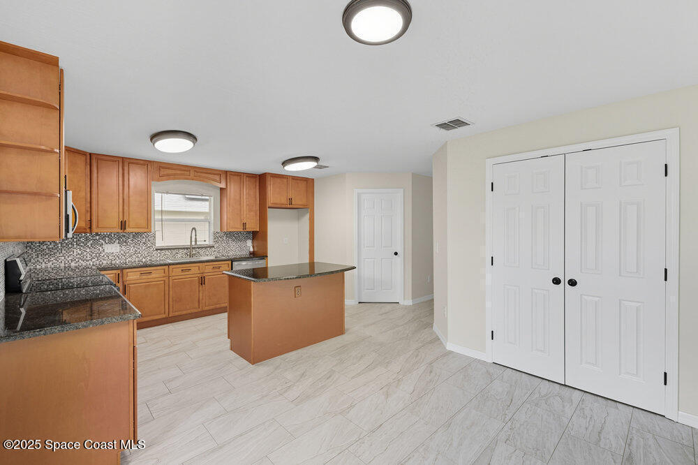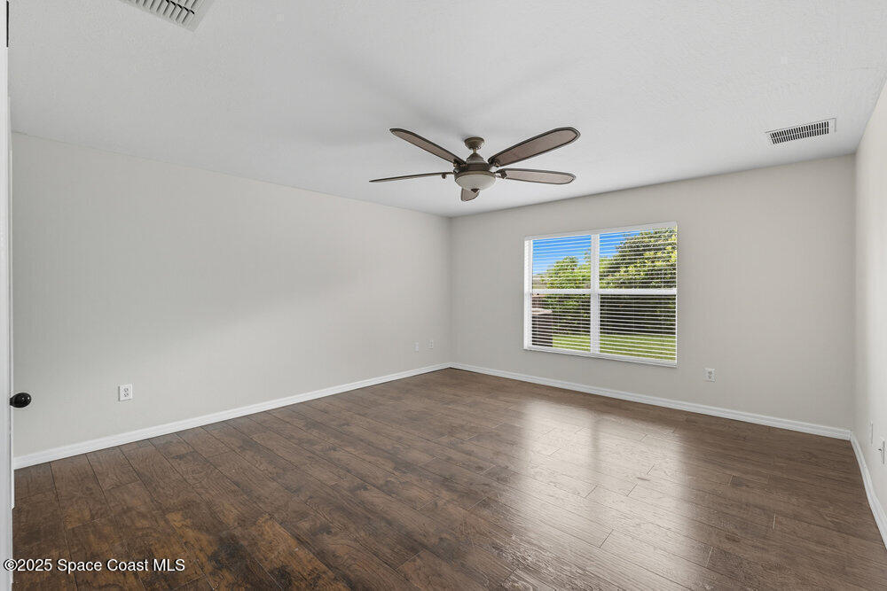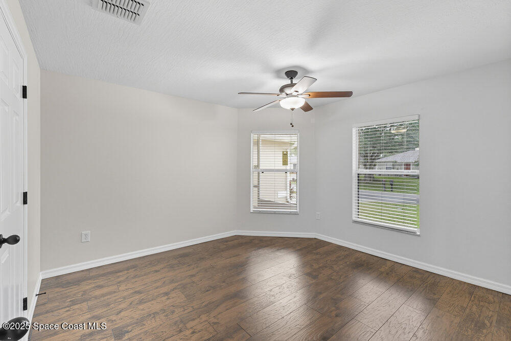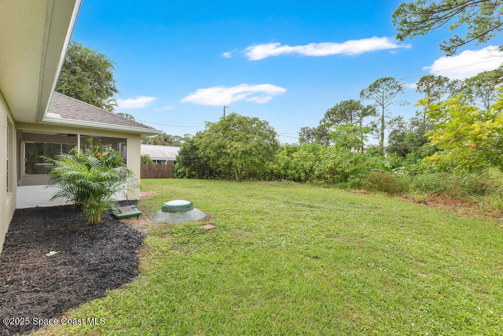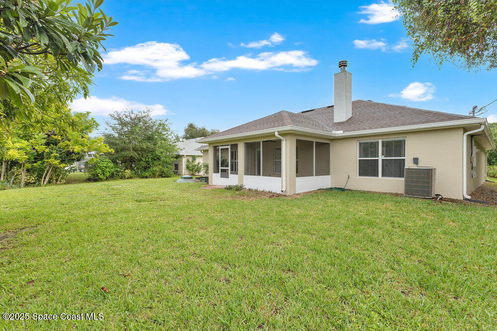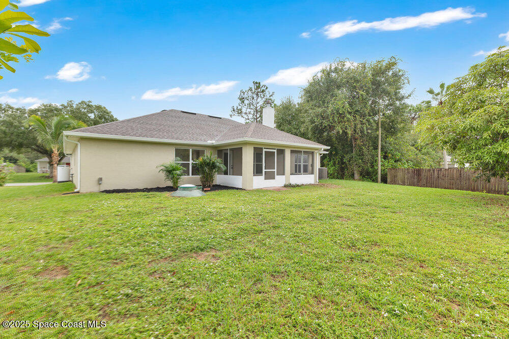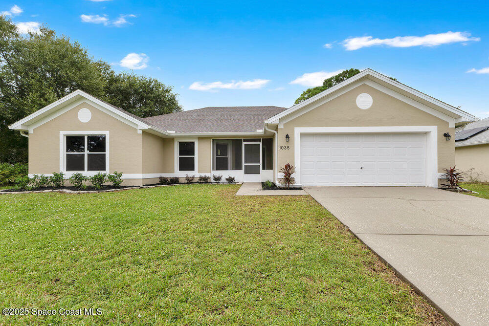 Wow! Don't miss out on this beautiful 3 bed 2 bath spacious, ready to move-in home in southeast Palm Bay. Buyer fell out-their loss - Your Gain- Recent major upgrades include a brand new roof, brand new HVAC and new city water connection to the house. There is also a separate well system. The home sits on an elevated lot with a 2 car garage and screen porches on the front and rear. You'll love all the nice upgrades in the interior with custom kitchen cabinets, granite counter tops, new stainless appliances, porcelain tile floors, ceiling fans, wood laminate flooring in the bedrooms and new interior paint. The bathrooms have been upgraded with custom cabinets, granite tops and a large walk-in shower in the primary bath. The laundry room has plenty of cabinet and countertop space. Other updates include brand new hurricane shutters, a new air pump for the Nayadic aerobic wastewater treatment system, new exterior paint and rain gutters