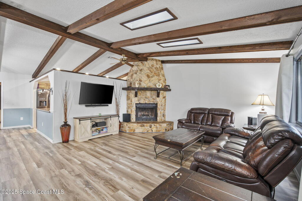Big On Space, Big On Charm! This 1,750 Sq Ft Home sits on a .49 Acre Corner Lot -- Offering Rare Space Inside and Out. No HOA. Major items already taken care of Roof & AC (2021), Septic Just Pumped (Oct 2025), and Waterproof LVP Flooring (2022). You'll love the vaulted ceilings with exposed beams, wood-burning stone fireplace, and a kitchen full of solid wood cabinets and counter space. Three spacious bedrooms and a flexible bonus room that can be used as an office or playroom. Tons of storage throughout the home, including multiple closets and a large walk-in closet in the primary suite. The oversized 2-car garage provides built-ins for garage storage. Bring your pets and toys! Huge fully fenced backyard, with gate access for storing boats, trailers, or toys. Homes like this on desirable corner lots don't come around often.