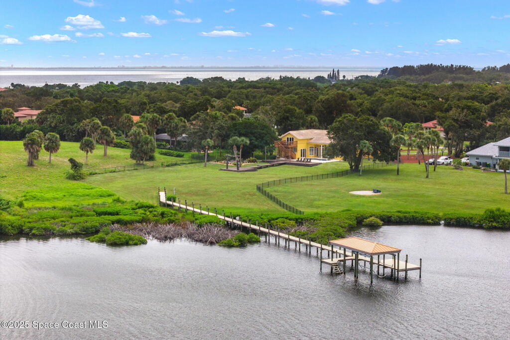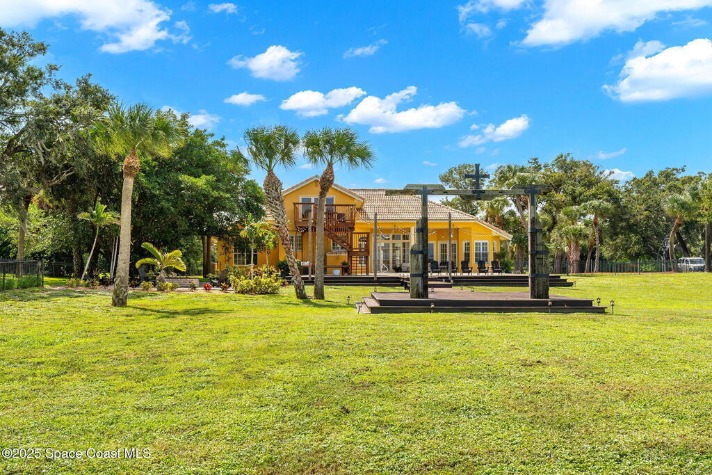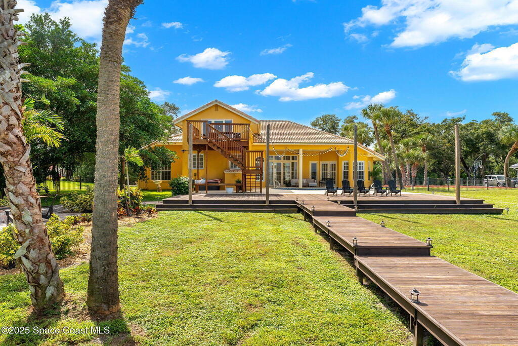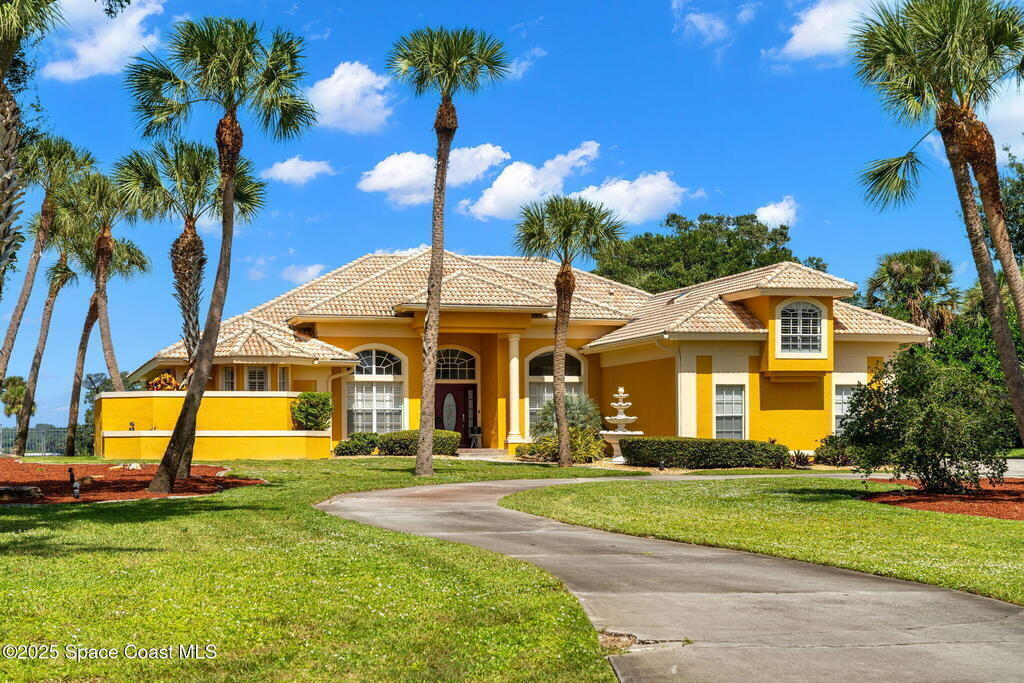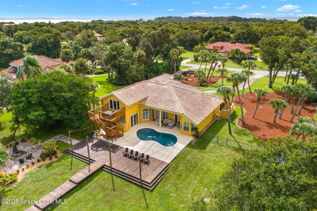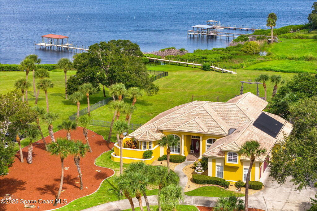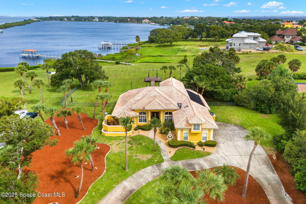 Luxury living awaits you in this one-of-a-kind Merritt Island Estate. Boasting over 2 acres of property, this pool home is situated on Honeymoon Lake, providing breathtaking views and direct access to the Indian River. The owner's suite is complete with double walk-in closets, separate tub & shower, and dual vanities. Tall white cabinets, granite countertops & backsplash, and stainless steel appliances give the kitchen a bright and sleek look while the breakfast bar, kitchen island, and ample countertops make it perfect for hosting. Two separate upstairs areas provide flexibility for your lifestyle, allowing you to use them as extra bedrooms, gyms, or bonus rooms. Whether from the balcony or from the solar-heated pool, the backyard's northern exposure allows for stunning views of sunrise and sunset. With 2018 barrel tile roof, two new HVACs, and a boat lift already in place, this home is truly turnkey, all you need to do is pull up in the boat!