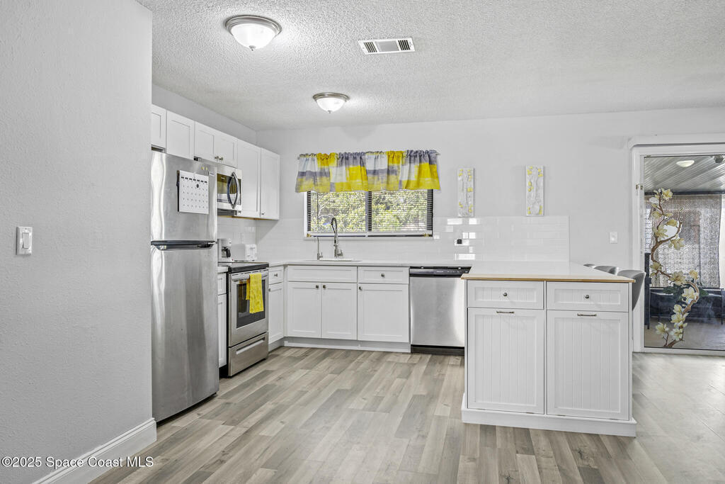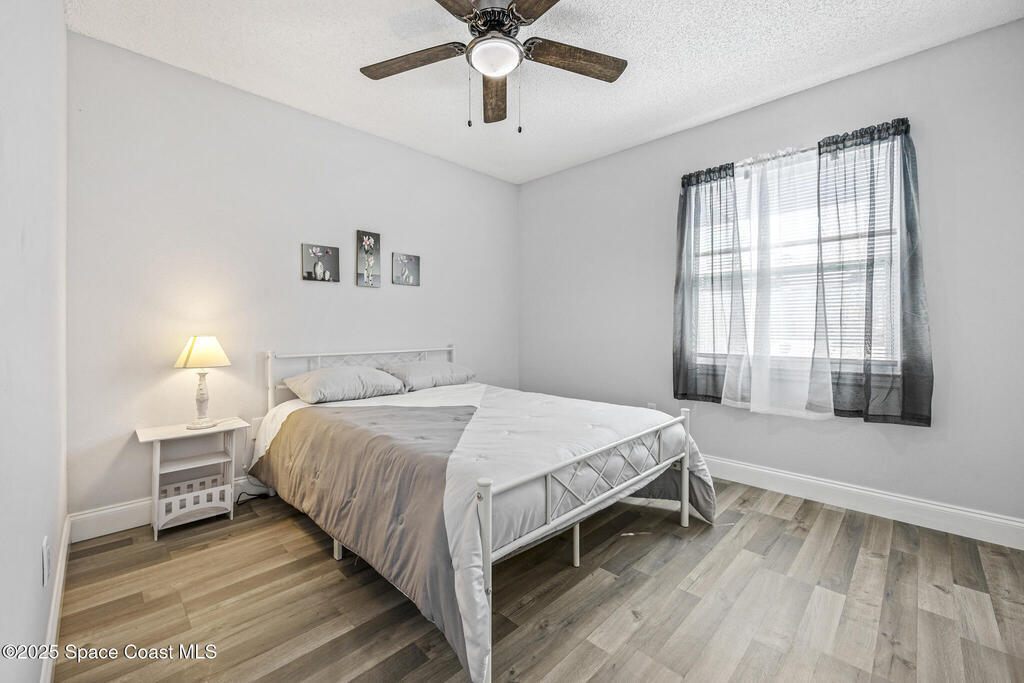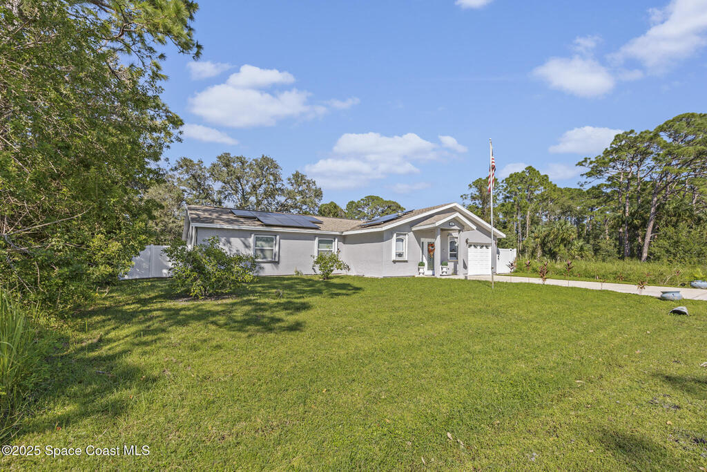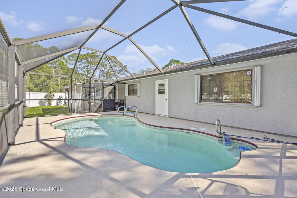 Beautiful home packed w/ upgrades & a newly replaced roof (10/2025)! Inside, enjoy vinyl flooring, modern fixtures, and a versatile bonus room. The kitchen features quartz countertops, soft-close shaker cabinets, subway tile backsplash, and stainless steel Frigidaire appliances (2022). Both bathrooms have updated vanities and fixtures. Additional features include a washer/dryer, water treatment system (2022), security system, and solar panels (2022). Outside, relax by the screened pool and covered lanai surrounded by manicured landscaping and a white vinyl fence (2022). Hurricane shutters, a storage shed, and a replaced pool pump (2023) add even more value. Located on a quiet street with no HOA, close to schools, shopping, and beaches--this home offers the perfect blend of comfort, efficiency, and Florida lifestyle.