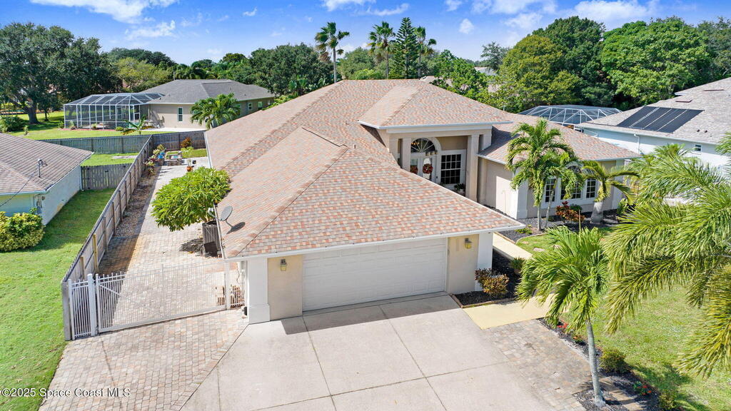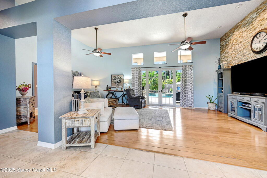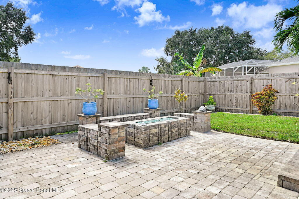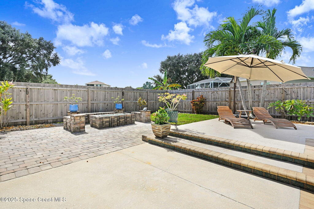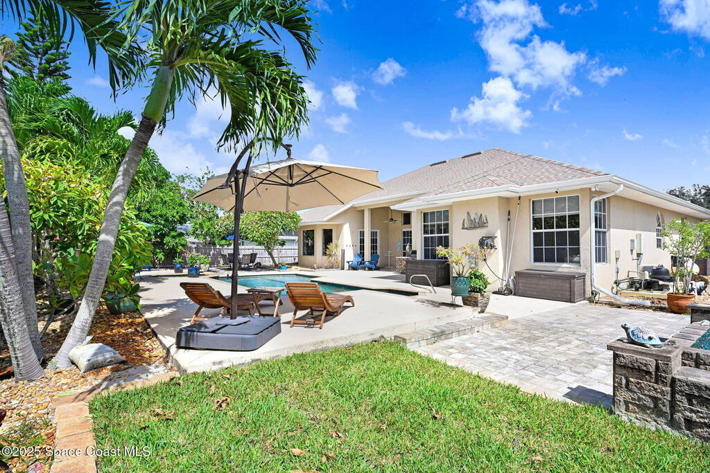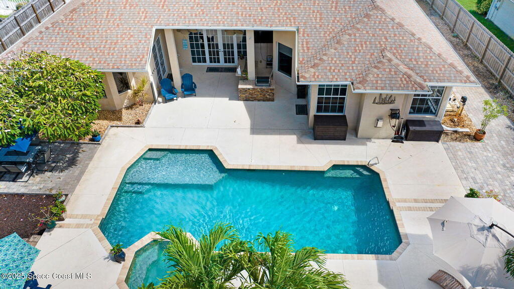 Gorgeous Merritt Island Pool Home! NO HOA! Step inside to soaring ceilings and abundant natural light. The open layout flows from the bright living area to elegant French doors leading to a stunning pool deck. The kitchen boasts granite countertops, bar seating, and ample cabinet space. A spacious family room is perfect for entertaining. The backyard oasis features a sparkling salt water pool and spa with LED lighting, waterfall and jets, a gas fire pit, and fenced yard. Enjoy peace of mind with hurricane-rated windows and garage door, plus a new roof and gutters (2019). AC and water heater, 2022. Gated paver space for your RV or boat. Prime Merritt Island location with easy access to shopping, dining, and entertainment. Nearby water access for boating and fishing. Easy turnaround driveway. Your home search ends here!