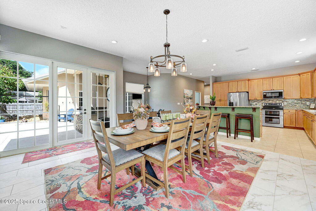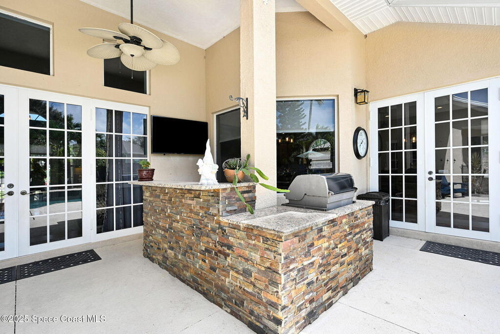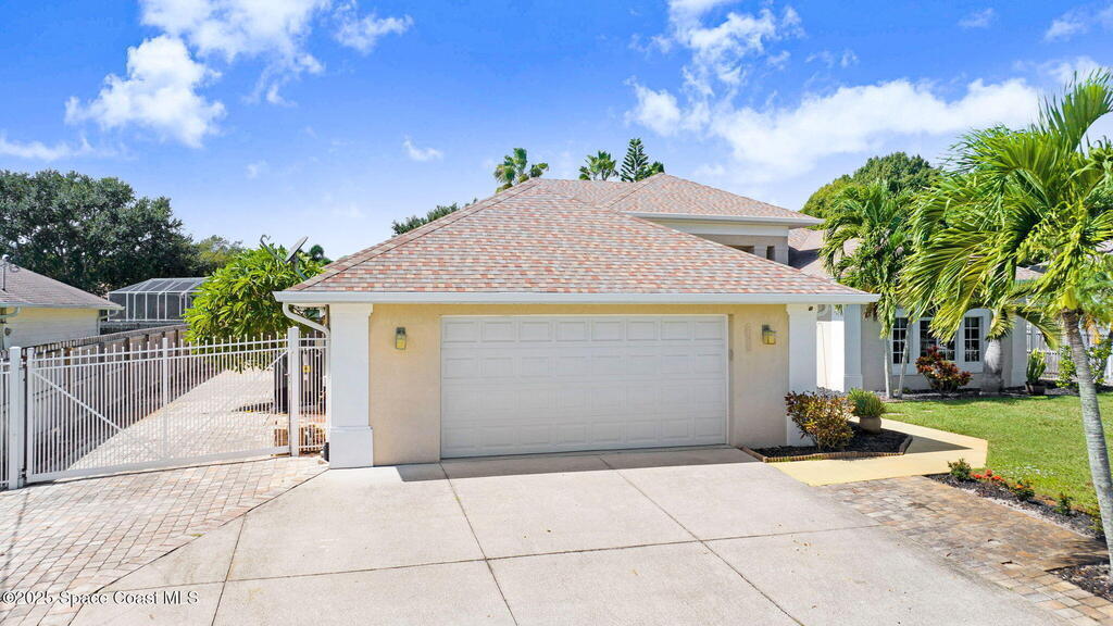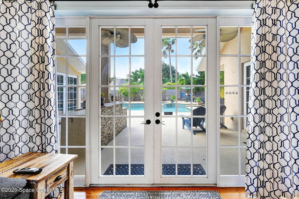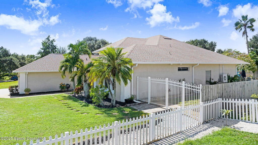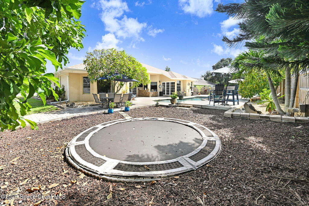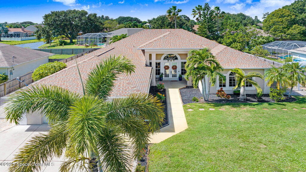 Gorgeous Merritt Island Pool Home! NO HOA! Step inside to soaring ceilings and abundant natural light. The open layout flows from the bright living area to elegant French doors leading to a stunning pool deck. The kitchen boasts granite countertops, bar seating, and ample cabinet space. A spacious family room is perfect for entertaining. The backyard oasis features a sparkling salt water pool and spa with LED lighting, waterfall and jets, a gas fire pit, and fenced yard. Enjoy peace of mind with hurricane-rated windows and garage door, plus a new roof and gutters (2019). AC and water heater, 2022. Gated paver space for your RV or boat. Prime Merritt Island location with easy access to shopping, dining, and entertainment. Nearby water access for boating and fishing. Easy turnaround driveway. Your home search ends here!
