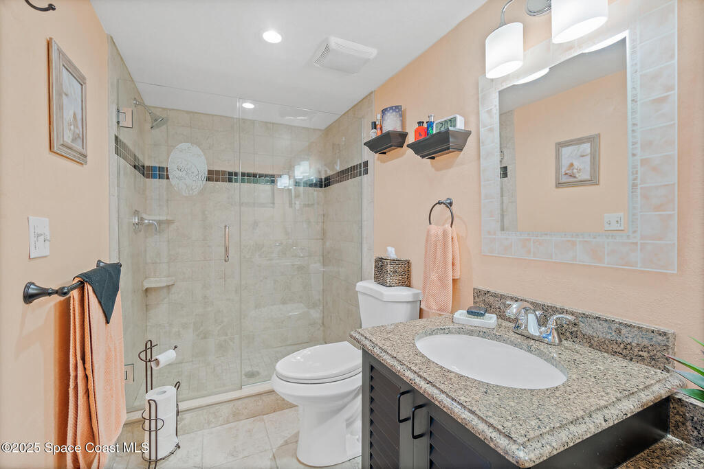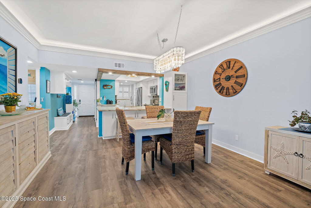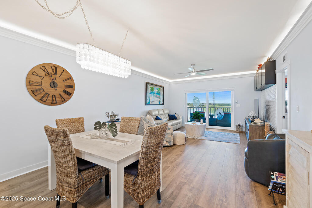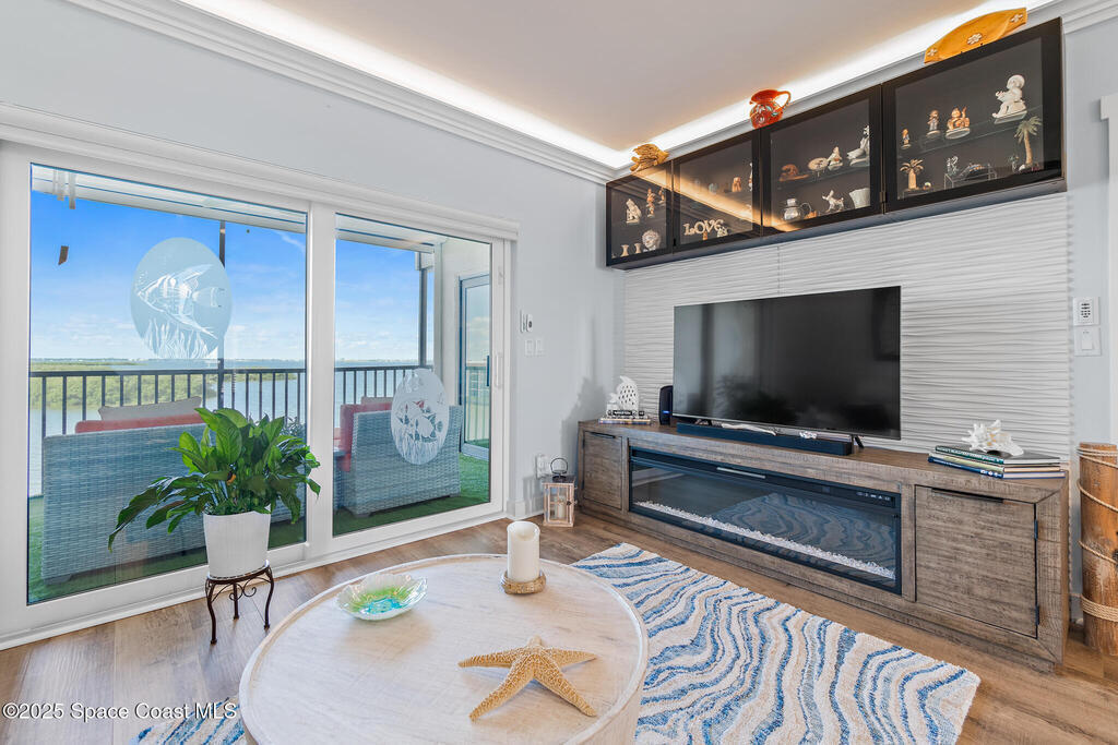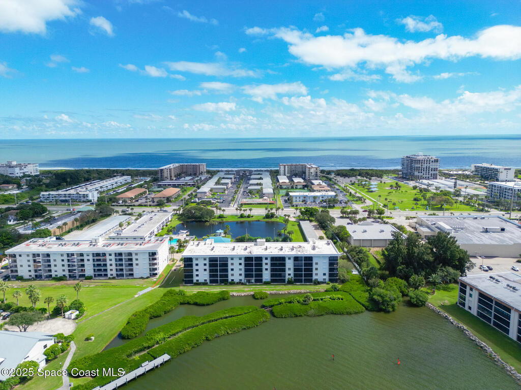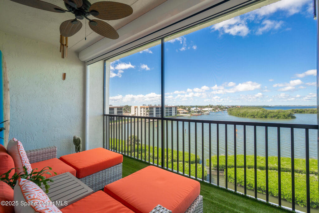 STUNNING top-floor condo w/incredible views of the Banana River! The kitchen is gorgeous w/durable leathered granite counters, generous island, crisp white shaker cabinets & newer stainless appliances. The primary suite delivers w/dual granite vanities, updated tile shower & 2 closets--including a custom walk-in for effortless organization. Guest bedroom features a Murphy bed & peek-a-boo ocean view. 9' ceilings amplify the airy open floorplan, where crown molding & subtle accent lighting create a welcoming ambiance. Soft beachy coastal colors & stylish interior doors enhance the modern yet timeless appeal. Plantation/storm shutters, new slider, private 1 car garage, NO CARPET, tons of storage & VA APPROVED too! Benefit from association-paid hot water & exceptional amenities: heated pool/spa, sauna, tennis/pickleball/basketball, fitness center, community clubhouse /dock & drive-thru car wash. This coastal retreat in vibrant Cocoa Beach combines convenience, views & value--Call today!