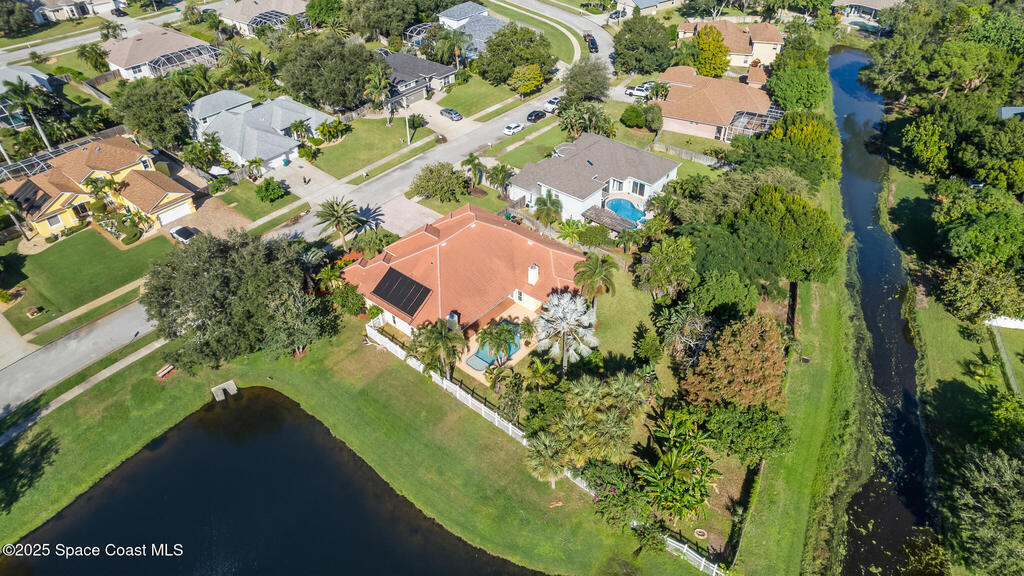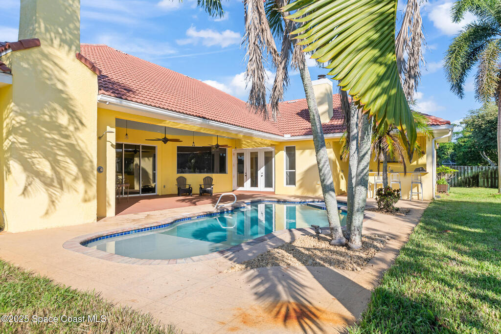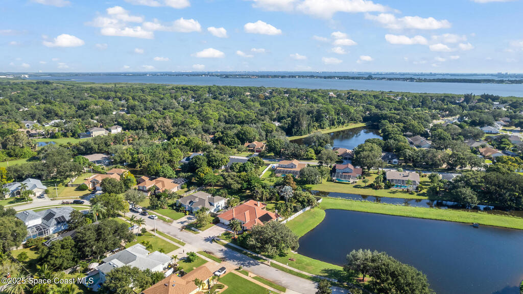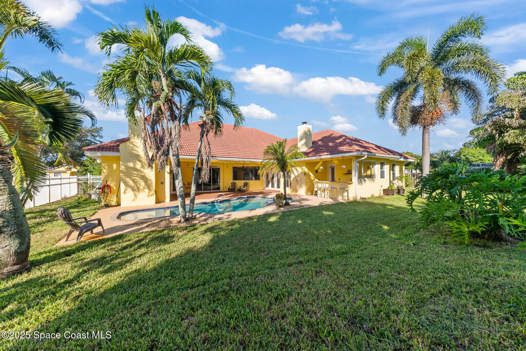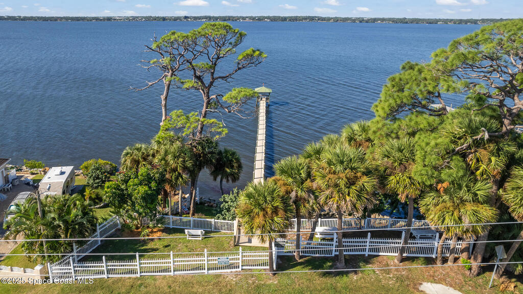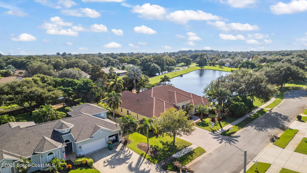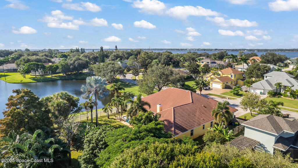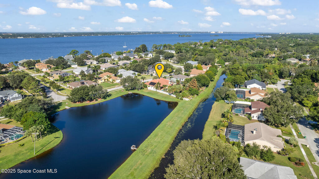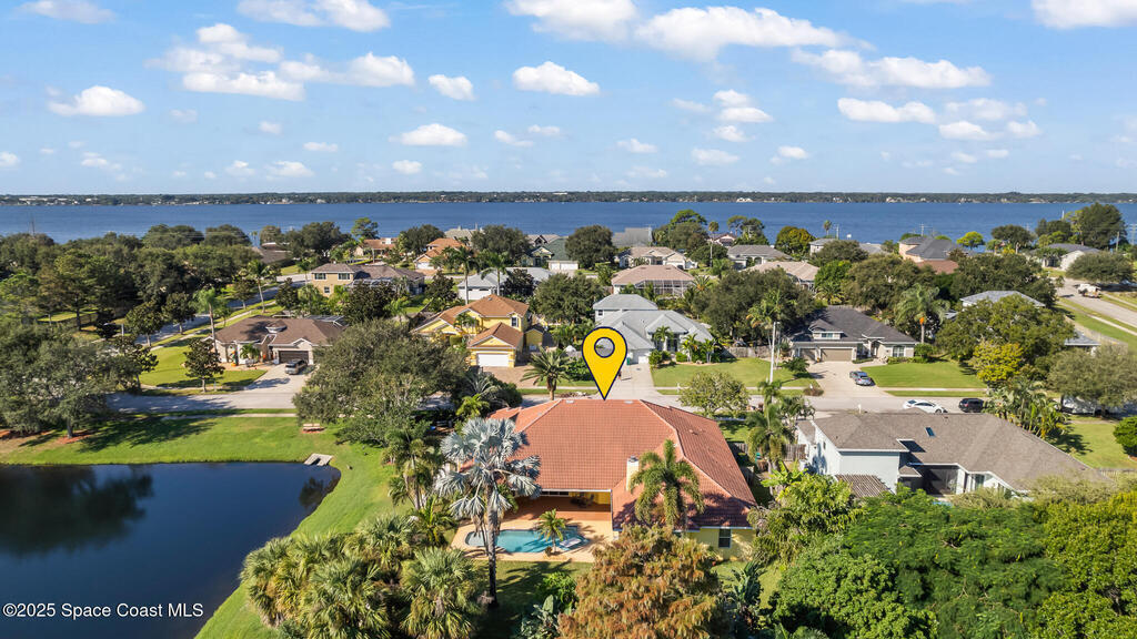 An exceptional opportunity to live in one of Merritt Island's most beloved neighborhoods.Originally built and owned by the developer of River Grove, this stunning single story lakefront home boasts quality and prime location. Featuring durable tile roof and a true master suite with private sitting area, wood floors, and charming fireplace, this residence exudes warmth, elegance and spaciousness. The large kitchen offers solid oak cabinets, granite countertops, built-in wine bar, and island perfect for entertaining. Set on an oversized fully fenced lot adjoining the serene neighborhood lake, the property includes multiple fruit trees. Enjoy outdoor living with grilling area, shower and swim-up table in the pool, resurfaced in 2019. A light filled family room with a second wood-burning fireplace completes this spacious home. Storm Shutters on premise. Yard is irrigated by well. Community Dock on the Indian River with Fishing Rights.