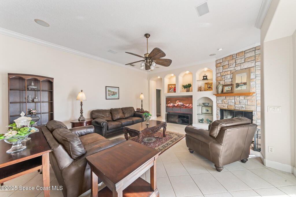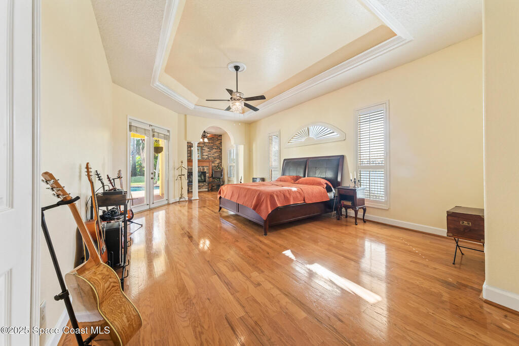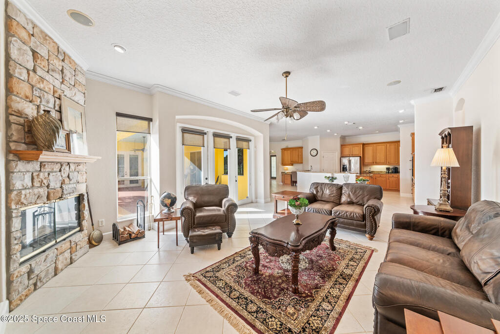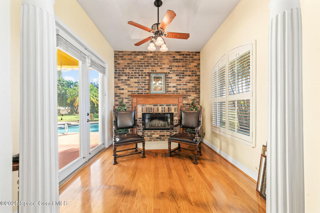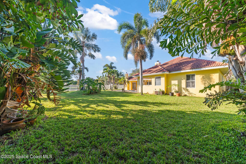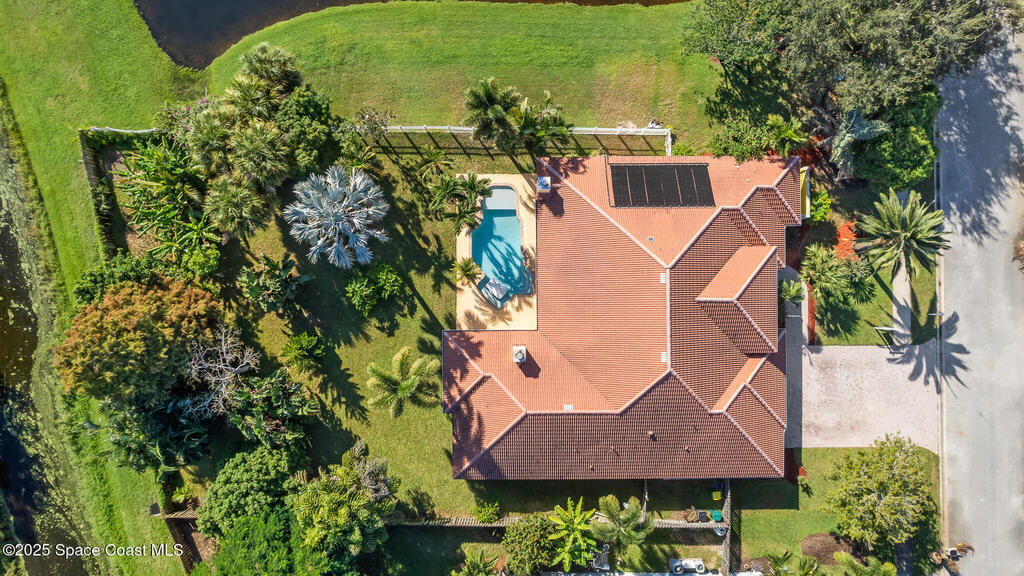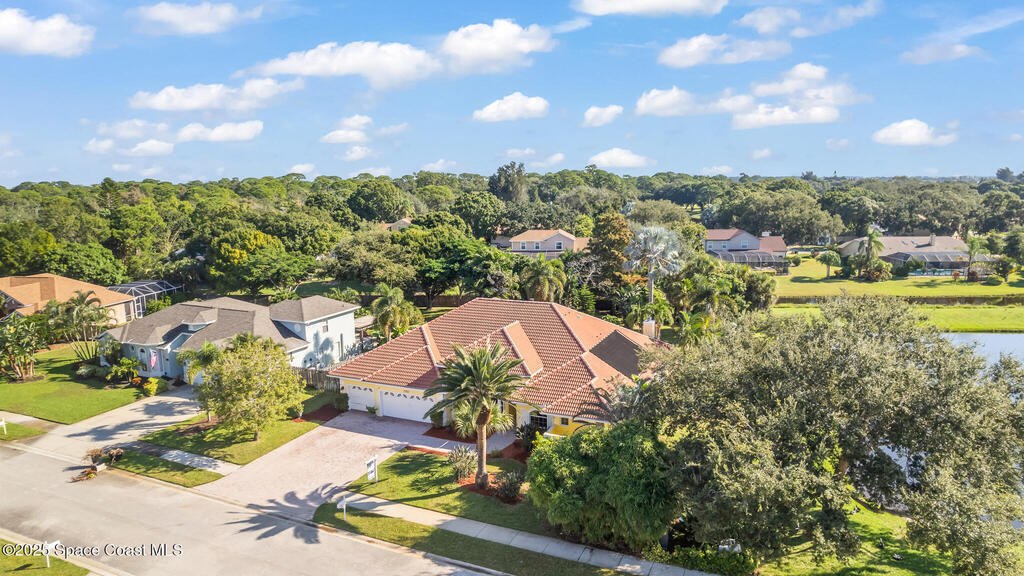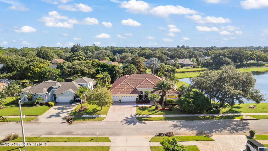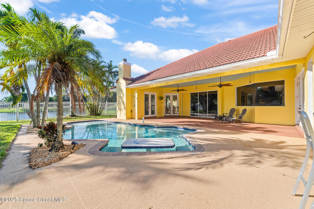 An exceptional opportunity to live in one of Merritt Island's most beloved neighborhoods.Originally built and owned by the developer of River Grove, this stunning single story lakefront home boasts quality and prime location. Featuring durable tile roof and a true master suite with private sitting area, wood floors, and charming fireplace, this residence exudes warmth, elegance and spaciousness. The large kitchen offers solid oak cabinets, granite countertops, built-in wine bar, and island perfect for entertaining. Set on an oversized fully fenced lot adjoining the serene neighborhood lake, the property includes multiple fruit trees. Enjoy outdoor living with grilling area, shower and swim-up table in the pool, resurfaced in 2019. A light filled family room with a second wood-burning fireplace completes this spacious home. Storm Shutters on premise. Yard is irrigated by well. Community Dock on the Indian River with Fishing Rights.