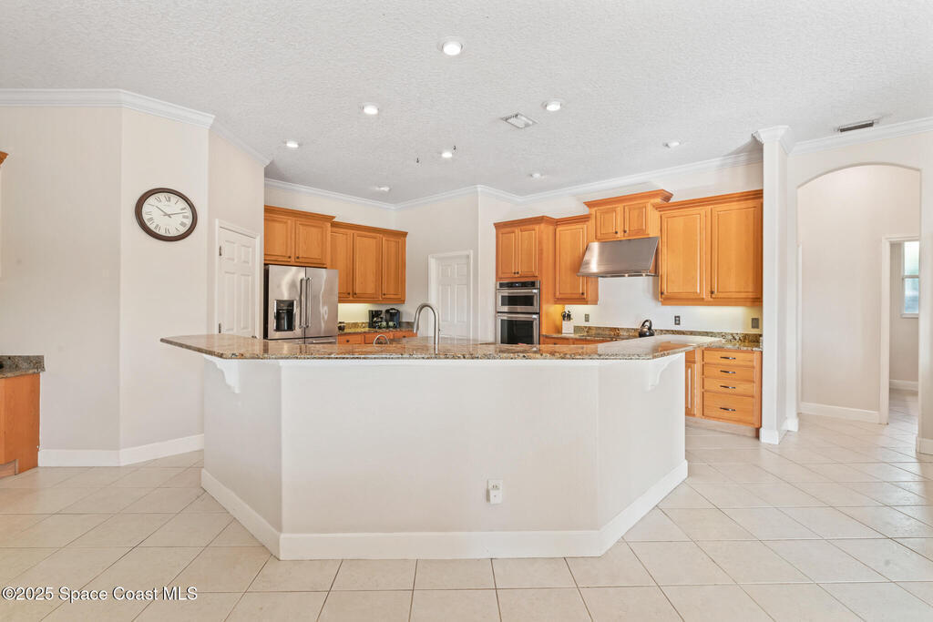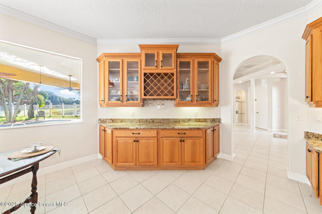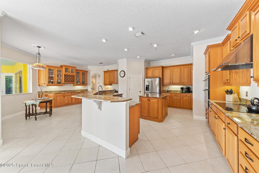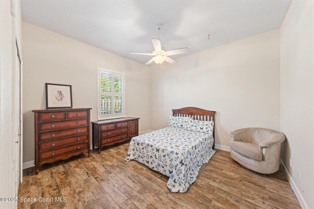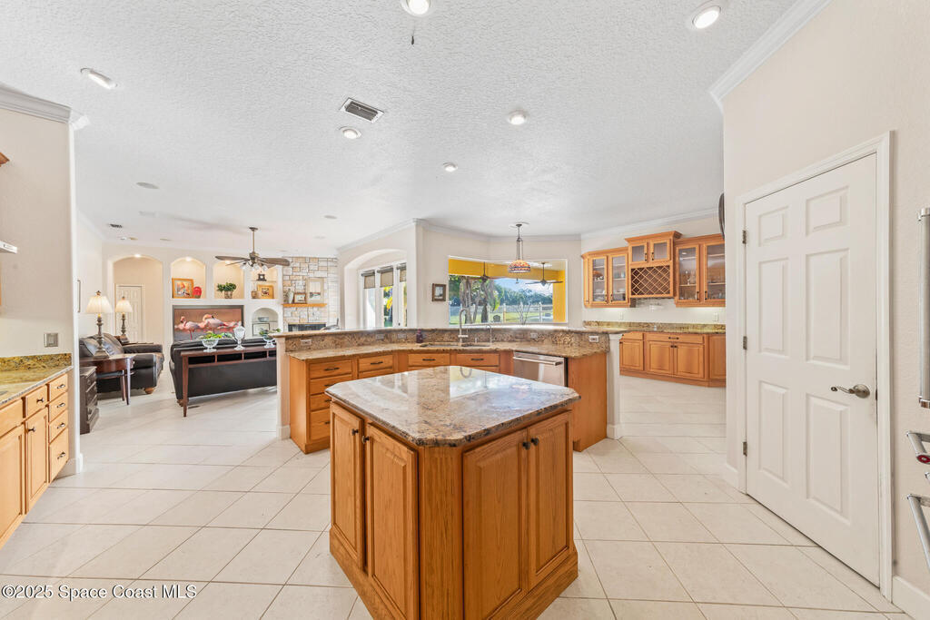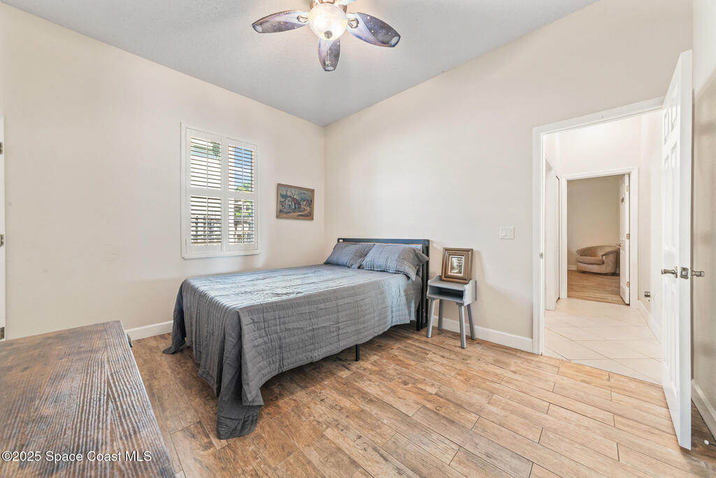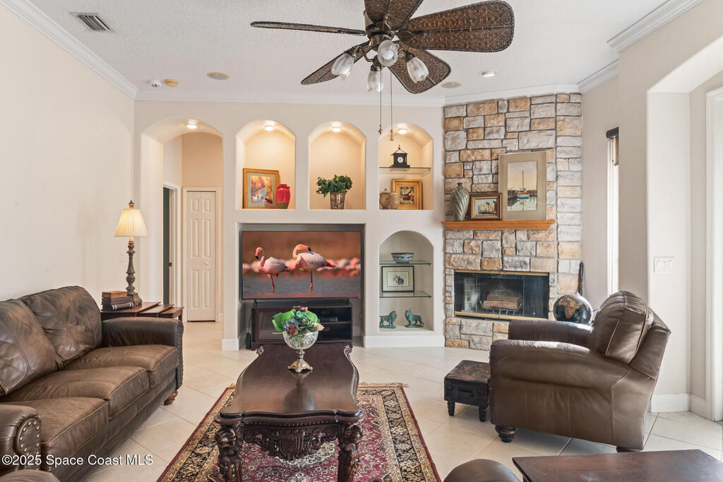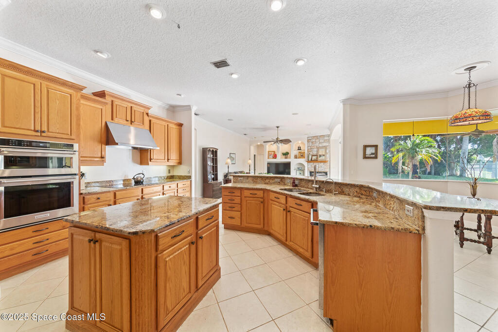 An exceptional opportunity to live in one of Merritt Island's most beloved neighborhoods.Originally built and owned by the developer of River Grove, this stunning single story lakefront home boasts quality and prime location. Featuring durable tile roof and a true master suite with private sitting area, wood floors, and charming fireplace, this residence exudes warmth, elegance and spaciousness. The large kitchen offers solid oak cabinets, granite countertops, built-in wine bar, and island perfect for entertaining. Set on an oversized fully fenced lot adjoining the serene neighborhood lake, the property includes multiple fruit trees. Enjoy outdoor living with grilling area, shower and swim-up table in the pool, resurfaced in 2019. A light filled family room with a second wood-burning fireplace completes this spacious home. Storm Shutters on premise. Yard is irrigated by well. Community Dock on the Indian River with Fishing Rights.