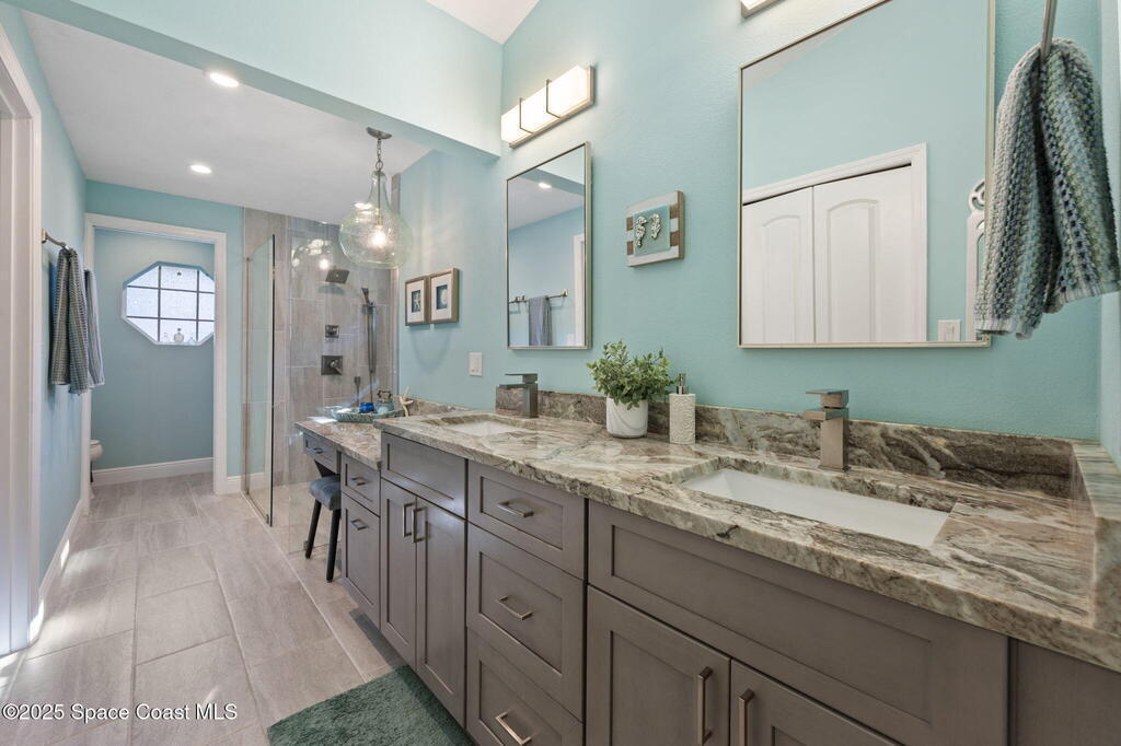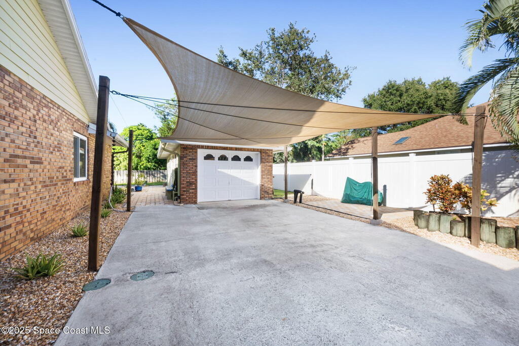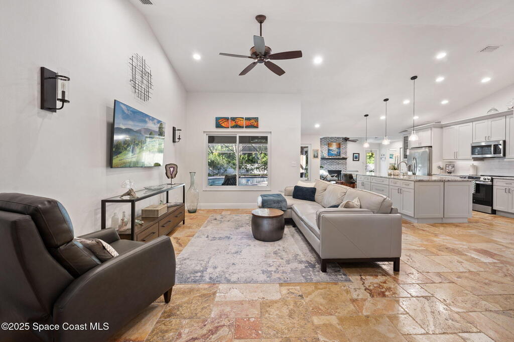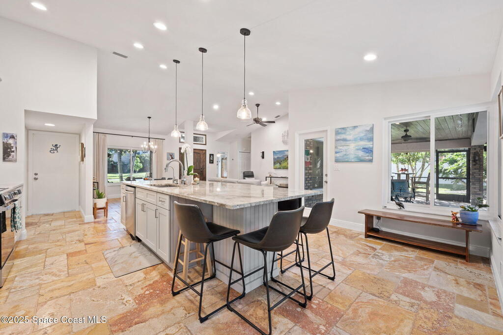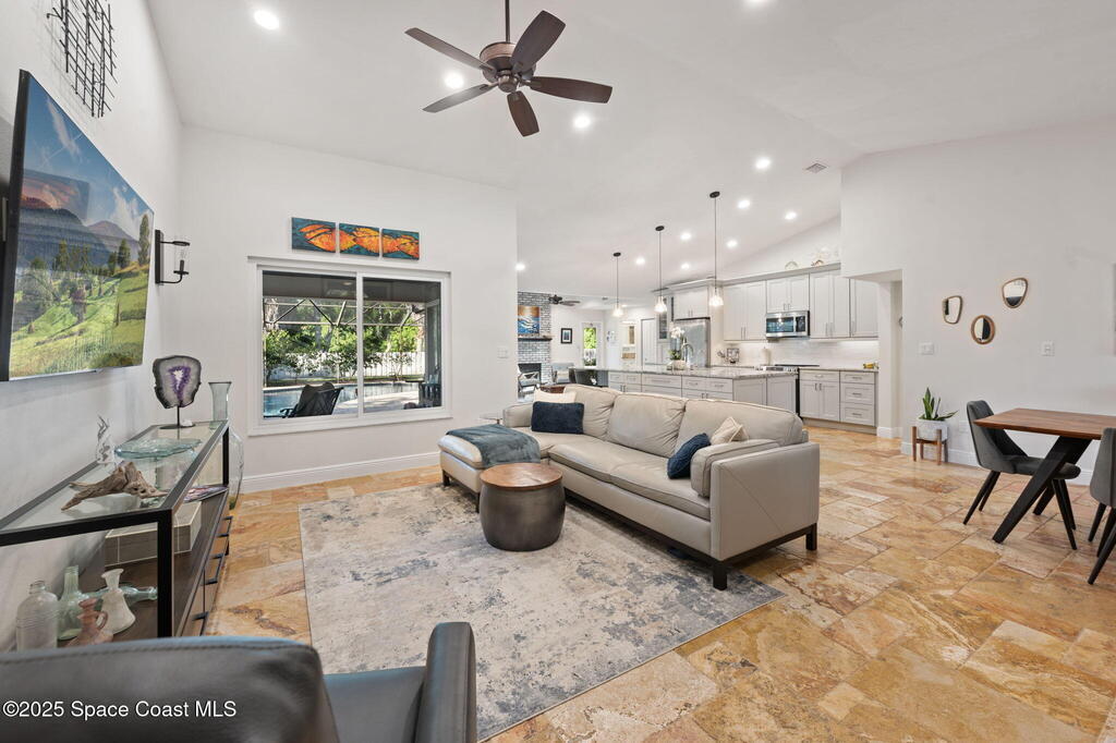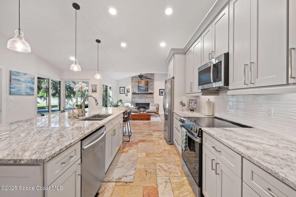 Beautifully renovated 4 bedroom pool home in the charming New Georgianna Settlement community. New roof in 2019. New pool pump, new impact rated windows and garage door. Kitchen recently fully redesigned with massive center island, shaker style cabinets, quartz countertops and all new stainless steel appliances. All tile floors. This impressive open floor plan, wood-burning fireplace, covered brick paver patio & sparkling screened pool makes this home perfect for entertaining friends and family. Very private fully fenced yard backs up to a mango orchard. You'll love the abundance of parking space which includes RV / boat parking, w/50 amp outlet, plus an attached 2 car garage, and a detached 1 car garage which currently serves as a workshop/art studio. This desirable community includes private access to the Banana River for fishing or launching your kayak, canoe or paddle boards. Don't delay, come take a look in person and secure this dream home for yourself today!