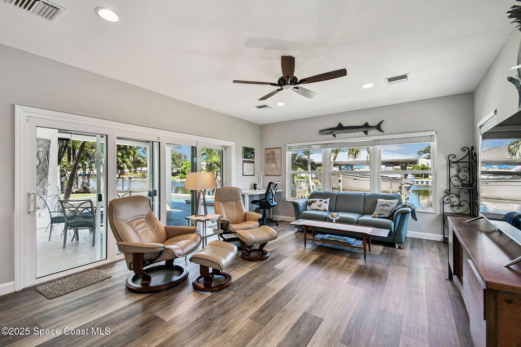 Exceptional Waterfront Living.Perfectly situated on one of the most sought-after streets in Cocoa Beach, this beautifully remodeled (to the studs in 2016) waterfront home blends luxury, comfort, and coastal living at its finest.Includes two primary suites, two spacious living areas, and an open kitchen with a gas cooktop, perfect for entertaining or everyday living. Tile and COREtec luxury vinyl floors flow throughout the home, which includes a mudroom, dining room, pantry, and laundry area with a pool-access bath for convenience.Outside is a private paradise featuring a gas heated saltwater pool, spa, covered dock, and boat lift - just moments from open water. Whether boating, relaxing by the pool, or enjoying a sunrise, this home captures true waterfront living.Close to downtown, golf, and top-rated schools, this home combines community and convenience. Move in with confidence and experience the best of waterfront living!