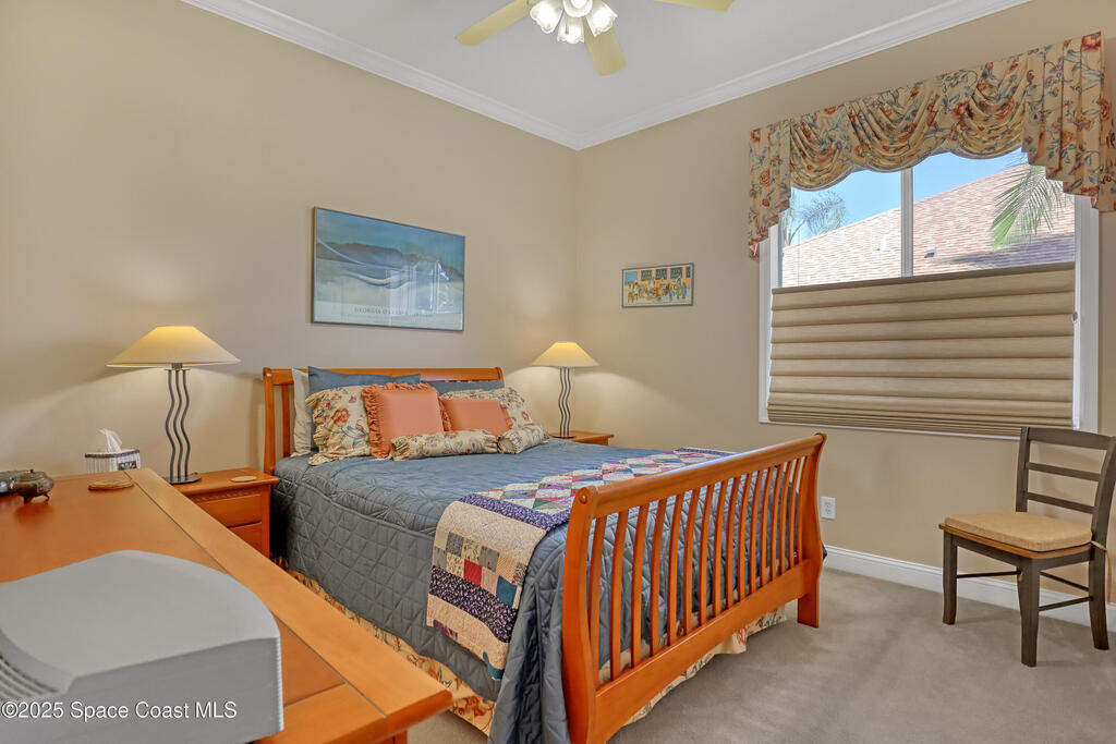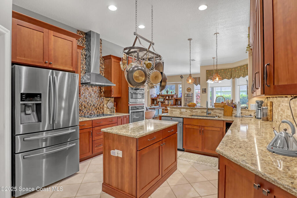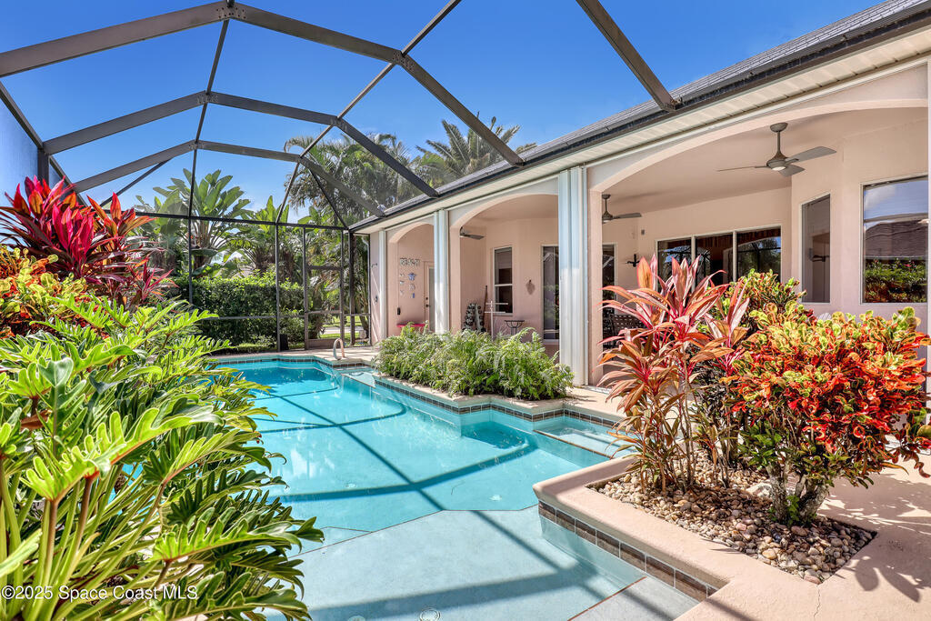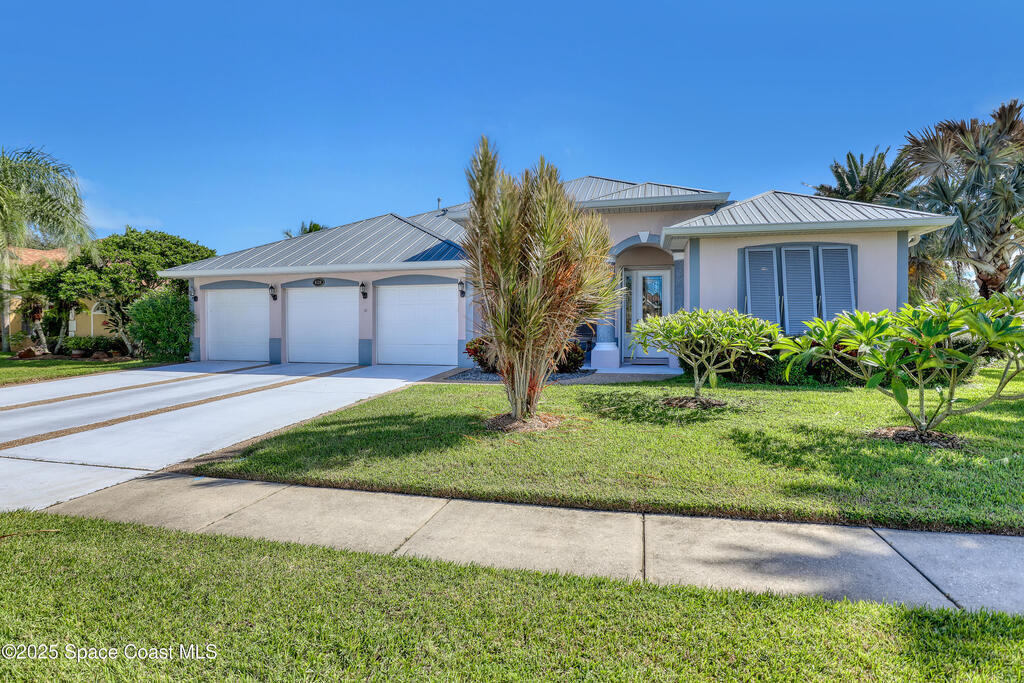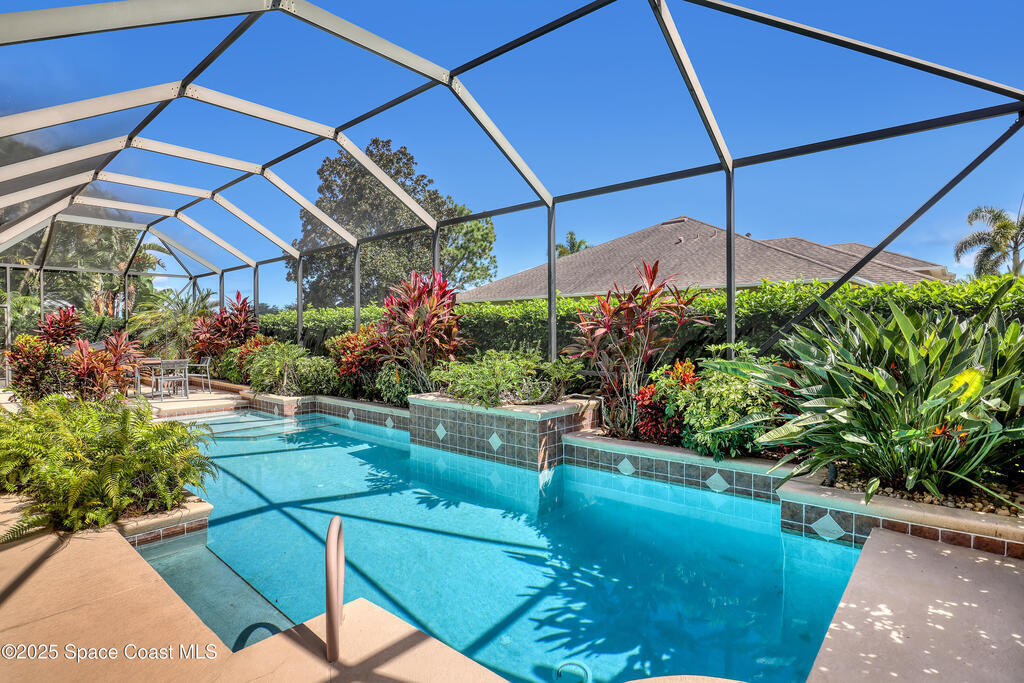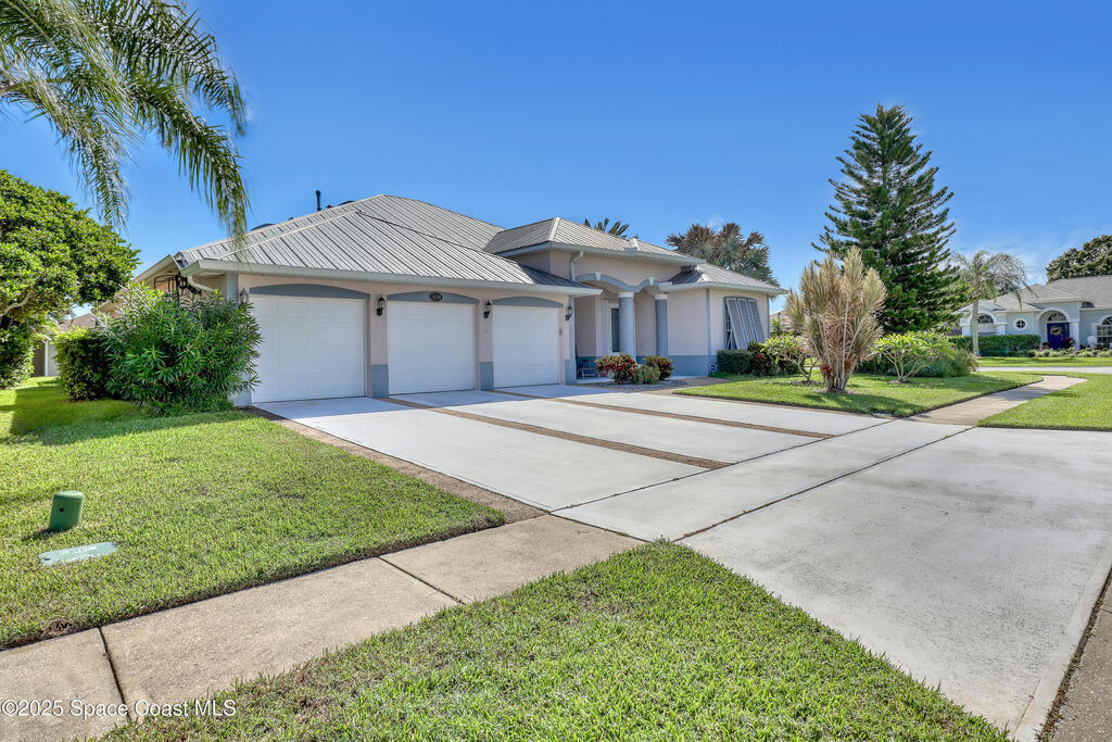 A cut above the rest! This outstanding former model home draws you in upon arrival. The upgraded metal roof, triple wide driveway and three separate garage stalls, set the tone. Quality in abundance throughout, elegant living & dining areas with 10' ceilings & stunning pool view. A spacious en suite with walk-in closets, tray ceilings & designer fan. Master bath with granite tops, jetted tub, walk-in shower & water closet.Adjacent 4th bedroom/study has ample space for an office or bedroom set up. A kitchen to die for! Extensive cabinet & counter space, quartz tops, breakfast bar & center island, stainless steel appliances, walk-in pantry & eat-in dining area.A large family room with attractive built-ins & spacious secondary bedrooms. Indoor laundry room w/ gas dryer. Lush foliage creates privacy for the impressive pool area & covered patio space with 3 ceiling fans, pool bathroom & extended pool deck. Full AC replacement in 2024, including ducts, Accordion & Bahama shutters.