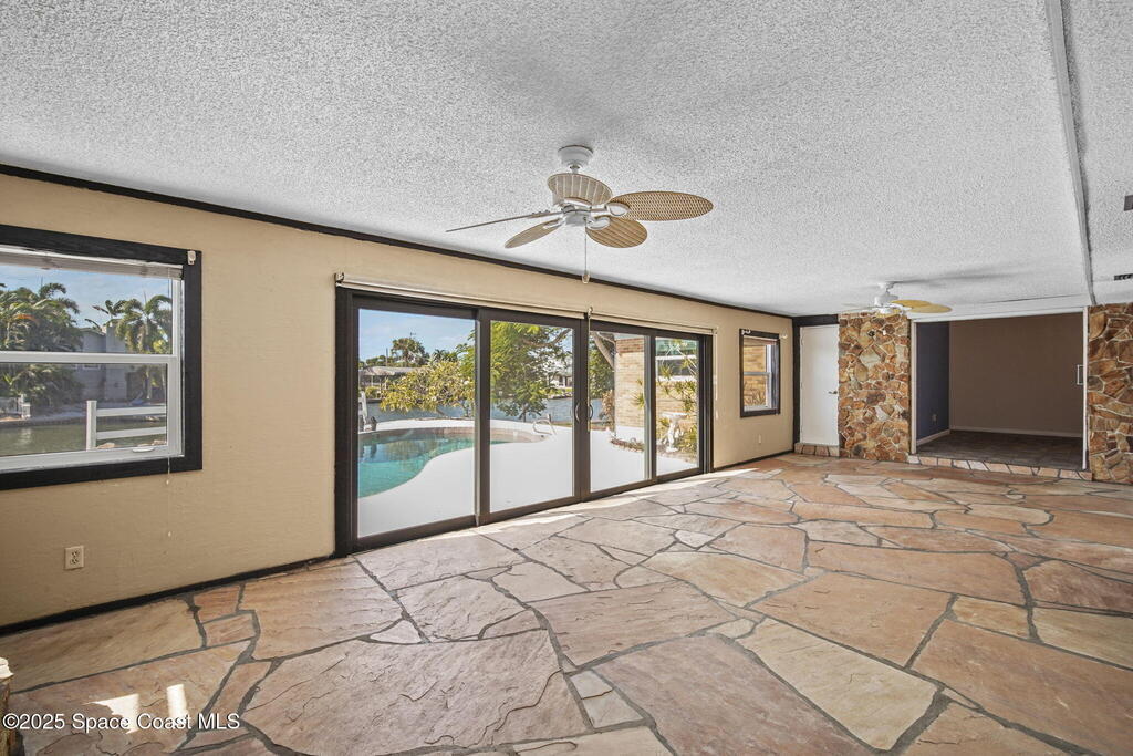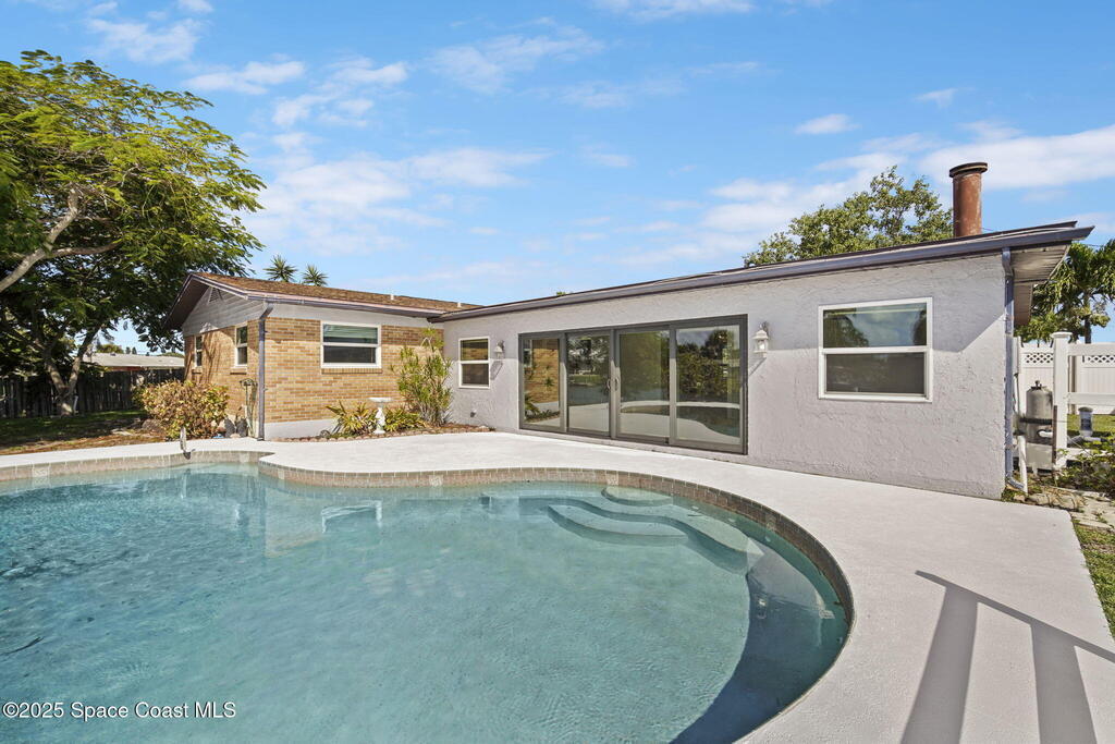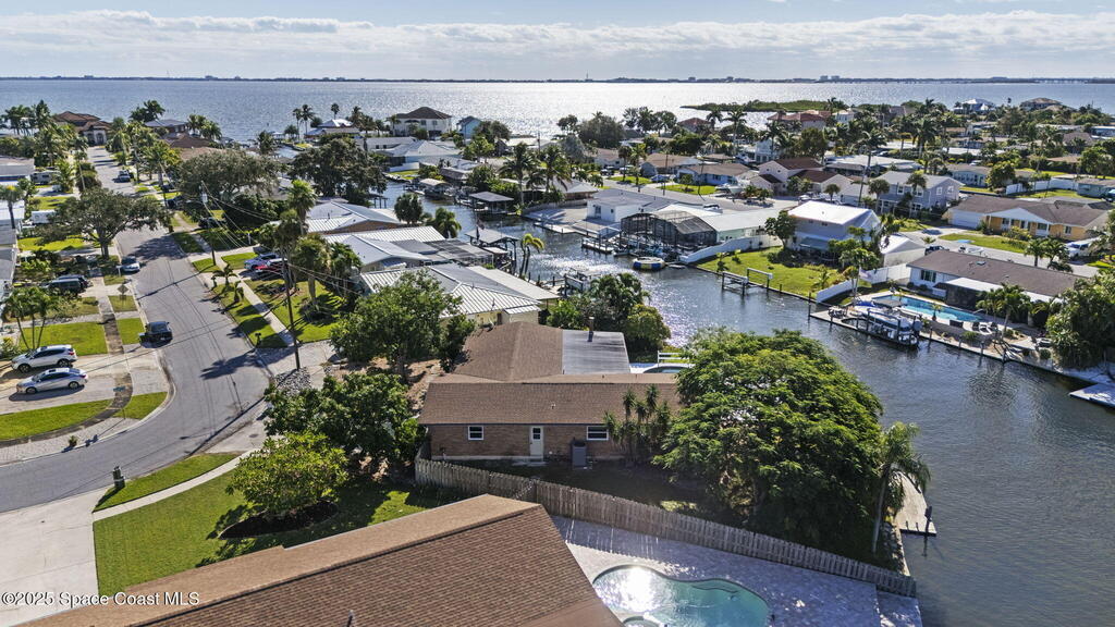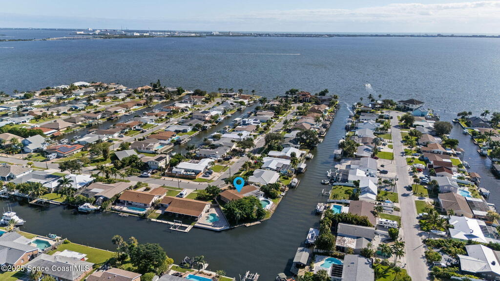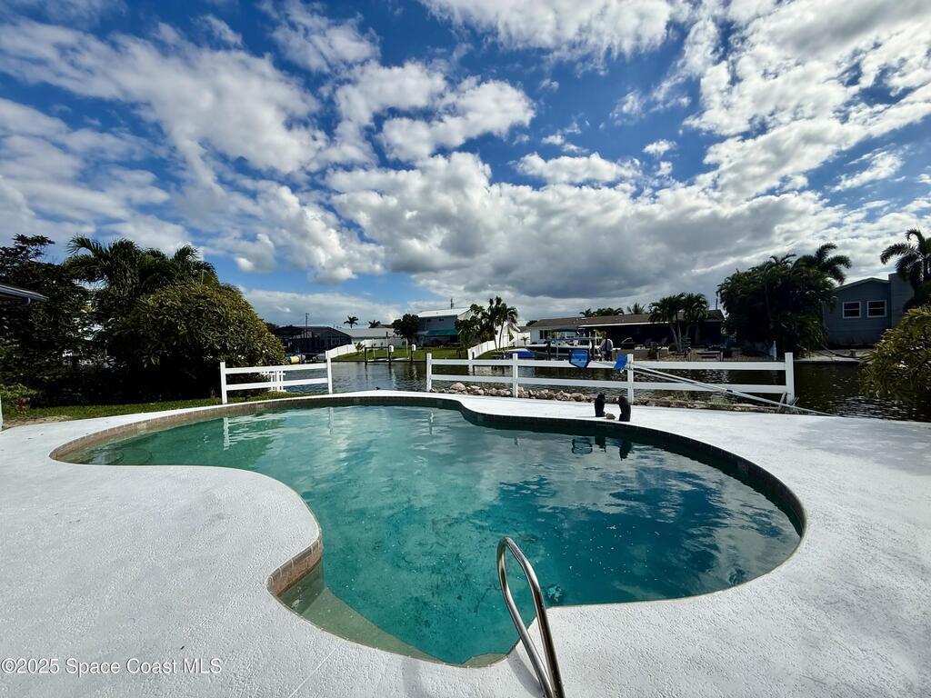 This waterfront pool home on Merritt Island boasts approximately 176 feet of frontage along a navigable deep-water canal featuring a spacious turnaround basin suitable for large vessels. With direct access to the Banana River and ocean via Port Canaveral, the property offers exceptional boating opportunities. Constructed from concrete block, the residence includes a four-bedroom split plan with two bathrooms, an inground pool, and all-tile flooring throughout. The bathrooms have been renovated, and the roof was replaced in 2016, with the HVAC system updated in 2017. Hurricane impact windows were installed in 2022, enhancing safety and energy efficiency. The open layout encompasses a kitchen, living room, family room, and a 35x13 Florida room complete with a fireplace, which provides access to a bathroom and features large sliding doors leading to the pool and waterfront. The expansive lot is surrounded by a privacy fence, mature landscaping and shade trees,