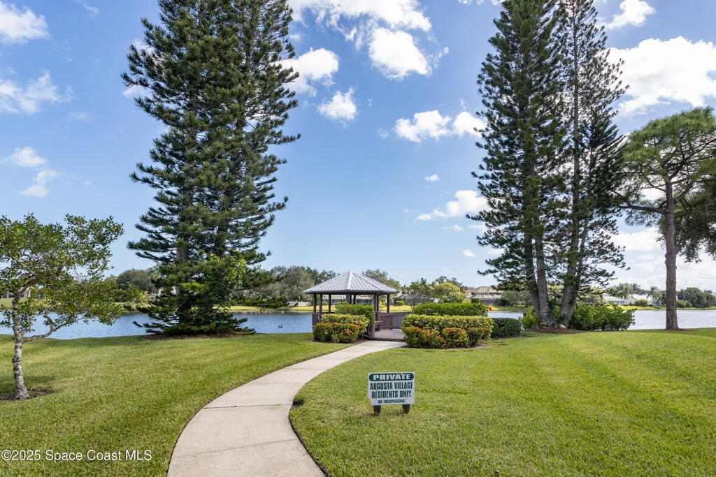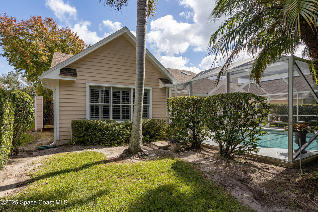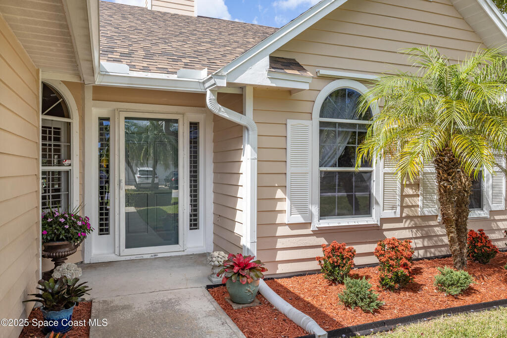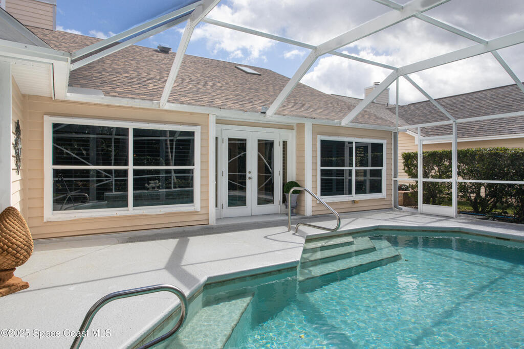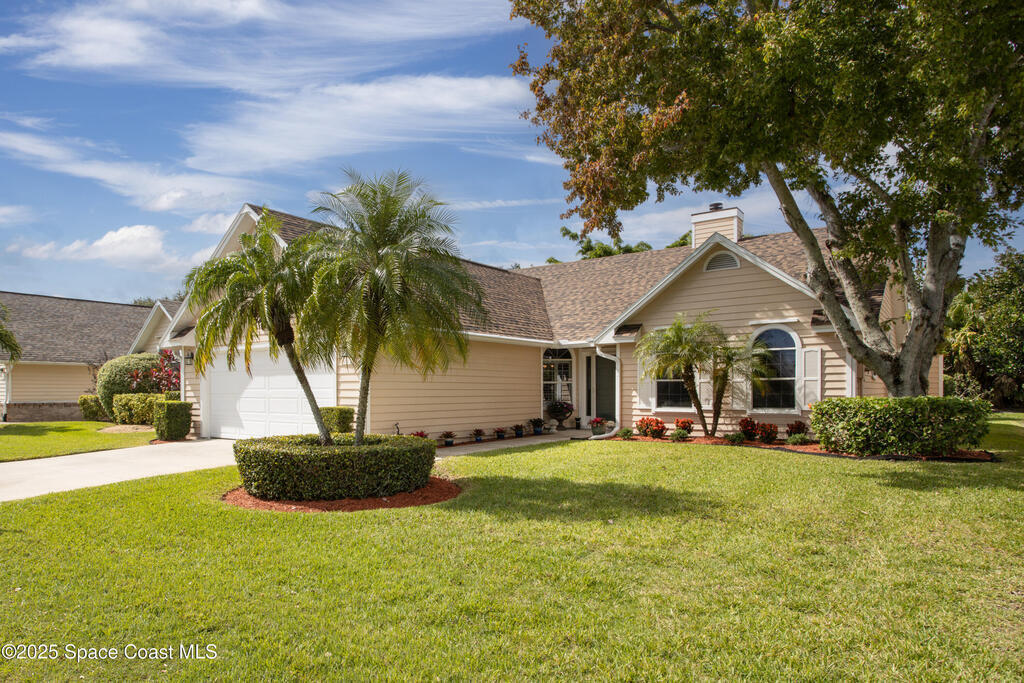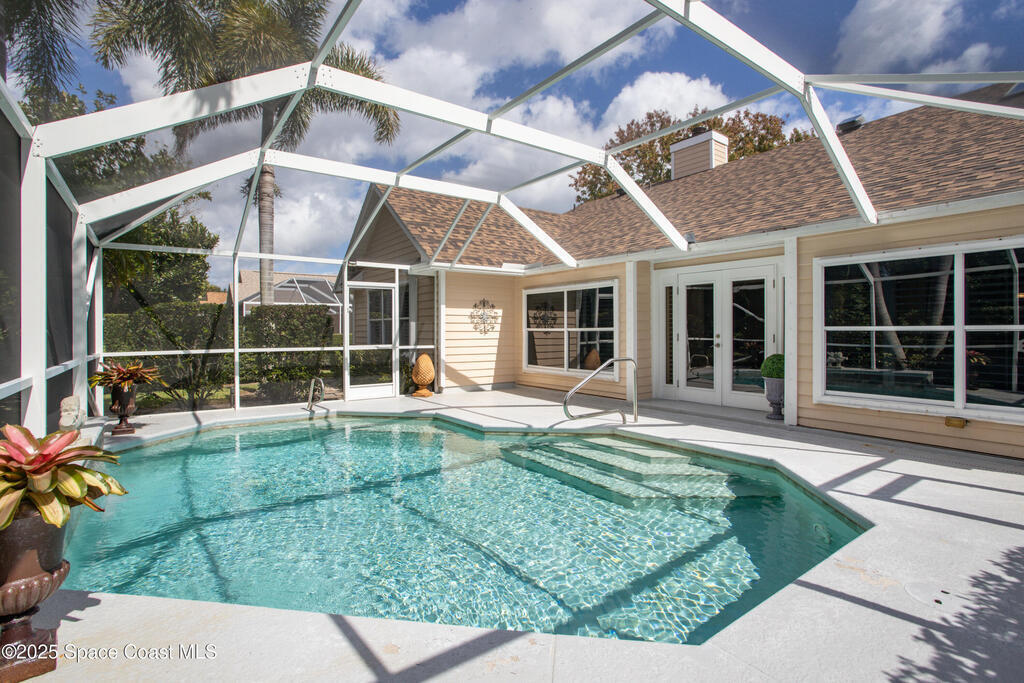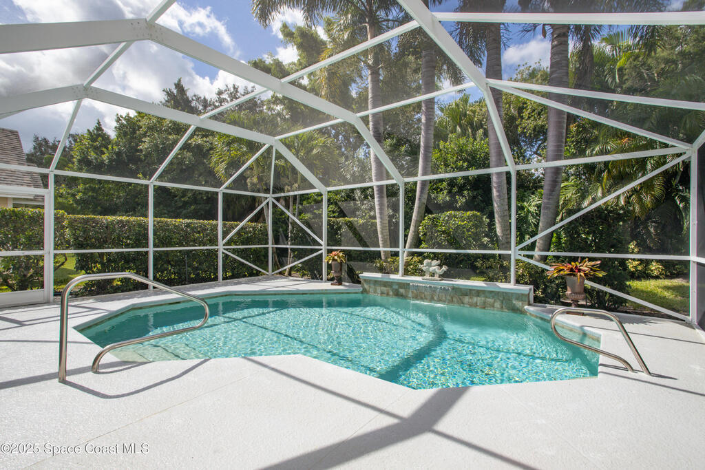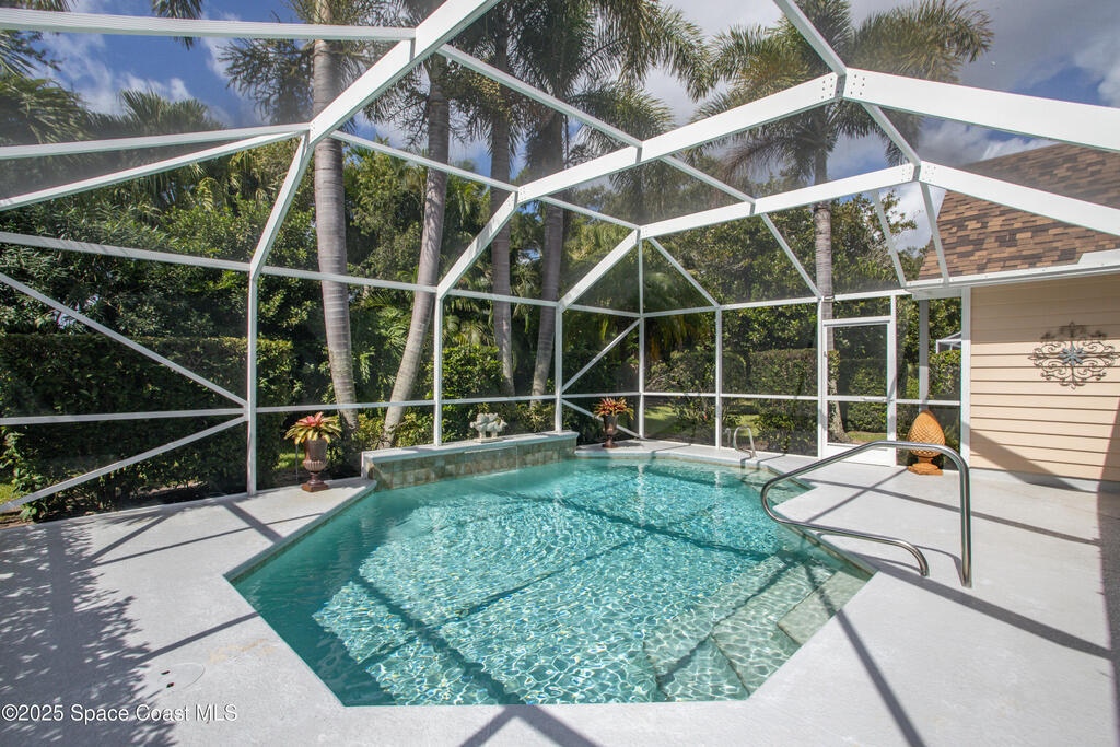 Immaculate pool home just minutes from Suntree Country Club, tucked away in the desirable Augusta Village community. Well maintained, this home features an open floor plan with vaulted ceilings, a spacious eat-in kitchen with skylights and stainless steel appliances, and a formal dining room. The remodeled master suite offers wood laminate flooring, a custom walk-in closet, and a luxurious bath with double vanity, oversized shower with bench, custom shelving, electric bidet, and linen closet. The living room opens to an enclosed lanai with French doors leading to a sparkling pool with waterfall, surrounded by a private, beautifully landscaped yard. Additional highlights include a new roof (2022), plantation shutters, built-in desk in the second bedroom, office/sewing room, and storm shutters. The low HOA includes lawn care, irrigation, landscaping, and access to a lakeside community gazebo. Conveniently located close to beaches, dining, shopping, and top-rated Suntree schools.