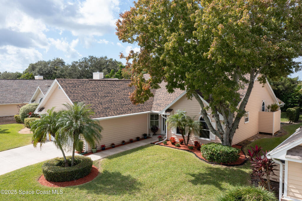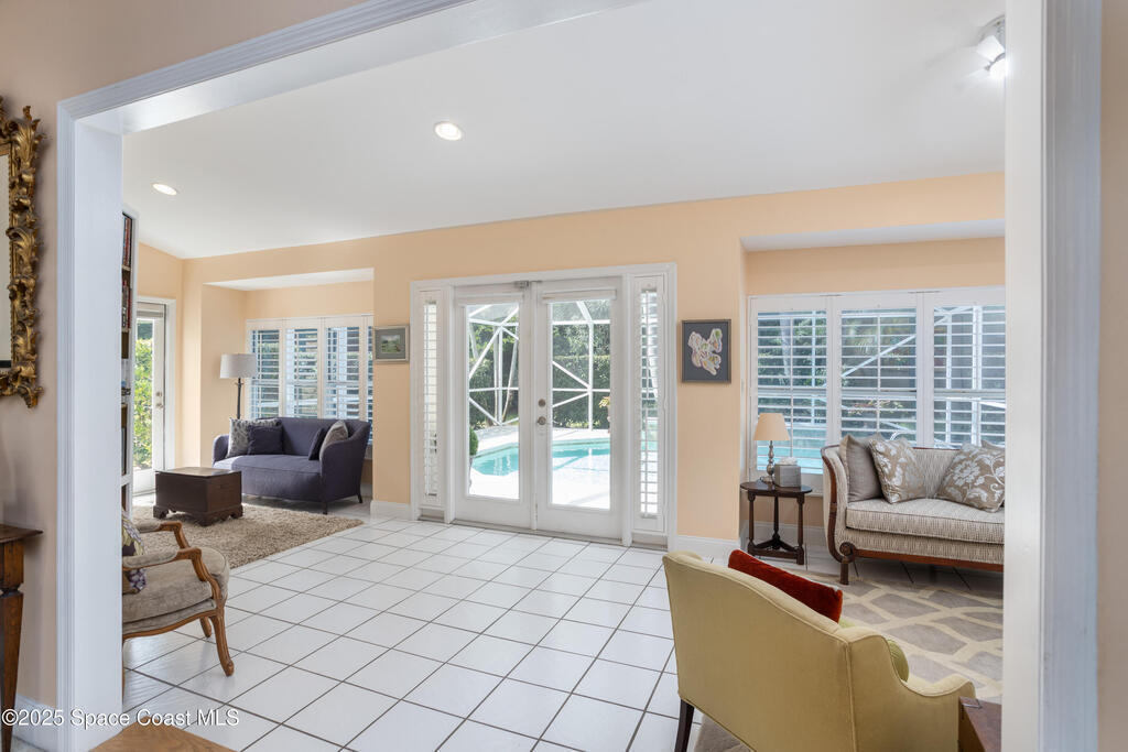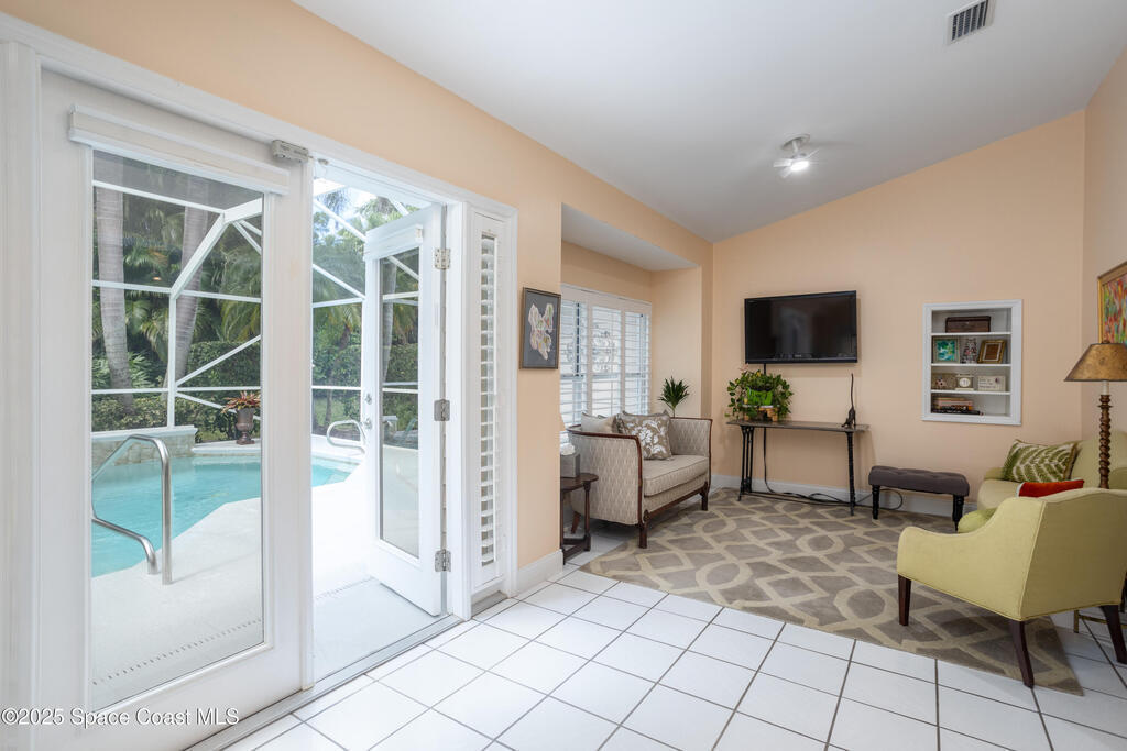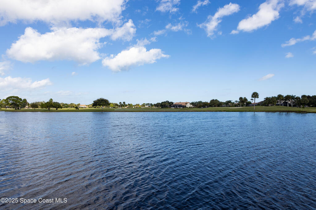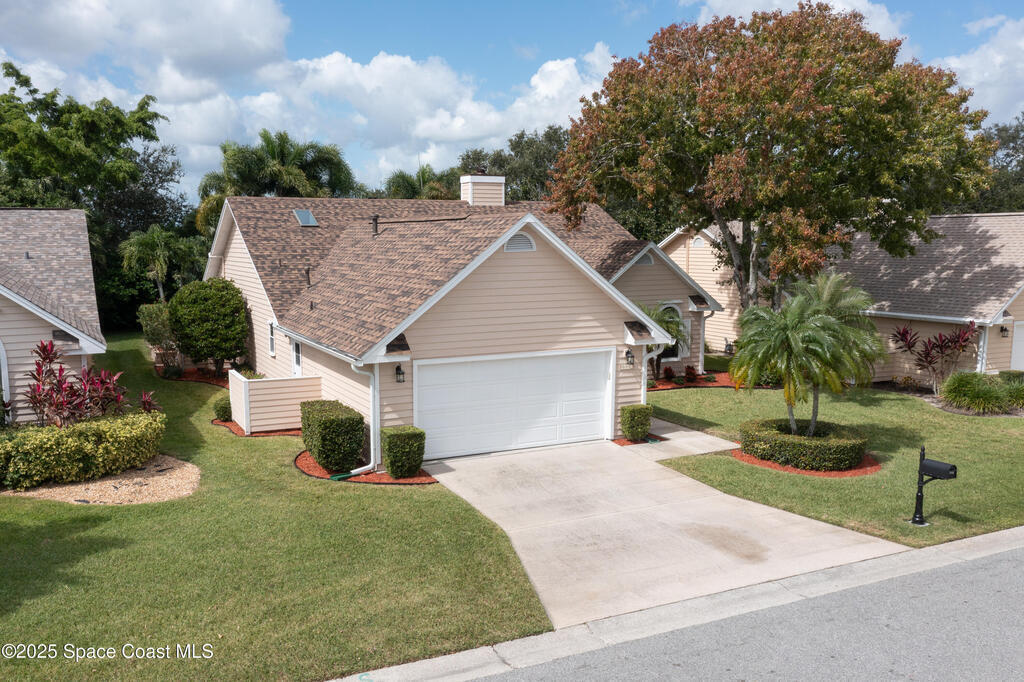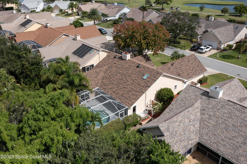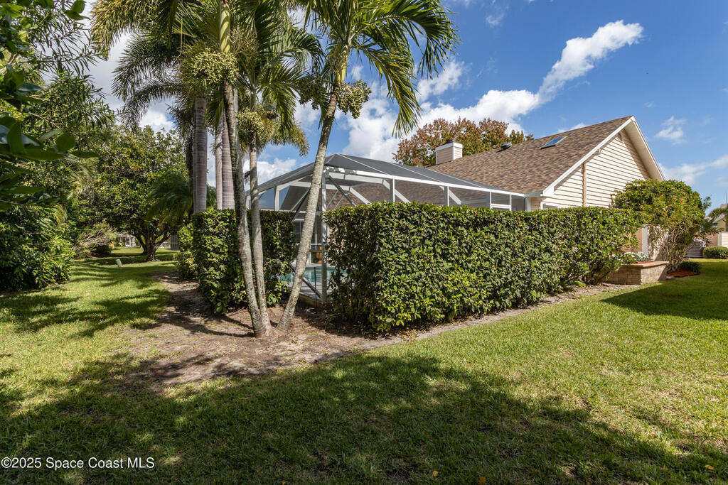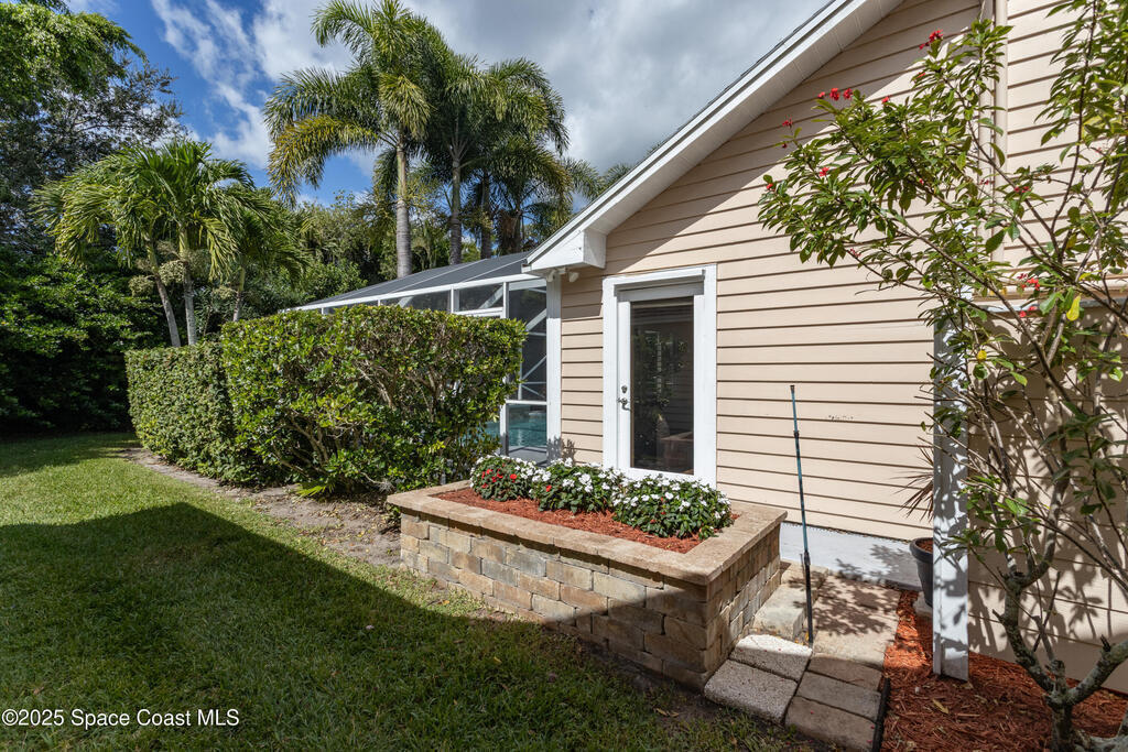 Immaculate pool home just minutes from Suntree Country Club, tucked away in the desirable Augusta Village community. Well maintained, this home features an open floor plan with vaulted ceilings, a spacious eat-in kitchen with skylights and stainless steel appliances, and a formal dining room. The remodeled master suite offers wood laminate flooring, a custom walk-in closet, and a luxurious bath with double vanity, oversized shower with bench, custom shelving, electric bidet, and linen closet. The living room opens to an enclosed lanai with French doors leading to a sparkling pool with waterfall, surrounded by a private, beautifully landscaped yard. Additional highlights include a new roof (2022), plantation shutters, built-in desk in the second bedroom, office/sewing room, and storm shutters. The low HOA includes lawn care, irrigation, landscaping, and access to a lakeside community gazebo. Conveniently located close to beaches, dining, shopping, and top-rated Suntree schools.