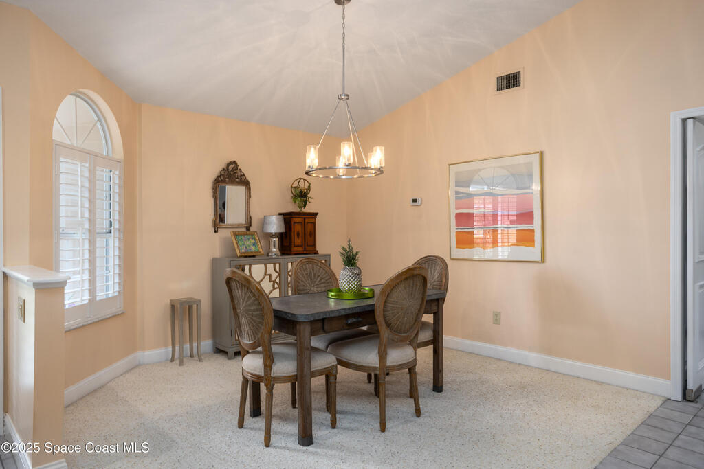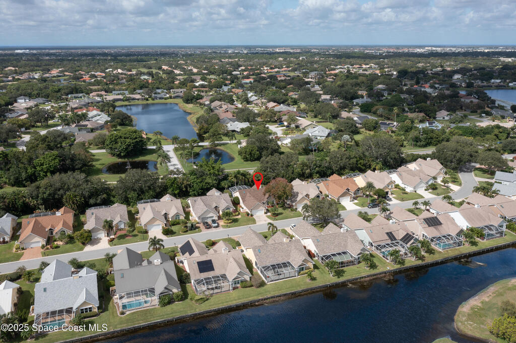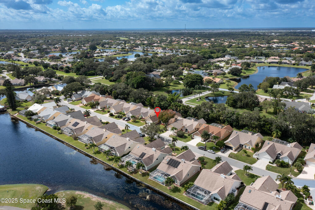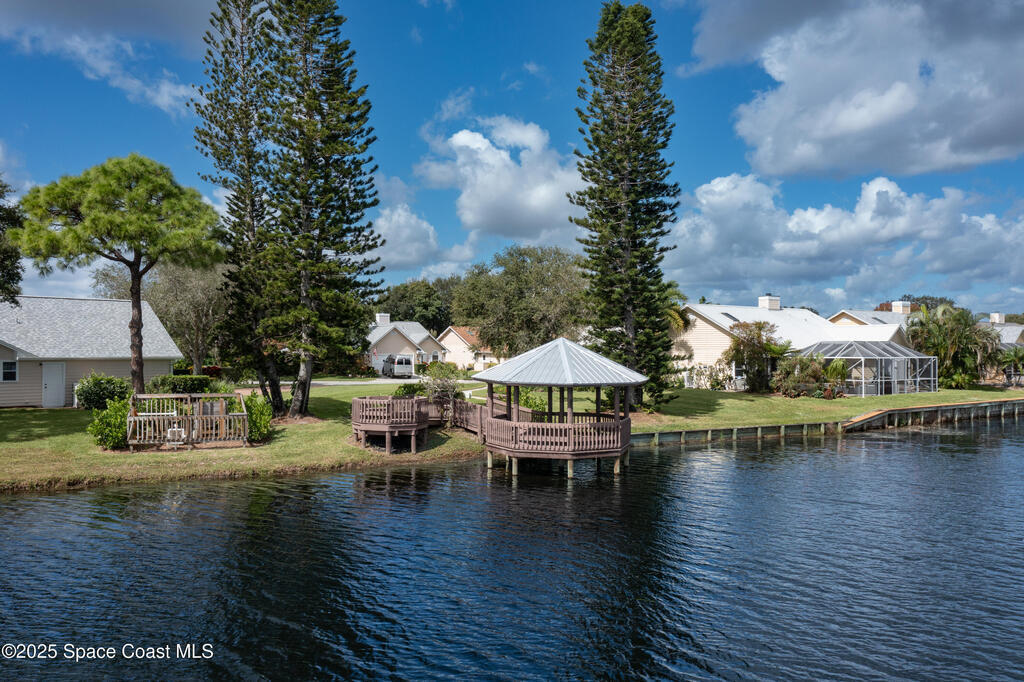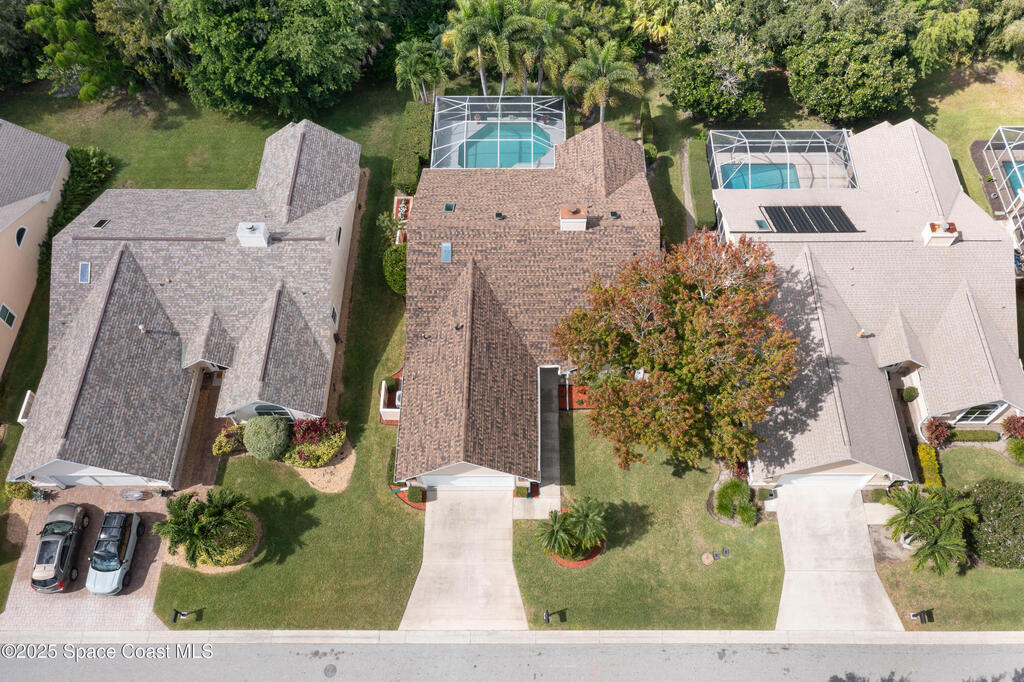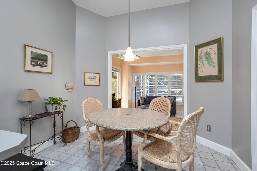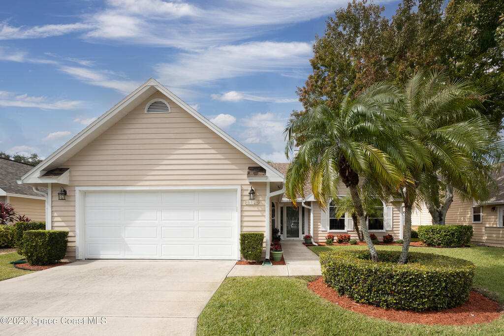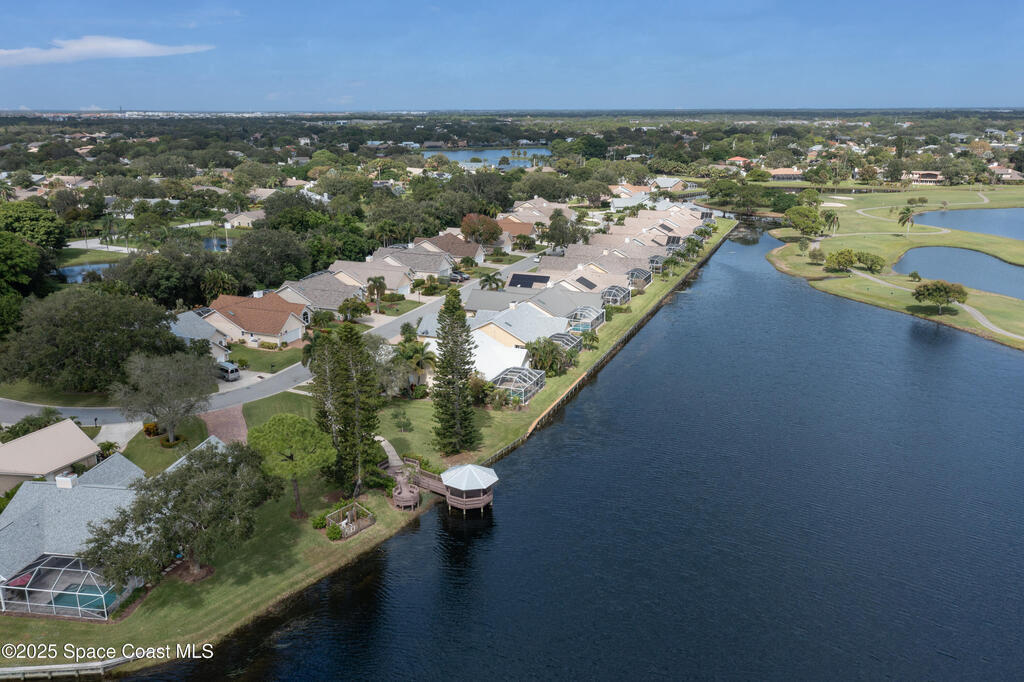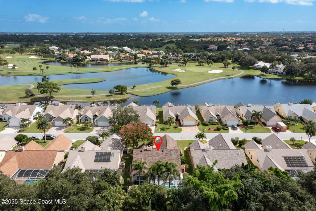 Immaculate pool home just minutes from Suntree Country Club, tucked away in the desirable Augusta Village community. Well maintained, this home features an open floor plan with vaulted ceilings, a spacious eat-in kitchen with skylights and stainless steel appliances, and a formal dining room. The remodeled master suite offers wood laminate flooring, a custom walk-in closet, and a luxurious bath with double vanity, oversized shower with bench, custom shelving, electric bidet, and linen closet. The living room opens to an enclosed lanai with French doors leading to a sparkling pool with waterfall, surrounded by a private, beautifully landscaped yard. Additional highlights include a new roof (2022), plantation shutters, built-in desk in the second bedroom, office/sewing room, and storm shutters. The low HOA includes lawn care, irrigation, landscaping, and access to a lakeside community gazebo. Conveniently located close to beaches, dining, shopping, and top-rated Suntree schools.