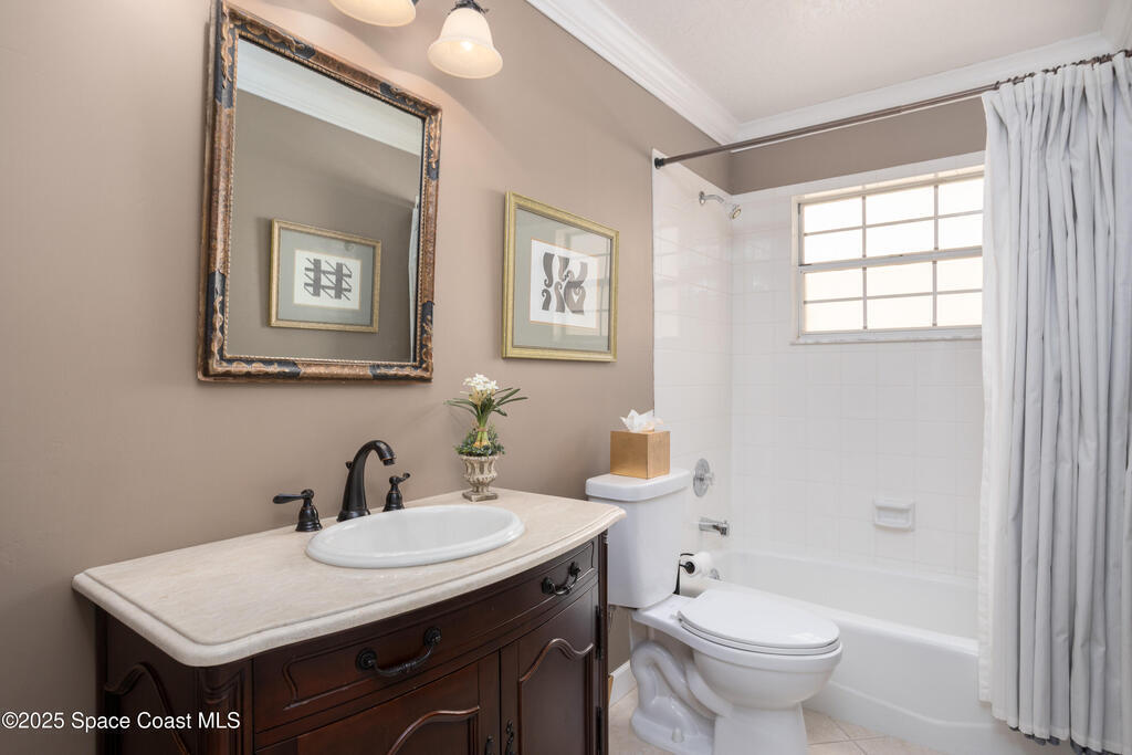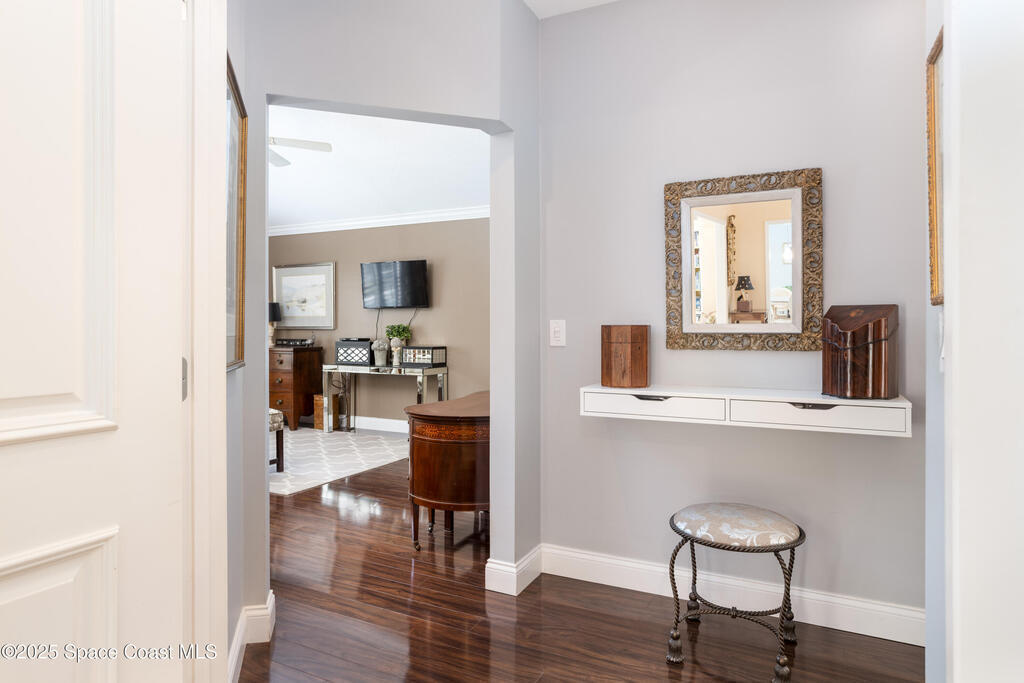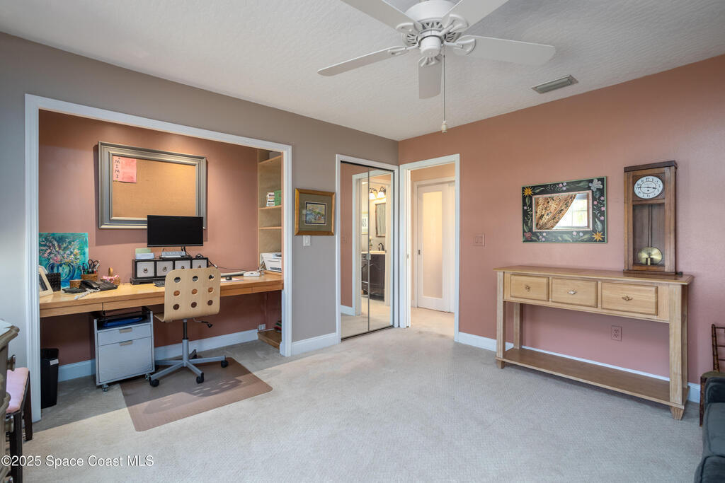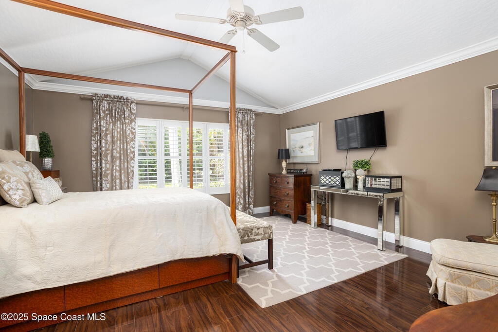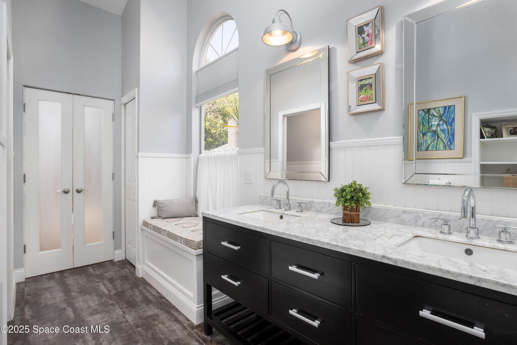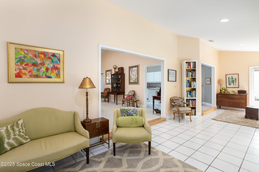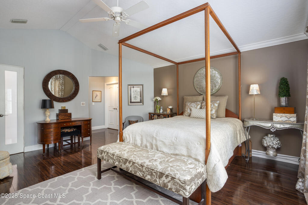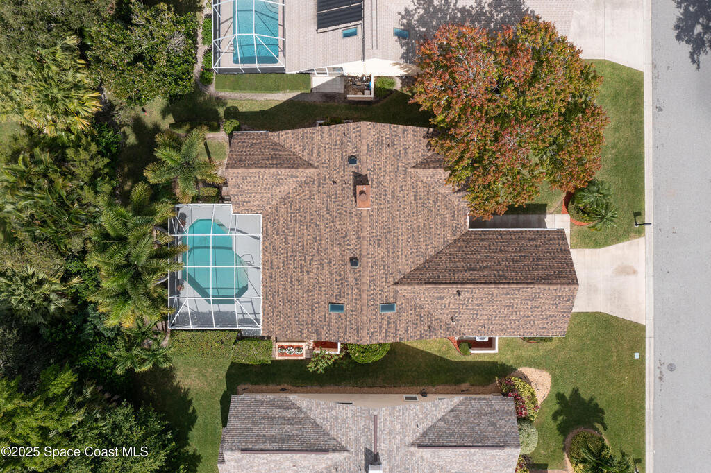 Immaculate pool home just minutes from Suntree Country Club, tucked away in the desirable Augusta Village community. Well maintained, this home features an open floor plan with vaulted ceilings, a spacious eat-in kitchen with skylights and stainless steel appliances, and a formal dining room. The remodeled master suite offers wood laminate flooring, a custom walk-in closet, and a luxurious bath with double vanity, oversized shower with bench, custom shelving, electric bidet, and linen closet. The living room opens to an enclosed lanai with French doors leading to a sparkling pool with waterfall, surrounded by a private, beautifully landscaped yard. Additional highlights include a new roof (2022), plantation shutters, built-in desk in the second bedroom, office/sewing room, and storm shutters. The low HOA includes lawn care, irrigation, landscaping, and access to a lakeside community gazebo. Conveniently located close to beaches, dining, shopping, and top-rated Suntree schools.