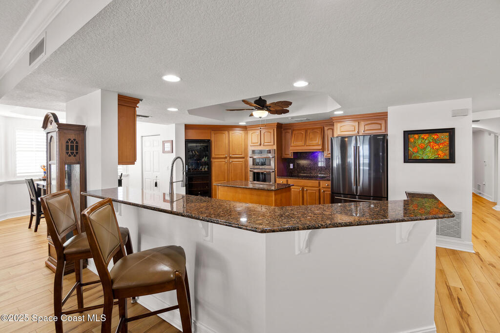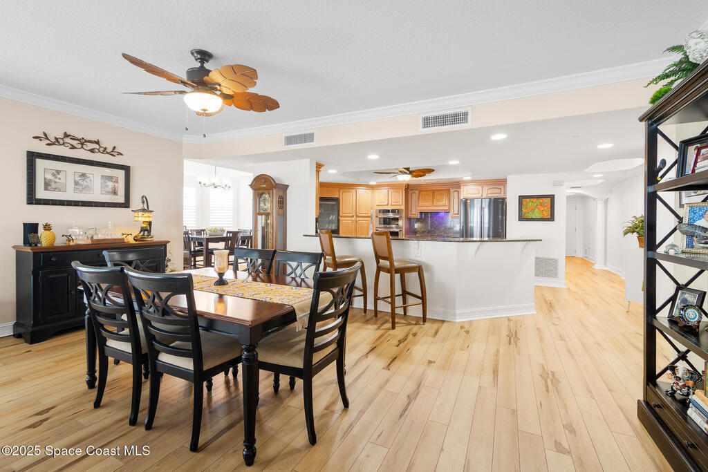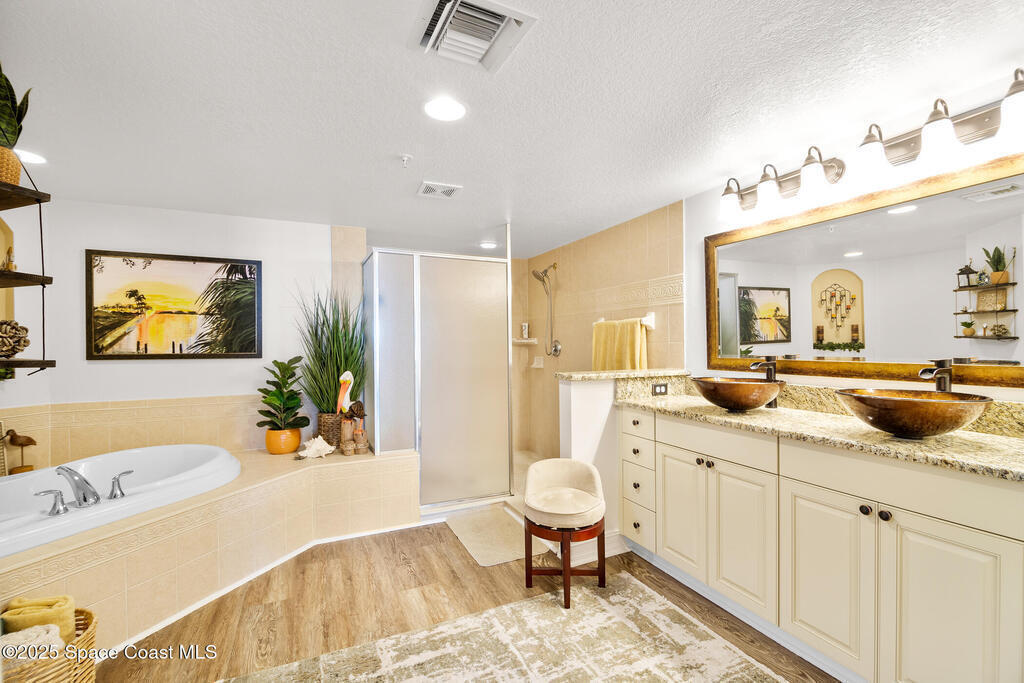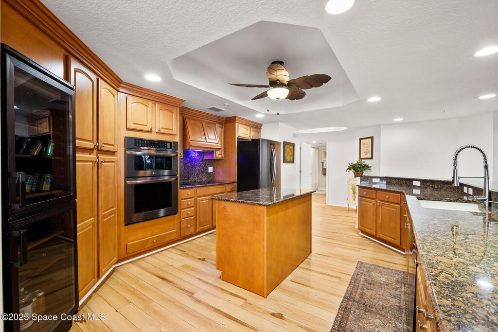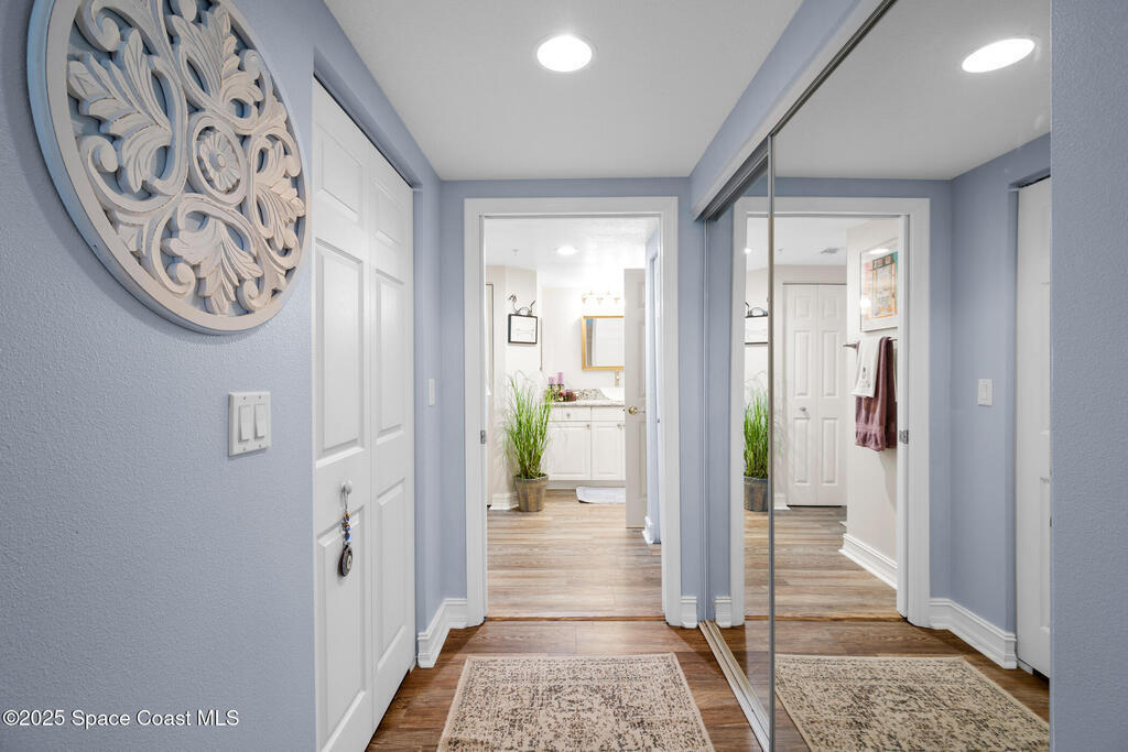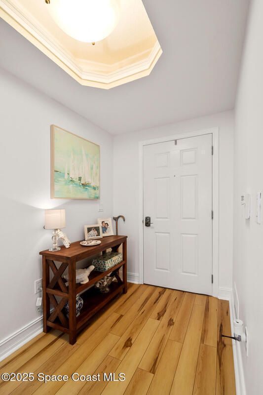 This stunning corner condominium with expansive wraparound balcony offers expansive views of the intracoastal waterway, captivating sunrises, and thrilling rocket launches from your 5th-floor corner unit in the highly sought-after Whitley Bay West. This beautifully updated condo features luxury vinyl plank flooring throughout, fresh paint, and upgrades, including new stainless steel LG dual wall oven with convection/microwave, new refrigerator, kitchen wine cooler, new LG stackable washer/dryer with steam feature, new granite vanities and upgraded toilets (including bidet), upgraded ceiling fans throughout including balcony, new AC units, fresh paint, new Bahama shutters & tastefully upgraded lighting fixtures. Enjoy the ultimate in waterfront living while being next to vibrant Cocoa Village, offering theaters, restaurants, coffee shops, and year-round events. Enjoy access to luxury community amenities, including a pool, jacuzzi, fitness center and club room.